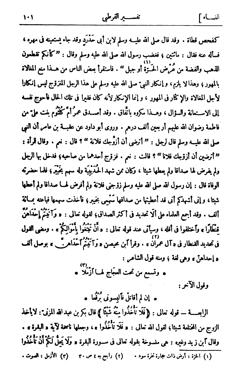 كَمَفْحَصِ قَطَاةٍ. وَقَدْ قَالَ صَلَّى اللَّهُ عَلَيْهِ وَسَلَّمَ لِابْنِ أَبِي حَدْرَدٍ وَقَدْ جَاءَ يَسْتَعِينُهُ فِي مَهْرِهِ، فَسَأَلَهُ عَنْهُ فَقَالَ: مِائَتَيْنِ، فَغَضِبَ رَسُولُ اللَّهِ صَلَّى اللَّهُ عَلَيْهِ وَسَلَّمَ وَقَالَ: (كَأَنَّكُمْ تَقْطَعُونَ الذَّهَبَ وَالْفِضَّةَ مِنْ عُرْضِ الْحَرَّةِ «١» أَوْ جَبَلٍ). فَاسْتَقْرَأَ بَعْضُ النَّاسِ مِنْ هَذَا مَنْعَ الْمُغَالَاةِ بِالْمُهُورِ، وَهَذَا لَا يَلْزَمُ، وَإِنْكَارُ النَّبِيِّ صَلَّى اللَّهُ عَلَيْهِ وَسَلَّمَ عَلَى هَذَا الرَّجُلِ الْمُتَزَوِّجِ لَيْسَ إِنْكَارًا لِأَجْلِ الْمُغَالَاةِ وَالْإِكْثَارِ فِي الْمُهُورِ، وَإِنَّمَا الْإِنْكَارُ لِأَنَّهُ كَانَ فَقِيرًا فِي تِلْكَ الْحَالِ فَأَحْوَجَ نَفْسَهُ إِلَى الِاسْتِعَانَةِ وَالسُّؤَالِ، وَهَذَا مَكْرُوهٌ بِاتِّفَاقٍ. وَقَدْ أَصْدَقَ عُمَرُ أُمَّ كُلْثُومٍ بِنْتَ عَلِيٍّ مِنْ فَاطِمَةَ رِضْوَانُ اللَّهِ عَلَيْهِمْ أَرْبَعِينَ أَلْفَ دِرْهَمٍ. وَرَوَى أَبُو دَاوُدَ عَنْ عُقْبَةَ بْنِ عَامِرٍ أَنَّ النَّبِيَّ صَلَّى اللَّهُ عَلَيْهِ وَسَلَّمَ قَالَ لِرَجُلٍ: (أَتَرْضَى أَنْ أُزَوِّجَكَ فُلَانَةً)؟ قَالَ: نَعَمْ. وَقَالَ لِلْمَرْأَةِ: (أَتَرْضَيْنَ أَنْ أُزَوِّجَكِ فُلَانًا)؟ قَالَتْ: نَعَمْ. فَزَوَّجَ أحدهما من صاحب، فَدَخَلَ بِهَا الرَّجُلُ وَلَمْ يَفْرِضْ لَهَا صَدَاقًا وَلَمْ يُعْطِهَا شَيْئًا، وَكَانَ مِمَّنْ شَهِدَ الْحُدَيْبِيَةَ وَلَهُ سَهْمٌ بِخَيْبَرَ، فَلَمَّا حَضَرَتْهُ الْوَفَاةُ قَالَ: إِنَّ رَسُولَ اللَّهِ صَلَّى اللَّهُ عَلَيْهِ وَسَلَّمَ زَوَّجَنِي فُلَانَةً وَلَمْ أَفْرِضْ لَهَا صَدَاقًا وَلَمْ أُعْطِهَا شَيْئًا، وَإِنِّي أُشْهِدُكُمْ أَنِّي قَدْ أَعْطَيْتُهَا مِنْ صَدَاقِهَا سَهْمِي بِخَيْبَرَ، فَأَخَذَتْ سَهْمَهَا فَبَاعَتْهُ بِمِائَةِ أَلْفٍ. وَقَدْ أَجْمَعَ الْعُلَمَاءُ عَلَى أَلَّا تَحْدِيدَ فِي أَكْثَرِ الصَّدَاقِ، لِقَوْلِهِ تَعَالَى: (وَآتَيْتُمْ إِحْداهُنَّ قِنْطاراً) وَاخْتَلَفُوا فِي أَقَلِّهِ، وَسَيَأْتِي عِنْدَ قَوْلِهِ تَعَالَى: (أَنْ تَبْتَغُوا بِأَمْوالِكُمْ). وَمَضَى الْقَوْلُ فِي تَحْدِيدِ الْقِنْطَارِ فِي (آلِ عِمْرَانَ «٢»). وَقَرَأَ ابْنُ مُحَيْصِنٍ (وَآتَيْتُمْ إِحْدَاهُنَّ) بِوَصْلِ أَلِفِ (إِحْداهُنَّ) وَهِيَ لُغَةٌ، وَمِنْهُ قَوْلُ الشَّاعِرِ: