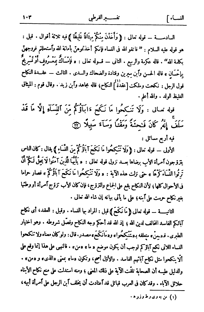 فِيهِ أَرْبَعُ مَسَائِلَ: الْأُولَى- قَوْلُهُ تَعَالَى: (وَلا تَنْكِحُوا مَا نَكَحَ آباؤُكُمْ مِنَ النِّساءِ) يُقَالُ: كَانَ النَّاسُ يَتَزَوَّجُونَ امْرَأَةَ الْأَبِ بِرِضَاهَا بَعْدَ نُزُولِ قَوْلُهُ تَعَالَى: (يَا أَيُّهَا الَّذِينَ آمَنُوا لَا يَحِلُّ لَكُمْ أَنْ تَرِثُوا النِّساءَ كَرْهاً) حَتَّى نَزَلَتْ هَذِهِ الْآيَةُ: (وَلا تَنْكِحُوا مَا نَكَحَ آباؤُكُمْ) فَصَارَ حَرَامًا فِي الْأَحْوَالِ كُلِّهَا، لِأَنَّ النِّكَاحَ يَقَعُ عَلَى الْجِمَاعِ وَالتَّزَوُّجِ، فَإِنْ كَانَ الْأَبُ تَزَوَّجَ امْرَأَةً أَوْ وَطِئَهَا بِغَيْرِ نِكَاحٍ حَرُمَتْ عَلَى ابْنِهِ، عَلَى مَا يَأْتِي بَيَانُهُ إِنْ شَاءَ اللَّهُ تَعَالَى. الثَّانِيةُ- قَوْلُهُ تَعَالَى: (مَا نَكَحَ) قِيلَ: الْمُرَادُ بِهَا النِّسَاءُ. وَقِيلَ: الْعَقْدُ، أَيْ نِكَاحُ آبَائِكُمُ الْفَاسِدُ الْمُخَالِفُ لِدِينِ اللَّهِ، إِذِ اللَّهُ قَدْ أَحْكَمَ وَجْهَ النِّكَاحِ وَفَصَّلَ شُرُوطَهُ. وَهُوَ اخْتِيَارُ الطَّبَرِيِّ. فَ (مِنَ) مُتَعَلِّقَةٌ بِ (تَنْكِحُوا) وَ (مَا نَكَحَ) مَصْدَرٌ. قَالَ: وَلَوْ كَانَ مَعْنَاهُ وَلَا تَنْكِحُوا النِّسَاءَ اللَّاتِي نَكَحَ آبَاؤُكُمْ لَوَجَبَ أَنْ يَكُونَ مَوْضِعُ (مَا) (مَنْ). فَالنَّهْيُ عَلَى هَذَا إِنَّمَا وَقَعَ عَلَى أَلَّا يَنْكِحُوا مِثْلَ نِكَاحِ آبَائِهِمُ الْفَاسِدِ. وَالْأَوَّلُ أَصَحُّ، وَتَكُونُ (مَا) بِمَعْنَى (الَّذِي) وَ (مَنْ). وَالدَّلِيلُ عَلَيْهِ أَنَّ الصَّحَابَةَ تَلَقَّتِ الْآيَةَ عَلَى ذَلِكَ الْمَعْنَى، وَمِنْهُ اسْتَدَلَّتْ عَلَى مَنْعِ نِكَاحِ الْأَبْنَاءِ حَلَائِلَ الْآبَاءِ. وَقَدْ كَانَ فِي الْعَرَبِ قَبَائِلُ قَدِ اعْتَادَتْ أَنْ يَخْلُفَ ابْنُ الرَّجُلِ عَلَى امْرَأَةِ أبيه،