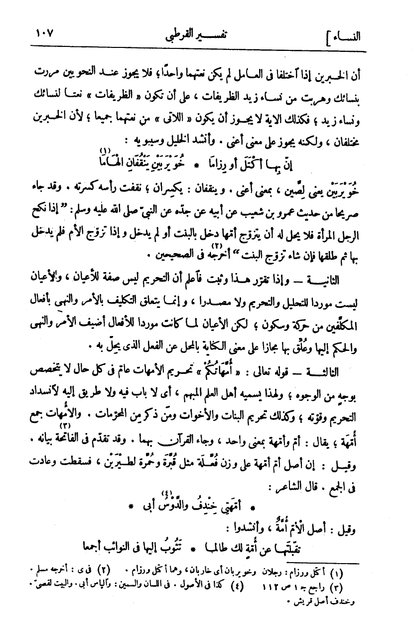 خُوَيْرَبَيْنِ يَعْنِي لِصَّيْنِ، بِمَعْنَى أَعْنِي. وَيَنْقُفَانِ: يَكْسِرَانِ، نَقَفْتُ رَأْسَهُ كَسَرْتُهُ. وَقَدْ جَاءَ صَرِيحًا مِنْ حَدِيثِ عَمْرِو بْنِ شُعَيْبٍ عَنْ أَبِيهِ عَنْ جَدِّهِ عَنِ النَّبِيِّ صَلَّى اللَّهُ عَلَيْهِ وَسَلَّمَ: (إِذَا نَكَحَ الرَّجُلُ الْمَرْأَةَ فَلَا يَحِلُّ لَهُ أَنْ يَتَزَوَّجَ أُمَّهَا دَخَلَ بِالْبِنْتِ أَوْ لَمْ يَدْخُلْ وَإِذَا تَزَوَّجَ الْأُمَّ فَلَمْ يَدْخُلْ بِهَا ثُمَّ طَلَّقَهَا فَإِنْ شَاءَ تَزَوَّجَ الْبِنْتَ) أَخْرَجَهُ «٢» فِي الصَّحِيحَيْنِ الثَّانِيةُ- وَإِذَا تَقَرَّرَ هَذَا وَثَبَتَ فَاعْلَمْ أَنَّ التَّحْرِيمَ لَيْسَ صِفَةً لِلْأَعْيَانِ، وَالْأَعْيَانُ لَيْسَتْ مَوْرِدًا لِلتَّحْلِيلِ وَالتَّحْرِيمِ وَلَا مَصْدَرًا، وَإِنَّمَا يَتَعَلَّقُ التَّكْلِيفُ بِالْأَمْرِ وَالنَّهْيِ بِأَفْعَالِ الْمُكَلَّفِينَ مِنْ حَرَكَةٍ وَسُكُونٍ، لَكِنَّ الْأَعْيَانَ لَمَّا كَانَتْ مَوْرِدًا لِلْأَفْعَالِ أُضِيفَ الْأَمْرُ وَالنَّهْيُ وَالْحُكْمُ إِلَيْهَا وَعُلِّقَ بِهَا مَجَازًا عَلَى مَعْنَى الْكِنَايَةِ بِالْمَحَلِّ عَنِ الْفِعْلِ الَّذِي يَحِلُّ بِهِ. الثَّالِثَةُ- قَوْلُهُ تَعَالَى: (أُمَّهاتُكُمْ) تَحْرِيمُ الْأُمَّهَاتِ عَامٌّ فِي كُلِّ حَالٍ لَا يَتَخَصَّصُ بِوَجْهٍ مِنَ الْوُجُوهِ، وَلِهَذَا يُسَمِّيهِ أَهْلُ الْعِلْمِ الْمُبْهَمُ، أَيْ لَا بَابَ فِيهِ وَلَا طَرِيقَ إِلَيْهِ لِانْسِدَادِ التَّحْرِيمِ وَقُوَّتِهِ، وَكَذَلِكَ تَحْرِيمُ الْبَنَاتِ وَالْأَخَوَاتِ وَمَنْ ذُكِرَ مِنَ الْمُحَرَّمَاتِ. وَالْأُمَّهَاتُ جَمْعُ أُمَّهَةٍ، يُقَالُ: أُمٌّ وَأُمَّهَةٌ بِمَعْنًى وَاحِدٍ، وَجَاءَ الْقُرْآنُ بِهِمَا. وَقَدْ تَقَدَّمَ فِي الْفَاتِحَةِ «٣» بَيَانُهُ. وَقِيلَ: إِنَّ أَصْلَ أُمٍّ أُمَّهَةٌ عَلَى وَزْنِ فُعَّلَةٍ مِثْلَ قُبَّرَةٍ وَحُمَّرَةٍ لِطَيْرَيْنِ، فَسَقَطَتْ وَعَادَتْ فِي الْجَمْعِ. قَالَ الشَّاعِرُ: