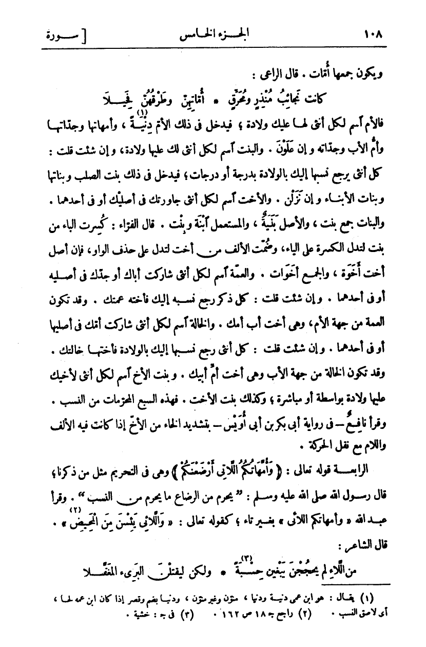 فَالْأُمُّ اسْمٌ لِكُلِّ أُنْثَى لَهَا عَلَيْكَ وِلَادَةٌ، فَيَدْخُلُ فِي ذَلِكَ الْأُمُّ دِنْيَةً «١»، وَأُمَّهَاتُهَا وَجَدَّاتُهَا وَأُمُّ الْأَبِ وَجَدَّاتُهُ وَإِنْ عَلَوْنَ. وَالْبِنْتُ اسْمٌ لِكُلِّ أُنْثَى لَكَ عَلَيْهَا وِلَادَةٌ، وَإِنْ شِئْتَ قُلْتَ: كُلُّ أُنْثَى يَرْجِعُ نَسَبُهَا إِلَيْكَ بِالْوِلَادَةِ بِدَرَجَةٍ أَوْ دَرَجَاتٍ، فَيَدْخُلُ فِي ذَلِكَ بِنْتُ الصُّلْبِ وَبَنَاتُهَا وَبَنَاتُ الْأَبْنَاءِ وَإِنْ نَزَلْنَ. وَالْأُخْتُ اسْمٌ لِكُلِّ أُنْثَى جَاوَرَتْكَ فِي أَصْلَيْكَ أَوْ فِي أَحَدِهِمَا. وَالْبَنَاتُ جَمْعُ بِنْتٍ، وَالْأَصْلُ بُنَيَّةٌ، وَالْمُسْتَعْمَلُ ابْنَةٌ وَبِنْتٌ. قَالَ الْفَرَّاءُ: كُسِرَتِ الْبَاءُ مِنْ بِنْتٍ لِتَدُلَّ الْكَسْرَةُ عَلَى الْيَاءِ، وَضُمَّتِ الْأَلِفُ مِنْ أُخْتٍ لِتَدُلَّ عَلَى حَذْفِ الْوَاوِ، فَإِنَّ أَصْلَ أُخْتٍ أَخَوَةٌ، وَالْجَمْعُ أَخَوَاتٌ. وَالْعَمَّةُ اسْمٌ لِكُلِّ أُنْثَى شَارَكَتْ أَبَاكَ أَوْ جَدَّكَ فِي أَصْلَيْهِ أَوْ فِي أَحَدِهِمَا. وَإِنْ شِئْتَ قُلْتَ: كُلُّ ذَكَرٍ رَجَعَ نَسَبُهُ إِلَيْكَ فَأُخْتُهُ عَمَّتُكَ. وَقَدْ تَكُونُ الْعَمَّةُ مِنْ جِهَةِ الْأُمِّ، وَهِيَ أُخْتُ أَبِ أُمِّكَ. وَالْخَالَةُ اسْمٌ لِكُلِّ أُنْثَى شَارَكَتْ أُمَّكَ فِي أَصْلَيْهَا أَوْ فِي أَحَدِهِمَا. وَإِنْ شِئْتَ قُلْتَ: كُلُّ أُنْثَى رَجَعَ نَسَبُهَا إِلَيْكَ بِالْوِلَادَةِ فَأُخْتُهَا خَالَتُكَ. وَقَدْ تَكُونُ الْخَالَةُ مِنْ جِهَةِ الْأَبِ وَهِيَ أُخْتُ أُمِّ أَبِيكَ. وَبِنْتُ الْأَخِ اسْمٌ لِكُلِّ أُنْثَى لِأَخِيكَ عَلَيْهَا وِلَادَةٌ بِوَاسِطَةٍ أَوْ مُبَاشَرَةً، وَكَذَلِكَ بِنْتُ الْأُخْتِ. فَهَذِهِ السَّبْعُ الْمُحَرَّمَاتُ مِنَ النَّسَبِ. وَقَرَأَ نَافِعٌ- فِي رِوَايَةِ أَبِي بَكْرِ بْنِ أَبِي أُوَيْسٍ- بِتَشْدِيدِ الْخَاءِ مِنَ الْأَخِ إِذَا كَانَتْ فِيهِ الْأَلِفُ وَاللَّامُ مَعَ نَقْلِ الْحَرَكَةِ. الرَّابِعَةُ قَوْلُهُ تَعَالَى: (وَأُمَّهاتُكُمُ اللَّاتِي أَرْضَعْنَكُمْ) وَهِيَ فِي التَّحْرِيمِ مِثْلُ مَنْ ذَكَرْنَا، قَالَ رَسُولُ اللَّهِ صَلَّى اللَّهُ عَلَيْهِ وَسَلَّمَ: (يَحْرُمُ مِنَ الرَّضَاعِ مَا يَحْرُمُ مِنَ النَّسَبِ). وَقَرَأَ عَبْدُ اللَّهِ (وَأُمَّهَاتُكُمُ اللَّائِي) بِغَيْرِ تَاءٍ، كَقَوْلِهِ تَعَالَى: (وَاللَّائِي يَئِسْنَ مِنَ الْمَحِيضِ «٢»). قَالَ الشَّاعِرُ: