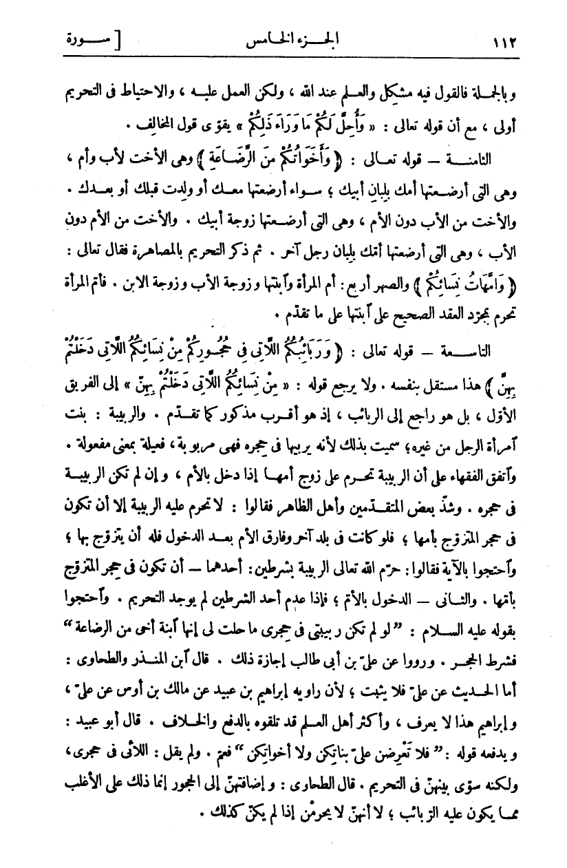 وَبِالْجُمْلَةِ فَالْقَوْلُ فِيهِ مُشْكِلٌ وَالْعِلْمُ عِنْدَ اللَّهِ، وَلَكِنَّ الْعَمَلَ عَلَيْهِ، وَالِاحْتِيَاطَ فِي التَّحْرِيمِ أَوْلَى، مَعَ أَنَّ قَوْلَهُ تَعَالَى: (وَأُحِلَّ لَكُمْ مَا وَراءَ ذلِكُمْ) يُقَوِّي قَوْلَ الْمُخَالِفِ. الثَّامِنَةُ- قَوْلُهُ تَعَالَى: (وَأَخَواتُكُمْ مِنَ الرَّضاعَةِ) وَهِيَ الْأُخْتُ لِأَبٍ وَأُمٍّ، وَهِيَ الَّتِي أَرْضَعَتْهَا أُمُّكَ بِلِبَانِ أَبِيكَ، سَوَاءً أَرْضَعَتْهَا مَعَكَ أَوْ وُلِدَتْ قَبْلَكَ أَوْ بَعْدَكَ. وَالْأُخْتُ مِنَ الْأَبِ دُونَ الْأُمِّ، وَهِيَ الَّتِي أَرْضَعَتْهَا زَوْجَةُ أَبِيكَ. وَالْأُخْتُ مِنَ الْأُمِّ دُونَ الْأَبِ، وَهِيَ الَّتِي أَرْضَعَتْهَا أُمُّكَ بِلِبَانِ رَجُلٍ آخَرَ. ثُمَّ ذَكَرَ التَّحْرِيمَ بِالْمُصَاهَرَةِ فَقَالَ تَعَالَى: (وَأُمَّهاتُ نِسائِكُمْ) وَالصِّهْرُ أَرْبَعٌ: أُمُّ الْمَرْأَةِ وَابْنَتُهَا وَزَوْجَةُ الْأَبِ وَزَوْجَةُ الِابْنِ. فَأُمُّ الْمَرْأَةِ تَحْرُمُ بِمُجَرَّدِ الْعَقْدِ الصَّحِيحِ عَلَى ابْنَتِهَا عَلَى مَا تَقَدَّمَ التَّاسِعَةُ- قَوْلَهُ تَعَالَى: (وَرَبائِبُكُمُ اللَّاتِي فِي حُجُورِكُمْ مِنْ نِسائِكُمُ اللَّاتِي دَخَلْتُمْ بِهِنَّ) هَذَا مُسْتَقِلٌّ بِنَفْسِهِ. وَلَا يَرْجِعُ قَوْلُهُ: (مِنْ نِسائِكُمُ اللَّاتِي دَخَلْتُمْ بِهِنَّ) إِلَى الْفَرِيقِ الْأَوَّلِ، بَلْ هُوَ رَاجِعٌ إِلَى الرَّبَائِبِ، إِذْ هُوَ أَقْرَبُ مَذْكُورٍ كَمَا تَقَدَّمَ. وَالرَّبِيبَةُ: بِنْتُ امْرَأَةِ الرَّجُلِ مِنْ غَيْرِهِ، سُمِّيَتْ بِذَلِكَ لِأَنَّهُ يُرَبِّيهَا فِي حِجْرِهِ فَهِيَ مَرْبُوبَةٌ، فَعِيلَةٌ بِمَعْنَى مَفْعُولَةٍ. وَاتَّفَقَ الْفُقَهَاءُ عَلَى أَنَّ الرَّبِيبَةَ تَحْرُمُ عَلَى زَوْجِ أُمِّهَا إِذَا دَخَلَ بِالْأُمِّ، وَإِنْ لَمْ تَكُنِ الرَّبِيبَةُ فِي حِجْرِهِ. وَشَذَّ بَعْضُ الْمُتَقَدِّمِينَ وَأَهْلُ الظَّاهِرِ فَقَالُوا: لَا تَحْرُمُ عَلَيْهِ الرَّبِيبَةُ إِلَّا أَنْ تَكُونَ فِي حِجْرِ الْمُتَزَوِّجِ بِأُمِّهَا، فَلَوْ كَانَتْ فِي بَلَدٍ آخَرَ وَفَارَقَ الْأُمَّ بَعْدَ الدُّخُولِ فَلَهُ أَنْ يَتَزَوَّجَ بِهَا، وَاحْتَجُّوا بِالْآيَةِ فَقَالُوا: حَرَّمَ اللَّهُ تَعَالَى الرَّبِيبَةَ بِشَرْطَيْنِ: أَحَدُهُمَا: أَنْ تَكُونَ فِي حِجْرِ الْمُتَزَوِّجِ بِأُمِّهَا. وَالثَّانِي- الدُّخُولُ بِالْأُمِّ، فَإِذَا عُدِمَ أَحَدُ الشَّرْطَيْنِ لَمْ يُوجَدِ التَّحْرِيمُ. وَاحْتَجُّوا بِقَوْلِهِ عَلَيْهِ السَّلَامُ: (لَوْ لَمْ تَكُنْ رَبِيبَتِي فِي حِجْرِي مَا حَلَّتْ لِي إِنَّهَا ابْنَةُ أَخِي مِنَ الرَّضَاعَةِ) فَشَرَطَ الْحِجْرَ. وَرَوَوْا عَنْ عَلِيِّ بْنِ أَبِي طَالِبٍ إِجَازَةَ ذَلِكَ. قَالَ ابْنُ الْمُنْذِرِ وَالطَّحَاوِيُّ: أَمَّا الْحَدِيثُ عَنْ عَلِيٍّ فَلَا يَثْبُتُ، لِأَنَّ رَاوِيَهُ إِبْرَاهِيمُ بْنُ عُبَيْدٍ عَنْ مَالِكِ بْنِ أوس عن علي، وإبراهيم هذا يُعْرَفُ، وَأَكْثَرُ أَهْلِ الْعِلْمِ قَدْ تَلَقَّوْهُ بِالدَّفْعِ وَالْخِلَافِ. قَالَ أَبُو عُبَيْدٍ: وَيَدْفَعُهُ قَوْلُهُ: (فَلَا تَعْرِضَنَّ عَلَيَّ بَنَاتِكُنَّ وَلَا أَخَوَاتِكُنَّ) فَعَمَّ. وَلَمْ يَقُلِ: اللَّائِي فِي حِجْرِي، وَلَكِنَّهُ سَوَّى