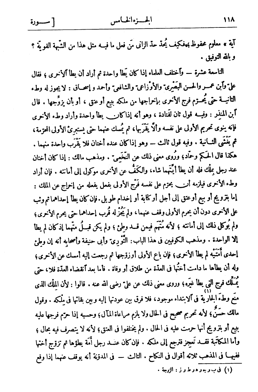 آيَةٌ) مَعْلُومٌ مَحْفُوظٌ، فَكَيْفَ يُحَدُّ حَدَّ الزَّانِي مَنْ فَعَلَ مَا فِيهِ مِثْلَ هَذَا مِنَ الشُّبْهَةِ الْقَوِيَّةِ؟ وَبِاللَّهِ التَّوْفِيقُ. التَّاسِعَةُ عَشْرَةَ- وَاخْتَلَفَ الْعُلَمَاءُ إِذَا كَانَ يَطَأُ وَاحِدَةً ثُمَّ أَرَادَ أَنْ يَطَأَ الْأُخْرَى، فَقَالَ عَلِيٌّ وَابْنُ عُمَرَ وَالْحَسَنُ الْبَصْرِيُّ وَالْأَوْزَاعِيُّ وَالشَّافِعِيُّ وَأَحْمَدُ وَإِسْحَاقُ: لَا يجوز له وطئ الثَّانِيةِ حَتَّى يَحْرُمَ فَرْجُ الْأُخْرَى بِإِخْرَاجِهَا مِنْ مِلْكِهِ بِبَيْعٍ أَوْ عِتْقٍ، أَوْ بِأَنْ يُزَوِّجَهَا. قَالَ ابْنُ الْمُنْذِرِ: وَفِيهِ قَوْلٌ ثَانٍ لِقَتَادَةَ، وَهُوَ أَنَّهُ إِذَا كَانَ يَطَأُ وَاحِدَةً وَأَرَادَ وطئ الْأُخْرَى فَإِنَّهُ يَنْوِي تَحْرِيمَ الْأُولَى عَلَى نَفْسِهِ وَأَلَّا يَقْرَبَهَا، ثُمَّ يُمْسِكُ عَنْهُمَا حَتَّى يَسْتَبْرِئَ الْأُولَى الْمُحَرَّمَةَ، ثُمَّ يَغْشَى الثَّانِيةَ. وَفِيهِ قَوْلٌ ثَالِثٌ: وَهُوَ إِذَا كَانَ عِنْدَهُ أُخْتَانِ فَلَا يَقْرَبُ وَاحِدَةً مِنْهُمَا. هَكَذَا قَالَ الْحَكَمُ وَحَمَّادٌ، وَرُوِيَ مَعْنَى ذَلِكَ عَنِ النَّخَعِيِّ. وَمَذْهَبُ مَالِكٍ: إِذَا كَانَ أُخْتَانِ عِنْدَ رَجُلٍ بِمِلْكٍ فَلَهُ أَنْ يَطَأَ أَيَّتَهُمَا شَاءَ، وَالْكَفُّ عَنِ الْأُخْرَى موكول إلى أمانته. فإن أراد وطئ الْأُخْرَى فَيَلْزَمُهُ أَنْ يُحَرِّمَ عَلَى نَفْسِهِ فَرْجَ الْأُولَى بِفِعْلٍ يَفْعَلُهُ مِنْ إِخْرَاجٍ عَنِ الْمِلْكِ: إِمَّا بِتَزْوِيجٍ أَوْ بَيْعٍ أَوْ عِتْقٍ إِلَى أَجَلٍ أَوْ كِتَابَةٍ أَوْ إِخْدَامٍ طَوِيلٍ. فَإِنْ كَانَ يَطَأُ إِحْدَاهُمَا ثُمَّ وَثَبَ عَلَى الْأُخْرَى دُونَ أَنْ يُحَرِّمَ الْأُولَى وُقِفَ عَنْهُمَا، وَلَمْ يَجُزْ لَهُ قُرْبَ إِحْدَاهُمَا حَتَّى يُحَرِّمَ الْأُخْرَى، وَلَمْ يُوَكَّلْ ذَلِكَ إِلَى أَمَانَتِهِ، لِأَنَّهُ مُتَّهَمٌ فِيمَنْ قَدْ وَطِئَ، وَلَمْ يَكُنْ قَبْلُ مُتَّهَمًا إِذْ كَانَ لَمْ يَطَأْ إِلَّا الْوَاحِدَةَ. وَمَذْهَبُ الْكُوفِيِّينَ فِي هَذَا الْبَابِ: الثَّوْرِيِّ وَأَبِي حَنِيفَةَ وَأَصْحَابِهِ أَنَّهُ إِنْ وَطِئَ إِحْدَى أَمَتَيْهِ لَمْ يَطَأِ الْأُخْرَى، فَإِنْ بَاعَ الْأُولَى أَوْ زَوَّجَهَا ثُمَّ رَجَعَتْ إِلَيْهِ أَمْسَكَ عَنِ الْأُخْرَى، وَلَهُ أَنْ يَطَأَهَا مَا دَامَتْ أُخْتُهَا فِي الْعِدَّةِ مِنْ طَلَاقٍ أَوْ وَفَاةٍ: فَأَمَّا بَعْدَ انْقِضَاءِ الْعِدَّةِ فَلَا، حَتَّى يُمَلِّكَ فَرْجَ الَّتِي يَطَأُ غَيْرَهُ، وَرُوِيَ مَعْنَى ذَلِكَ عَنْ عَلِيٍّ رَضِيَ اللَّهُ عَنْهُ. قَالُوا: لِأَنَّ الْمِلْكَ الَّذِي مَنَعَ وطئ الْجَارِيَةِ «١» فِي الِابْتِدَاءِ مَوْجُودٌ، فَلَا فَرْقَ بَيْنَ عَوْدَتِهَا إِلَيْهِ وَبَيْنَ بَقَائِهَا فِي مِلْكِهِ. وَقَوْلُ مَالِكٍ حَسَنٌ، لِأَنَّهُ تَحْرِيمٌ صَحِيحٌ فِي الْحَالِ وَلَا يَلْزَمُ مُرَاعَاةُ الْمَالِ، وَحَسْبُهُ إِذَا حَرُمَ فَرْجُهَا عَلَيْهِ بِبَيْعٍ أَوْ بِتَزْوِيجٍ أَنَّهَا حَرُمَتْ عَلَيْهِ فِي الْحَالِ. وَلَمْ يَخْتَلِفُوا فِي الْعِتْقِ، لِأَنَّهُ لَا يُتَصَرَّفُ فِيهِ بِحَالٍ، وَأَمَّا الْمُكَاتَبَةُ فَقَدْ تَعْجِزُ فَتَرْجِعُ إِلَى مِلْكِهِ. فَإِنْ كَانَ عِنْدَ رَجُلٍ أَمَةً يَطَؤُهَا ثُمَّ تَزَوَّجَ أُخْتَهَا فَفِيهَا فِي الْمَذْهَبِ ثَلَاثَةُ أَقْوَالٍ فِي النِّكَاحِ. الثَّالِثُ- فِي الْمُدَوَّنَةِ أَنَّهُ يُوقَفُ عَنْهُمَا إِذَا وقع