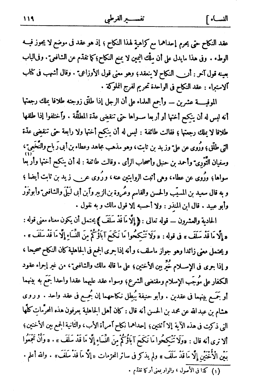عَقْدُ النِّكَاحِ حَتَّى يُحَرِّمَ إِحْدَاهُمَا مَعَ كَرَاهِيَةٍ لِهَذَا النِّكَاحِ، إِذْ هُوَ عَقْدٌ فِي مَوْضِعٍ لا يجوز فيه الوطي. وَفِي هَذَا مَا يَدُلُّ عَلَى أَنَّ مِلْكَ الْيَمِينِ لَا يَمْنَعُ النِّكَاحَ، كَمَا تَقَدَّمَ عَنِ الشَّافِعِيِّ. وَفِي الْبَابِ بِعَيْنِهِ قَوْلٌ آخَرُ: أَنَّ النِّكَاحَ لَا يَنْعَقِدُ، وَهُوَ مَعْنَى قَوْلِ الْأَوْزَاعِيِّ. وَقَالَ أَشْهَبُ فِي كِتَابِ الِاسْتِبْرَاءِ: عَقْدُ النِّكَاحِ فِي الْوَاحِدَةِ تَحْرِيمٌ لِفَرْجِ الْمَمْلُوكَةِ. الْمُوَفِّيَةُ عِشْرِينَ- وَأَجْمَعَ الْعُلَمَاءُ عَلَى أَنَّ الرَّجُلَ إِذَا طَلَّقَ زَوْجَتَهُ طَلَاقًا يَمْلِكُ رَجْعَتَهَا أَنَّهُ لَيْسَ لَهُ أَنْ يَنْكِحَ أُخْتَهَا أَوْ أَرْبَعًا سِوَاهَا حَتَّى تَنْقَضِيَ عِدَّةُ الْمُطَلَّقَةِ. وَاخْتَلَفُوا إِذَا طَلَّقَهَا طَلَاقًا لَا يَمْلِكُ رَجْعَتَهَا، فَقَالَتْ طَائِفَةٌ: لَيْسَ لَهُ أَنْ يَنْكِحَ أُخْتَهَا وَلَا رَابِعَةً حَتَّى تَنْقَضِيَ عِدَّةُ الَّتِي طَلَّقَ، وَرُوِيَ عَنْ عَلِيٍّ وَزَيْدِ بْنِ ثَابِتٍ، وَهُوَ مَذْهَبُ مُجَاهِدٍ وَعَطَاءِ بْنِ أَبِي رَبَاحٍ وَالنَّخَعِيِّ، وَسُفْيَانَ الثَّوْرِيِّ وَأَحْمَدَ بْنِ حَنْبَلٍ وَأَصْحَابِ الرَّأْيِ. وَقَالَتْ طَائِفَةٌ: لَهُ أَنْ يَنْكِحَ أُخْتَهَا وَأَرْبَعًا «١» سِوَاهَا، وَرُوِيَ عَنْ عَطَاءٍ، وَهِيَ أَثْبَتُ الرِّوَايَتَيْنِ عَنْهُ، وَرُوِيَ عَنْ زَيْدِ بْنِ ثَابِتٍ أَيْضًا، وَبِهِ قَالَ سَعِيدُ بْنُ الْمُسَيَّبِ وَالْحَسَنُ وَالْقَاسِمُ وَعُرْوَةُ بْنُ الزُّبَيْرِ وَابْنُ أَبِي لَيْلَى وَالشَّافِعِيُّ وَأَبُو ثَوْرٍ وَأَبُو عُبَيْدٍ. قَالَ ابْنُ الْمُنْذِرِ: وَلَا أَحْسَبُهُ إِلَّا قَوْلَ مالك وبه نقول. الحادية وعشرون- قَوْلُهُ تَعَالَى: (إِلَّا مَا قَدْ سَلَفَ) يَحْتَمِلُ أَنْ يَكُونَ مَعْنَاهُ مَعْنَى قَوْلِهِ: (إِلَّا مَا قَدْ سَلَفَ) فِي قَوْلِهِ: (وَلا تَنْكِحُوا مَا نَكَحَ آباؤُكُمْ مِنَ النِّساءِ إِلَّا مَا قَدْ سَلَفَ). وَيَحْتَمِلُ مَعْنًى زَائِدًا وَهُوَ جَوَازُ مَا سَلَفَ، وَأَنَّهُ إِذَا جَرَى الْجَمْعُ فِي الْجَاهِلِيَّةِ كَانَ النِّكَاحُ صَحِيحًا، وَإِذَا جَرَى فِي الْإِسْلَامِ خُيِّرَ بَيْنَ الْأُخْتَيْنِ، عَلَى مَا قَالَهُ مَالِكٌ وَالشَّافِعِيُّ، مِنْ غَيْرِ إِجْرَاءِ عُقُودِ الْكُفَّارِ عَلَى مُوجِبِ الْإِسْلَامِ وَمُقْتَضَى الشَّرْعِ، وَسَوَاءً عَقَدَ عَلَيْهِمَا عَقْدًا وَاحِدًا جَمَعَ بِهِ بَيْنَهُمَا أَوْ جَمَعَ بَيْنَهُمَا فِي عَقْدَيْنِ. وَأَبُو حَنِيفَةَ يُبْطِلُ نِكَاحَهُمَا إِنْ جَمَعَ فِي عَقْدٍ وَاحِدٍ. وَرَوَى هِشَامُ بْنُ عَبْدِ اللَّهِ عَنْ مُحَمَّدِ بْنِ الْحَسَنِ أَنَّهُ قَالَ: كَانَ أَهْلُ الْجَاهِلِيَّةِ يَعْرِفُونَ هَذِهِ الْمُحَرَّمَاتِ كُلَّهَا الَّتِي ذُكِرَتْ فِي هَذِهِ الْآيَةِ إِلَّا اثْنَتَيْنِ، إِحْدَاهُمَا نِكَاحُ امْرَأَةِ الْأَبِ، وَالثَّانِيةُ، الْجَمْعُ بَيْنَ الْأُخْتَيْنِ، أَلَا تَرَى أَنَّهُ قَالَ: (وَلا تَنْكِحُوا مَا نَكَحَ آباؤُكُمْ مِنَ النِّساءِ إِلَّا مَا قَدْ سَلَفَ). (وَأَنْ تَجْمَعُوا بَيْنَ الْأُخْتَيْنِ إِلَّا مَا قَدْ سَلَفَ) وَلَمْ يَذْكُرْ فِي سَائِرِ الْمُحَرَّمَاتِ (إِلَّا مَا قَدْ سَلَفَ). والله أعلم.
