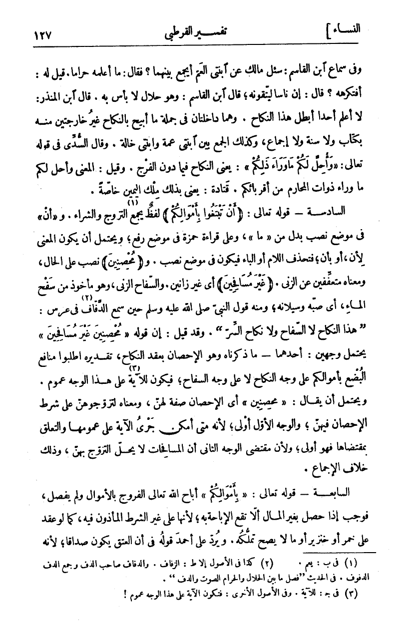 وَفِي سَمَاعِ ابْنِ الْقَاسِمِ: سُئِلَ مَالِكٌ عَنْ ابْنَتَيِ الْعَمِّ أَيُجْمَعُ بَيْنَهُمَا؟ فَقَالَ: مَا أَعْلَمُهُ حَرَامًا. قِيلَ لَهُ: أَفَتَكْرَهُهُ؟ قَالَ: إِنَّ نَاسًا لَيَتَّقُونَهُ، قَالَ ابْنُ الْقَاسِمِ: وَهُوَ حَلَالٌ لَا بَأْسَ بِهِ. قَالَ ابْنُ الْمُنْذِرِ: لَا أَعْلَمَ أَحَدًا أَبْطَلَ هَذَا النِّكَاحَ. وَهُمَا دَاخِلَتَانِ فِي جُمْلَةِ مَا أُبِيحَ بِالنِّكَاحِ غَيْرَ خَارِجَتَيْنِ مِنْهُ بِكِتَابٍ وَلَا سُنَّةٍ وَلَا إِجْمَاعٍ، وَكَذَلِكَ الْجَمْعُ بَيْنَ ابْنَتَيْ عَمَّةٍ وَابْنَتَيْ خَالَةٍ. وَقَالَ السُّدِّيُّ فِي قَوْلِهِ تَعَالَى: (وَأُحِلَّ لَكُمْ مَا وَراءَ ذلِكُمْ): يَعْنِي النِّكَاحَ فِيمَا دُونَ الْفَرْجِ. وَقِيلَ: الْمَعْنَى وَأُحِلَّ لَكُمْ مَا وَرَاءَ ذَوَاتِ الْمَحَارِمِ مِنْ أَقْرِبَائِكُمْ. قَتَادَةُ: يَعْنِي بِذَلِكَ مِلْكَ الْيَمِينِ خَاصَّةً. السَّادِسَةُ- قَوْلُهُ تَعَالَى: (أَنْ تَبْتَغُوا بِأَمْوالِكُمْ) لَفْظٌ يَجْمَعُ «١» التَّزَوُّجَ وَالشِّرَاءَ. وَ (أَنْ) فِي مَوْضِعِ نَصْبٍ بَدَلٌ مِنْ (مَا)، وَعَلَى قِرَاءَةِ حَمْزَةَ فِي مَوْضِعِ رَفْعٍ، وَيَحْتَمِلُ أَنْ يَكُونَ الْمَعْنَى لِأَنْ، أَوْ بِأَنْ، فَتُحْذَفُ اللَّامُ أَوِ الباء فيكون في موضع نصب. و (مُحْصِنِينَ) نُصِبَ عَلَى الْحَالِ، وَمَعْنَاهُ مُتَعَفِّفِينَ عَنِ الزِّنَى. (غَيْرَ مُسافِحِينَ) أَيْ غَيْرَ زَانِينَ. وَالسِّفَاحُ الزِّنَى، وَهُوَ مَأْخُوذٌ مِنْ سَفْحِ الْمَاءِ، أَيْ صَبُّهُ وَسَيَلَانُهُ، وَمِنْهُ قَوْلُ النَّبِيِّ صَلَّى اللَّهُ عَلَيْهِ وَسَلَّمَ حِينَ سَمِعَ الدِّفَافَ «٢» فِي عُرْسٍ: (هَذَا النِّكَاحُ لَا السِّفَاحُ وَلَا نِكَاحُ السِّرِّ). وَقَدْ قِيلَ: إِنَّ قَوْلَهُ (مُحْصِنِينَ غَيْرَ مُسافِحِينَ) يَحْتَمِلُ وَجْهَيْنِ: أَحَدُهُمَا- مَا ذَكَرْنَاهُ وَهُوَ الْإِحْصَانُ بِعَقْدِ النِّكَاحِ، تَقْدِيرُهُ اطْلُبُوا مَنَافِعَ الْبُضْعِ بِأَمْوَالِكُمْ عَلَى وَجْهِ النِّكَاحِ لَا عَلَى وَجْهِ السِّفَاحِ، فَيَكُونُ لِلْآيَةِ «٣» عَلَى هَذَا الْوَجْهِ عُمُومٌ. وَيَحْتَمِلُ أَنْ يُقَالَ: (مُحْصِنِينَ) أَيِ الْإِحْصَانُ صِفَةٌ لَهُنَّ، وَمَعْنَاهُ لِتَزَوَّجُوهُنَّ عَلَى شَرْطِ الْإِحْصَانِ فِيهِنَّ، وَالْوَجْهُ الْأَوَّلُ أَوْلَى، لِأَنَّهُ مَتَى أَمْكَنَ جَرْيُ الْآيَةِ عَلَى عُمُومِهَا وَالتَّعَلُّقِ بِمُقْتَضَاهَا فَهُوَ أَوْلَى، وَلِأَنَّ مُقْتَضَى الْوَجْهِ الثَّانِي أَنَّ الْمُسَافِحَاتِ لَا يَحِلُّ التَّزَوُّجُ بِهِنَّ، وَذَلِكَ خِلَافُ الْإِجْمَاعِ. السَّابِعَةُ- قَوْلُهُ تَعَالَى: (بِأَمْوالِكُمْ) أَبَاحَ اللَّهُ تَعَالَى الْفُرُوجَ بِالْأَمْوَالِ وَلَمْ يفصل، فَوَجَبَ إِذَا حَصَلَ بِغَيْرِ الْمَالِ أَلَّا تَقَعَ الْإِبَاحَةُ بِهِ، لِأَنَّهَا عَلَى غَيْرِ الشَّرْطِ الْمَأْذُونِ فِيهِ، كَمَا لَوْ عَقَدَ عَلَى خَمْرٍ أَوْ خِنْزِيرٍ أَوْ مَا لَا يَصِحُّ تَمَلُّكُهُ. وَيُرَدُّ عَلَى أَحْمَدَ قَوْلَهُ فِي أَنَّ الْعِتْقَ يَكُونُ صداقا، لأنه