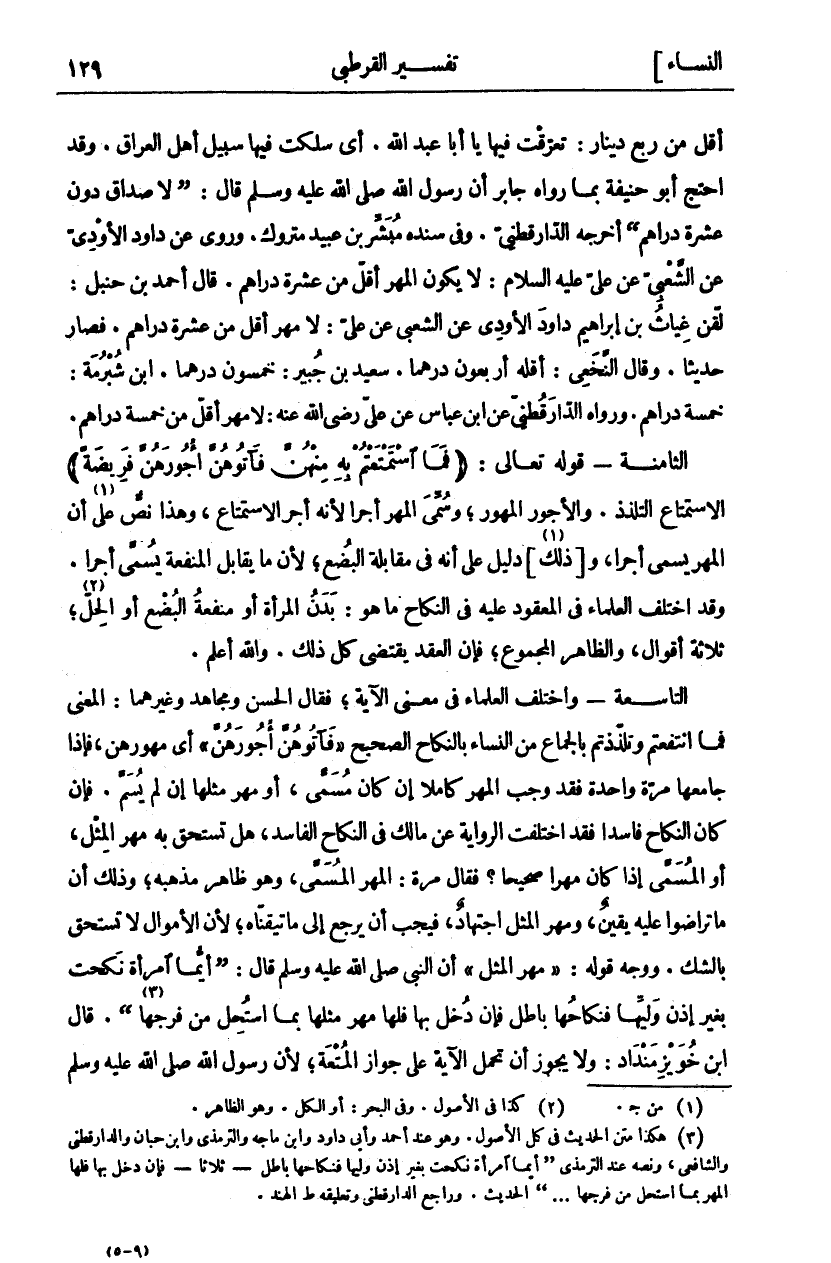 أَقَلُّ مِنْ رُبُعِ دِينَارٍ: تَعَرَّقْتَ فِيهَا يَا أَبَا عَبْدِ اللَّهِ. أَيْ سَلَكْتَ فِيهَا سَبِيلَ أَهْلِ الْعِرَاقِ. وَقَدِ احْتَجَّ أَبُو حَنِيفَةَ بِمَا رَوَاهُ جَابِرٌ أَنَّ رَسُولَ اللَّهِ صَلَّى اللَّهُ عَلَيْهِ وَسَلَّمَ قَالَ: (لَا صَدَاقَ دُونَ عَشَرَةِ دَرَاهِمَ) أَخْرَجَهُ الدَّارَقُطْنِيُّ. وَفِي سَنَدِهِ مُبَشِّرُ بْنُ عُبَيْدٍ مَتْرُوكٌ. وَرُوِيَ عَنْ دَاوُدَ الْأَوْدِيِّ عَنِ الشَّعْبِيِّ عَنْ عَلِيٍّ عَلَيْهِ السَّلَامُ: لَا يَكُونُ الْمَهْرُ أَقَلَّ مِنْ عَشَرَةِ دَرَاهِمَ. قَالَ أَحْمَدُ بْنُ حَنْبَلٍ: لَقَّنَ غِيَاثُ بْنُ إِبْرَاهِيمَ دَاوُدَ الْأَوْدِيَّ عَنِ الشَّعْبِيِّ عَنْ عَلِيٍّ: لَا مَهْرَ أَقَلُّ مِنْ عَشَرَةِ دَرَاهِمَ. فَصَارَ حَدِيثًا. وَقَالَ النَّخَعِيُّ: أَقَلُّهُ أَرْبَعُونَ دِرْهَمًا. سَعِيدُ بْنُ جُبَيْرٍ: خَمْسُونَ دِرْهَمًا. ابْنُ شُبْرُمَةَ: خَمْسَةُ دَرَاهِمَ. وَرَوَاهُ الدَّارَقُطْنِيُّ عَنِ ابْنِ عَبَّاسٍ عَنْ عَلِيٍّ رَضِيَ اللَّهُ عَنْهُ: لَا مَهْرَ أَقَلُّ مِنْ خَمْسَةِ دَرَاهِمَ. الثَّامِنَةُ- قَوْلُهُ تَعَالَى: (فَمَا اسْتَمْتَعْتُمْ بِهِ مِنْهُنَّ فَآتُوهُنَّ أُجُورَهُنَّ فَرِيضَةً) الِاسْتِمْتَاعُ التَّلَذُّذُ. وَالْأُجُورُ الْمُهُورُ، وَسُمِّيَ الْمَهْرُ أَجْرًا لِأَنَّهُ أَجْرُ الِاسْتِمْتَاعِ، وَهَذَا نَصٌّ عَلَى «١» أَنَّ الْمَهْرَ يُسَمَّى أَجْرًا، و [ذلك «٢»] دَلِيلٌ عَلَى أَنَّهُ فِي مُقَابَلَةِ الْبُضْعِ، لِأَنَّ مَا يُقَابِلُ الْمَنْفَعَةَ يُسَمَّى أَجْرًا. وَقَدِ اخْتَلَفَ الْعُلَمَاءُ فِي الْمَعْقُودِ عَلَيْهِ فِي النِّكَاحِ مَا هُوَ: بَدَنُ الْمَرْأَةِ أَوْ مَنْفَعَةُ الْبُضْعِ أَوِ الْحِلُّ «٣»، ثَلَاثَةُ أَقْوَالٍ، وَالظَّاهِرُ الْمَجْمُوعُ، فَإِنَّ الْعَقْدَ يَقْتَضِي كُلَّ ذَلِكَ. وَاللَّهُ أَعْلَمُ. التَّاسِعَةُ- وَاخْتَلَفَ الْعُلَمَاءُ فِي مَعْنَى الْآيَةِ، فَقَالَ الْحَسَنُ وَمُجَاهِدٌ وَغَيْرُهُمَا: الْمَعْنَى فَمَا انْتَفَعْتُمْ وَتَلَذَّذْتُمْ بِالْجِمَاعِ مِنَ النِّسَاءِ بِالنِّكَاحِ الصَّحِيحِ (فَآتُوهُنَّ أُجُورَهُنَّ) أَيْ مُهُورَهُنَّ، فَإِذَا جَامَعَهَا مَرَّةً وَاحِدَةً فَقَدْ وَجَبَ الْمَهْرُ كَامِلًا إِنْ كَانَ مُسَمًّى، أَوْ مَهْرُ مِثْلِهَا إِنْ لَمْ يُسَمَّ. فَإِنْ كَانَ النِّكَاحُ فَاسِدًا فَقَدِ اخْتَلَفَتِ الرِّوَايَةُ عَنْ مَالِكٍ فِي النِّكَاحِ الْفَاسِدِ، هَلْ تَسْتَحِقُّ بِهِ مَهْرَ الْمِثْلِ، أَوِ الْمُسَمَّى إِذَا كَانَ مَهْرًا صَحِيحًا؟ فَقَالَ مَرَّةً: الْمَهْرُ الْمُسَمَّى، وَهُوَ ظَاهِرُ مَذْهَبِهِ، وَذَلِكَ أَنَّ مَا تَرَاضَوْا عَلَيْهِ يَقِينٌ، وَمَهْرُ الْمِثْلِ اجْتِهَادٌ، فَيَجِبُ أَنْ يُرْجَعَ إِلَى مَا تَيَقَّنَّاهُ، لِأَنَّ الْأَمْوَالَ لَا تُسْتَحَقُّ بِالشَّكِّ. وَوَجْهُ قَوْلِهِ: (مَهْرُ الْمِثْلِ) أَنَّ النَّبِيَّ
