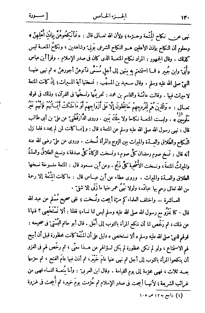 نَهَى عَنْ نِكَاحِ الْمُتْعَةِ وَحَرَّمَهُ، وَلِأَنَّ اللَّهَ تَعَالَى قَالَ: (فَانْكِحُوهُنَّ بِإِذْنِ أَهْلِهِنَّ) وَمَعْلُومٌ أَنَّ النِّكَاحَ بِإِذْنِ الْأَهْلِينَ هُوَ النِّكَاحُ الشَّرْعِيُّ بِوَلِيٍّ وَشَاهِدَيْنِ، وَنِكَاحُ الْمُتْعَةِ لَيْسَ كَذَلِكَ. وَقَالَ الْجُمْهُورُ: الْمُرَادُ نِكَاحُ الْمُتْعَةِ الَّذِي كَانَ فِي صَدْرِ الْإِسْلَامِ. وَقَرَأَ ابْنُ عَبَّاسٍ وَأُبَيٌّ وَابْنُ جُبَيْرٍ (فَمَا اسْتَمْتَعْتُمْ بِهِ مِنْهُنَّ إِلَى أَجَلٍ مُسَمًّى فَآتُوهُنَّ أُجُورَهُنَّ) ثُمَّ نَهَى عَنْهَا النَّبِيُّ صَلَّى اللَّهُ عَلَيْهِ وَسَلَّمَ. وَقَالَ سَعِيدُ بْنُ الْمُسَيَّبِ: نَسَخَتْهَا آيَةُ الْمِيرَاثِ، إِذْ كَانَتِ الْمُتْعَةُ لَا مِيرَاثَ فِيهَا. وَقَالَتْ عَائِشَةُ وَالْقَاسِمُ بْنُ مُحَمَّدٍ: تَحْرِيمُهَا وَنَسْخُهَا فِي الْقُرْآنِ، وَذَلِكَ فِي قَوْلِهِ تَعَالَى: (وَالَّذِينَ هُمْ لِفُرُوجِهِمْ حافِظُونَ إِلَّا عَلى أَزْواجِهِمْ أَوْ مَا مَلَكَتْ أَيْمانُهُمْ فَإِنَّهُمْ غَيْرُ مَلُومِينَ «١» (وَلَيْسَتِ الْمُتْعَةُ نِكَاحًا وَلَا مِلْكَ يَمِينٍ. وَرَوَى الدَّارَقُطْنِيُّ عَنْ عَلِيِّ بْنِ أَبِي طَالِبٍ قَالَ: نَهَى رَسُولُ اللَّهِ صَلَّى اللَّهُ عَلَيْهِ وَسَلَّمَ عَنِ الْمُتْعَةِ، قَالَ: وَإِنَّمَا كَانَتْ لِمَنْ لَمْ يَجِدْ، فَلَمَّا نَزَلَ النِّكَاحُ وَالطَّلَاقُ وَالْعِدَّةُ وَالْمِيرَاثُ بَيْنَ الزَّوْجِ وَالْمَرْأَةِ نُسِخَتْ. وَرُوِيَ عَنْ عَلِيٍّ رَضِيَ اللَّهُ عَنْهُ أَنَّهُ قَالَ: نَسَخَ صَوْمُ رَمَضَانَ كُلَّ صَوْمٍ، وَنَسَخَتِ الزَّكَاةُ كُلَّ صَدَقَةٍ، وَنَسَخَ الطَّلَاقُ وَالْعِدَّةُ وَالْمِيرَاثُ الْمُتْعَةَ، وَنَسَخَتِ الْأُضْحِيَةُ كُلَّ ذَبْحٍ. وَعَنِ ابْنِ مَسْعُودٍ قَالَ: الْمُتْعَةُ مَنْسُوخَةٌ نَسَخَهَا الطَّلَاقُ وَالْعِدَّةُ وَالْمِيرَاثُ. وَرَوَى عَطَاءٌ عَنِ ابْنِ عَبَّاسٍ قَالَ: مَا كَانَتِ الْمُتْعَةُ إِلَّا رَحْمَةً مِنَ اللَّهِ تَعَالَى رَحِمَ بِهَا عِبَادَهُ وَلَوْلَا نَهْيُ عُمَرَ عَنْهَا مَا زَنَى إِلَّا شَقِيٌّ. الْعَاشِرَةُ- وَاخْتَلَفَ الْعُلَمَاءُ كَمْ مَرَّةً أُبِيحَتْ وَنُسِخَتْ، فَفِي صَحِيحِ مُسْلِمٍ عَنْ عَبْدِ اللَّهِ قَالَ: كُنَّا نَغْزُو مَعَ رَسُولِ اللَّهِ صَلَّى اللَّهُ عَلَيْهِ وَسَلَّمَ لَيْسَ لَنَا نِسَاءٌ، فَقُلْنَا: أَلَا نَسْتَخْصِي؟ فَنَهَانَا عَنْ ذَلِكَ، ثُمَّ رَخَّصَ لَنَا أَنْ نَنْكِحَ الْمَرْأَةَ بِالثَّوْبِ إِلَى أَجَلٍ. قَالَ أَبُو حَاتِمٍ الْبُسْتِيُّ فِي صَحِيحِهِ: قَوْلُهُمْ لِلنَّبِيِّ صَلَّى اللَّهُ عَلَيْهِ وَسَلَّمَ (أَلَا نَسْتَخْصِي) دَلِيلٌ عَلَى أَنَّ الْمُتْعَةَ كَانَتْ مَحْظُورَةً قَبْلَ أَنْ أُبِيحَ لَهُمُ الِاسْتِمْتَاعُ، وَلَوْ لَمْ تَكُنْ مَحْظُورَةً لَمْ يَكُنْ لِسُؤَالِهِمْ عَنْ هَذَا مَعْنًى، ثُمَّ رَخَّصَ لَهُمْ فِي الْغَزْوِ أَنْ يَنْكِحُوا الْمَرْأَةَ بِالثَّوْبِ إِلَى أَجَلٍ ثُمَّ نَهَى عَنْهَا عَامَ خَيْبَرَ، ثُمَّ أَذِنَ فِيهَا عَامَ الْفَتْحِ، ثُمَّ حَرَّمَهَا بَعْدَ ثَلَاثٍ، فَهِيَ مُحَرَّمَةٌ إِلَى يَوْمِ الْقِيَامَةِ. وَقَالَ ابْنُ الْعَرَبِيِّ: وَأَمَّا مُتْعَةُ النِّسَاءِ فَهِيَ مِنْ غَرَائِبِ الشَّرِيعَةِ، لِأَنَّهَا أُبِيحَتْ فِي صَدْرِ الْإِسْلَامِ ثُمَّ حُرِّمَتْ يوم خيبر، ثم أبيحت في غزوة