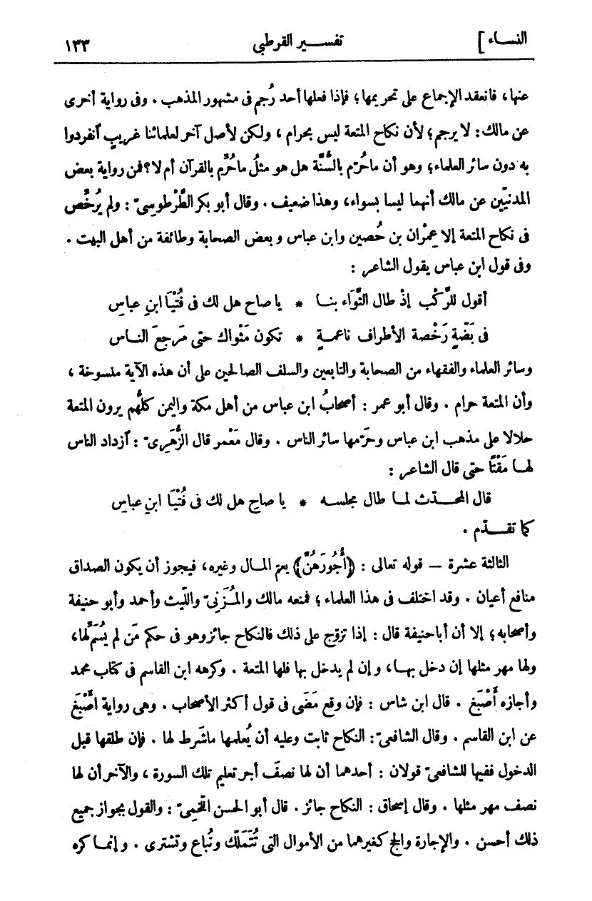 عَنْهَا، فَانْعَقَدَ الْإِجْمَاعُ عَلَى تَحْرِيمِهَا، فَإِذَا فَعَلَهَا أَحَدٌ رُجِمَ فِي مَشْهُورِ الْمَذْهَبِ. وَفِي رِوَايَةٍ أُخْرَى عَنْ مَالِكٍ: لَا يُرْجَمُ، لِأَنَّ نِكَاحَ الْمُتْعَةِ لَيْسَ بِحَرَامٍ، وَلَكِنْ لِأَصْلٍ آخَرَ لِعُلَمَائِنَا غَرِيبٍ انْفَرَدُوا بِهِ دُونَ سَائِرِ الْعُلَمَاءِ، وَهُوَ أَنَّ مَا حُرِّمَ بِالسُّنَّةِ هَلْ هُوَ مِثْلُ مَا حُرِّمَ بِالْقُرْآنِ أَمْ لَا؟ فَمِنْ رِوَايَةِ بَعْضِ الْمَدَنِيِّينَ عَنْ مَالِكٍ أَنَّهُمَا لَيْسَا بِسَوَاءٍ، وَهَذَا ضَعِيفٌ. وَقَالَ أَبُو بَكْرٍ الطَّرْطُوسِيُّ: وَلَمْ يُرَخِّصْ فِي نِكَاحِ الْمُتْعَةِ إِلَّا عِمْرَانُ بْنُ حُصَيْنٍ وَابْنُ عَبَّاسٍ وَبَعْضُ الصَّحَابَةِ وَطَائِفَةٌ مِنْ أَهْلِ الْبَيْتِ. وَفِي قَوْلِ ابْنِ عَبَّاسٍ يَقُولُ الشَّاعِرُ: