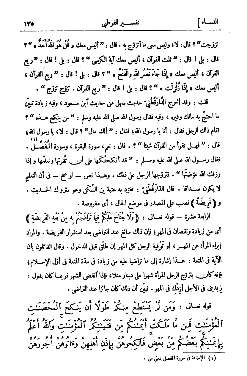 تَزَوَّجْتَ (؟ قَالَ: لَا، وَلَيْسَ مَعِي مَا أَتَزَوَّجُ بِهِ. قَالَ: أَلَيْسَ مَعَكَ (قُلْ هُوَ اللَّهُ أَحَدٌ)؟ قَالَ: بَلَى! قَالَ: (ثُلُثُ الْقُرْآنِ، أَلَيْسَ مَعَكَ آيَةَ الْكُرْسِيِّ)؟ قَالَ: بَلَى! قَالَ: (رُبْعُ الْقُرْآنِ، أَلَيْسَ مَعَكَ (إِذا جاءَ نَصْرُ اللَّهِ وَالْفَتْحُ)؟ قَالَ: بَلَى! قَالَ: (رُبُعُ الْقُرْآنِ)، أَلَيْسَ مَعَكَ (إِذا زُلْزِلَتِ) (؟ قَالَ: بَلَى! قَالَ:) رُبُعُ الْقُرْآنِ. تَزَوَّجْ تَزَوَّجْ (. قُلْتُ: وَقَدْ أَخْرَجَ الدَّارَقُطْنِيُّ حَدِيثَ سَهْلٍ مِنْ حَدِيثِ ابْنِ مَسْعُودٍ، وَفِيهِ زِيَادَةٌ تُبَيِّنُ، مَا احْتَجَّ بِهِ مَالِكٌ وَغَيْرُهُ، وَفِيهِ فَقَالَ رَسُولُ اللَّهِ صَلَّى اللَّهُ عَلَيْهِ وَسَلَّمَ: (مَنْ يَنْكِحْ هَذِهِ)؟ فَقَامَ ذَلِكَ الرَّجُلُ فَقَالَ: أَنَا يَا رَسُولَ اللَّهِ، فَقَالَ: (أَلَكَ مَالٌ)؟ قَالَ: لَا، يَا رَسُولَ اللَّهِ، قَالَ: (فَهَلْ تَقْرَأُ مِنَ الْقُرْآنِ شَيْئًا)؟. قَالَ: نَعَمْ، سُورَةُ الْبَقَرَةِ، وَسُورَةُ الْمُفَصَّلِ «١». فَقَالَ رَسُولُ اللَّهِ صَلَّى اللَّهُ عَلَيْهِ وَسَلَّمَ: (قَدْ أَنْكَحْتُكَهَا عَلَى أَنْ تُقْرِئَهَا وَتُعَلِّمَهَا وَإِذَا رَزَقَكَ اللَّهُ عَوَّضْتَهَا). فَتَزَوَّجَهَا الرَّجُلُ عَلَى ذَلِكَ. وَهَذَا نَصٌّ- لَوْ صَحَّ- فِي أَنَّ التَّعْلِيمَ لَا يَكُونُ صَدَاقًا. قَالَ الدَّارَقُطْنِيُّ: تَفَرَّدَ بِهِ عُتْبَةُ بْنُ السَّكَنِ وَهُوَ مَتْرُوكُ الْحَدِيثِ. وَ (فَرِيضَةً) نُصِبَ عَلَى الْمَصْدَرِ فِي مَوْضِعِ الْحَالِ، أَيْ مَفْرُوضَةً. الرَّابِعَةُ عَشْرَةَ- قَوْلُهُ تَعَالَى: (وَلا جُناحَ عَلَيْكُمْ فِيما تَراضَيْتُمْ بِهِ مِنْ بَعْدِ الْفَرِيضَةِ) أَيْ مِنْ زِيَادَةٍ وَنُقْصَانٍ فِي الْمَهْرِ، فَإِنَّ ذَلِكَ سَائِغٌ عِنْدَ التَّرَاضِي بَعْدَ اسْتِقْرَارِ الْفَرِيضَةِ. وَالْمُرَادُ إِبْرَاءُ الْمَرْأَةِ عَنِ الْمَهْرِ، أَوْ تَوْفِيَةُ الرَّجُلِ كُلَّ الْمَهْرِ إِنْ طَلَّقَ قَبْلَ الدُّخُولِ. وَقَالَ الْقَائِلُونَ بِأَنَّ الْآيَةَ فِي الْمُتْعَةِ: هَذَا إِشَارَةٌ إِلَى مَا تَرَاضَيَا عَلَيْهِ مِنْ زِيَادَةٍ فِي مُدَّةِ الْمُتْعَةِ فِي أَوَّلِ الْإِسْلَامِ، فَإِنَّهُ كَانَ يَتَزَوَّجُ الرَّجُلُ الْمَرْأَةَ شَهْرًا عَلَى دِينَارٍ مَثَلًا، فَإِذَا انْقَضَى الشَّهْرُ فَرُبَّمَا كَانَ يَقُولُ: زِيدِينِي فِي الْأَجَلِ أَزِدْكِ فِي الْمَهْرِ. فَبَيَّنَ أَنَّ ذَلِكَ كان جائزا عند التراضي.
