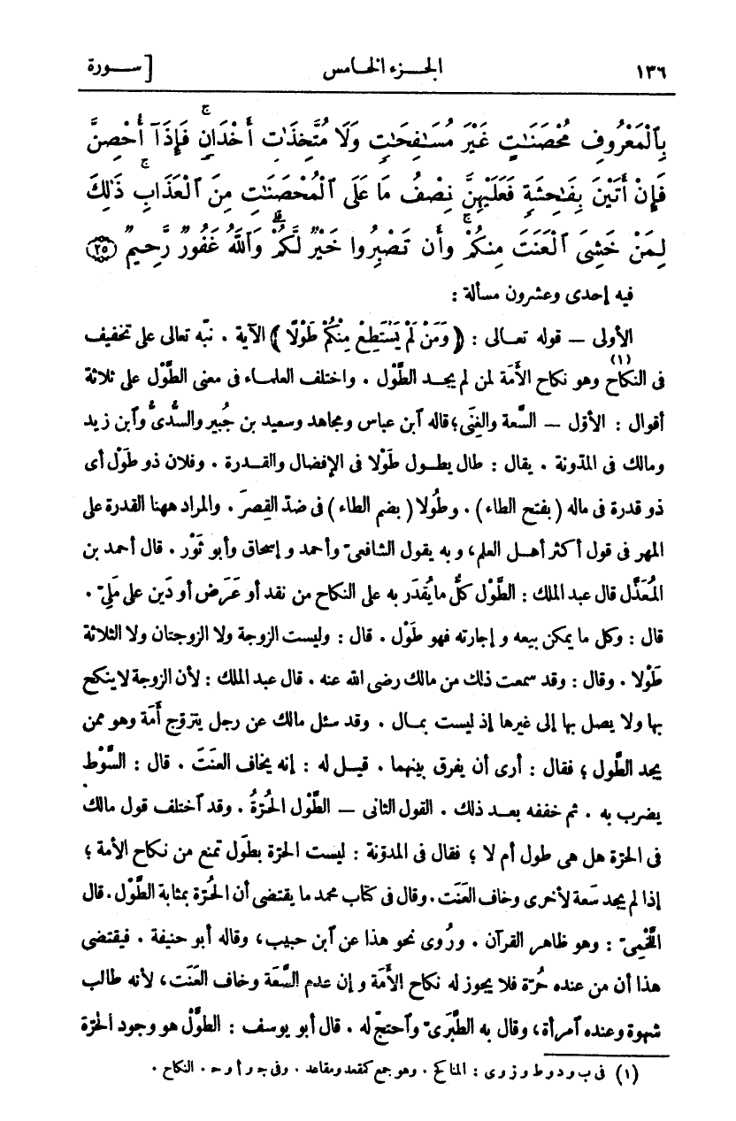 فِيهِ إِحْدَى وَعِشْرُونَ مَسْأَلَةً: الْأُولَى- قَوْلُهُ تَعَالَى: (وَمَنْ لَمْ يَسْتَطِعْ مِنْكُمْ طَوْلًا) الْآيَةَ. نَبَّهَ تَعَالَى عَلَى تَخْفِيفٍ فِي النِّكَاحِ «١» وَهُوَ نِكَاحُ الْأَمَةِ لِمَنْ لَمْ يَجِدِ الطَّوْلَ. وَاخْتَلَفَ الْعُلَمَاءُ. فِي مَعْنَى الطَّوْلِ عَلَى ثَلَاثَةِ أَقْوَالٍ: الْأَوَّلُ- السَّعَةُ وَالْغِنَى، قَالَهُ ابْنُ عَبَّاسٍ وَمُجَاهِدٌ وَسَعِيدُ بْنُ جُبَيْرٍ وَالسُّدِّيُّ وَابْنُ زَيْدٍ وَمَالِكٌ فِي الْمُدَوَّنَةِ. يُقَالُ: طَالَ يَطُولُ طَوْلًا فِي الْإِفْضَالِ وَالْقُدْرَةِ. وَفُلَانٌ ذُو طَوْلٍ أَيْ ذُو قُدْرَةٍ في مال (بِفَتْحِ الطَّاءِ). وَطُولًا (بِضَمِّ الطَّاءِ) فِي ضِدِّ القصر. والمراد هاهنا القدرة على المهر فقول أَكْثَرِ أَهْلِ الْعِلْمِ، وَبِهِ يَقُولُ الشَّافِعِيُّ وَأَحْمَدُ وَإِسْحَاقُ وَأَبُو ثَوْرٍ. قَالَ أَحْمَدُ بْنُ الْمُعَذَّلِ: قَالَ عَبْدُ الْمَلِكِ: الطَّوْلُ كُلُّ مَا يُقْدَرُ بِهِ عَلَى النِّكَاحِ مِنْ نَقْدٍ أَوْ عَرَضٍ أَوْ دَيْنٍ عَلَى مَلِيٍّ. قَالَ: وَكُلُّ مَا يُمْكِنُ بَيْعُهُ وَإِجَارَتُهُ فَهُوَ طَوْلٌ. قَالَ: وَلَيْسَتِ الزَّوْجَةُ وَلَا الزَّوْجَتَانِ وَلَا الثَّلَاثَةُ طَوْلًا. وَقَالَ: وَقَدْ سَمِعْتُ ذَلِكَ مِنْ مَالِكٍ رَضِيَ اللَّهُ عَنْهُ. قَالَ عَبْدُ الْمَلِكِ: لِأَنَّ الزَّوْجَةَ لَا يُنْكَحُ بِهَا وَلَا يَصِلُ بِهَا إِلَى غَيْرِهَا إِذْ لَيْسَتْ بِمَالٍ. وَقَدْ سُئِلَ مَالِكٌ عَنْ رَجُلٍ يَتَزَوَّجُ أَمَةً وَهُوَ مِمَّنْ يَجِدُ الطَّوْلَ، فَقَالَ: أَرَى أَنْ يُفَرَّقَ بَيْنَهُمَا. قِيلَ لَهُ: إِنَّهُ يَخَافُ الْعَنَتَ. قَالَ: السَّوْطُ يُضْرَبُ بِهِ. ثُمَّ خَفَّفَهُ بَعْدَ ذَلِكَ. الْقَوْلُ الثَّانِي: الطَّوْلُ الْحُرَّةُ. وَقَدِ اخْتَلَفَ قَوْلُ مَالِكٍ فِي الْحُرَّةِ هَلْ هِيَ طَوْلٌ أَمْ لَا، فَقَالَ فِي الْمُدَوَّنَةِ: لَيْسَتِ الْحُرَّةُ بِطَوْلٍ تَمْنَعُ مِنْ نِكَاحِ الْأَمَةِ، إِذَا لَمْ يَجِدْ سَعَةً لِأُخْرَى وَخَافَ الْعَنَتَ. وَقَالَ فِي كِتَابِ مُحَمَّدٍ مَا يَقْتَضِي أَنَّ الْحُرَّةَ بِمَثَابَةِ الطَّوْلِ. قَالَ اللَّخْمِيُّ: وَهُوَ ظَاهِرُ الْقُرْآنِ. وَرُوِيَ نَحْوُ هَذَا عَنِ ابْنِ حَبِيبٍ، وَقَالَهُ أَبُو حَنِيفَةَ. فَيَقْتَضِي هَذَا أَنَّ مَنْ عِنْدَهُ حُرَّةٌ فَلَا يَجُوزُ لَهُ نِكَاحُ الْأَمَةِ وَإِنْ عُدِمَ السَّعَةَ وَخَافَ الْعَنَتَ، لِأَنَّهُ طَالِبُ شَهْوَةٍ وَعِنْدَهُ امْرَأَةٌ، وَقَالَ بِهِ الطَّبَرِيُّ وَاحْتَجَّ لَهُ. قَالَ أَبُو يُوسُفَ: الطَّوْلُ هُوَ وجود الحرة