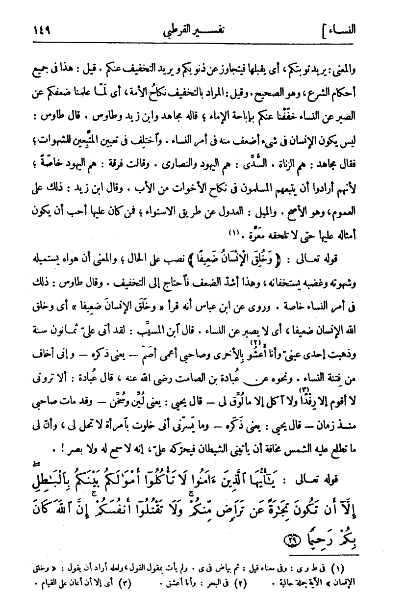 وَالْمَعْنَى: يُرِيدُ تَوْبَتَكُمْ، أَيْ يَقْبَلُهَا فَيَتَجَاوَزُ عَنْ ذُنُوبِكُمْ وَيُرِيدُ التَّخْفِيفَ عَنْكُمْ. قِيلَ: هَذَا فِي جَمِيعِ أَحْكَامِ الشَّرْعِ، وَهُوَ الصَّحِيحُ. وَقِيلَ: الْمُرَادُ بِالتَّخْفِيفِ نِكَاحُ الْأَمَةِ، أَيْ لَمَّا عَلِمْنَا ضَعْفَكُمْ عَنِ الصَّبْرِ عَنِ النِّسَاءِ خَفَّفْنَا عَنْكُمْ بِإِبَاحَةِ الْإِمَاءِ، قَالَهُ مُجَاهِدٌ وَابْنُ زَيْدٍ وَطَاوُسٌ. قَالَ طاوس: ليس يكون الإنسان في شي أَضْعَفَ مِنْهُ فِي أَمْرِ النِّسَاءِ. وَاخْتُلِفَ فِي تَعْيِينِ الْمُتَّبِعِينَ لِلشَّهَوَاتِ، فَقَالَ مُجَاهِدٌ: هُمُ الزُّنَاةُ. السُّدِّيُّ: هُمْ الْيَهُودُ وَالنَّصَارَى. وَقَالَتْ فِرْقَةٌ: هُمُ الْيَهُودُ خَاصَّةً، لِأَنَّهُمْ أَرَادُوا أَنْ يَتَّبِعَهُمُ الْمُسْلِمُونَ فِي نِكَاحِ الْأَخَوَاتِ مِنَ الْأَبِ. وَقَالَ ابْنُ زَيْدٍ: ذَلِكَ عَلَى الْعُمُومِ، وَهُوَ الْأَصَحُّ. وَالْمَيْلُ: الْعُدُولُ عَنْ طَرِيقِ الِاسْتِوَاءِ، فَمَنْ كَانَ عَلَيْهَا أَحَبَّ أَنْ يَكُونَ أَمْثَالُهُ عَلَيْهَا حَتَّى لَا تَلْحَقُهُ مَعَرَّةٌ «١». قَوْلُهُ تَعَالَى: (وَخُلِقَ الْإِنْسانُ ضَعِيفاً) نُصِبَ عَلَى الْحَالِ، وَالْمَعْنَى أَنَّ هَوَاهُ يَسْتَمِيلُهُ وَشَهْوَتُهُ وَغَضَبُهُ يَسْتَخِفَّانِهِ، وَهَذَا أَشَدُّ الضَّعْفِ فَاحْتَاجَ إِلَى التَّخْفِيفِ. وَقَالَ طَاوُسٌ: ذَلِكَ فِي أَمْرِ النِّسَاءِ خَاصَّةً. وَرُوِيَ عَنِ ابْنِ عَبَّاسٍ أَنَّهُ قَرَأَ (وَخَلَقَ الْإِنْسَانَ ضَعِيفًا) أَيْ وَخَلَقَ اللَّهُ الْإِنْسَانَ ضَعِيفًا، أَيْ لَا يَصْبِرُ عَنِ النِّسَاءِ. قَالَ ابْنُ الْمُسَيَّبِ: لَقَدْ أَتَى عَلَيَّ ثَمَانُونَ سَنَةً وَذَهَبَتْ إِحْدَى عَيْنَيَّ وَأَنَا أَعْشُو «٢» بِالْأُخْرَى وَصَاحِبِي أَعْمَى أَصَمُّ- يَعْنِي ذَكَرُهُ- وَإِنِّي أَخَافُ مِنْ فِتْنَةِ النِّسَاءِ. وَنَحْوَهُ عَنْ عُبَادَةَ بْنِ الصَّامِتِ رَضِيَ اللَّهُ عَنْهُ، قَالَ عُبَادَةُ: أَلَا تَرَوْنِي لَا أَقُومُ إِلَّا رِفْدًا «٣» وَلَا آكُلُ إِلَّا مَا لُوِّقَ لِي- قَالَ يَحْيَى: يَعْنِي لُيِّنَ وَسُخِّنَ- وَقَدْ مَاتَ صَاحِبِي مُنْذُ زَمَانٍ- قَالَ يَحْيَى: يَعْنِي ذَكَرُهُ- وَمَا يَسُرُّنِي أَنِّي خَلَوْتُ بِامْرَأَةٍ لَا تَحِلُّ لِي، وَأَنَّ لِي مَا تَطْلُعُ عَلَيْهِ الشَّمْسُ مَخَافَةَ أَنْ يَأْتِيَنِي الشَّيْطَانُ فَيُحَرِّكَهُ عَلَيَّ، إِنَّهُ لَا سَمْعَ لَهُ وَلَا بَصَرَ!. قَوْلُهُ تَعَالَى: يَا أَيُّهَا الَّذِينَ آمَنُوا لَا تَأْكُلُوا أَمْوالَكُمْ بَيْنَكُمْ بِالْباطِلِ إِلَّا أَنْ تَكُونَ تِجارَةً عَنْ تَراضٍ مِنْكُمْ وَلا تَقْتُلُوا أَنْفُسَكُمْ إِنَّ اللَّهَ كانَ بِكُمْ رَحِيماً (٢٩)