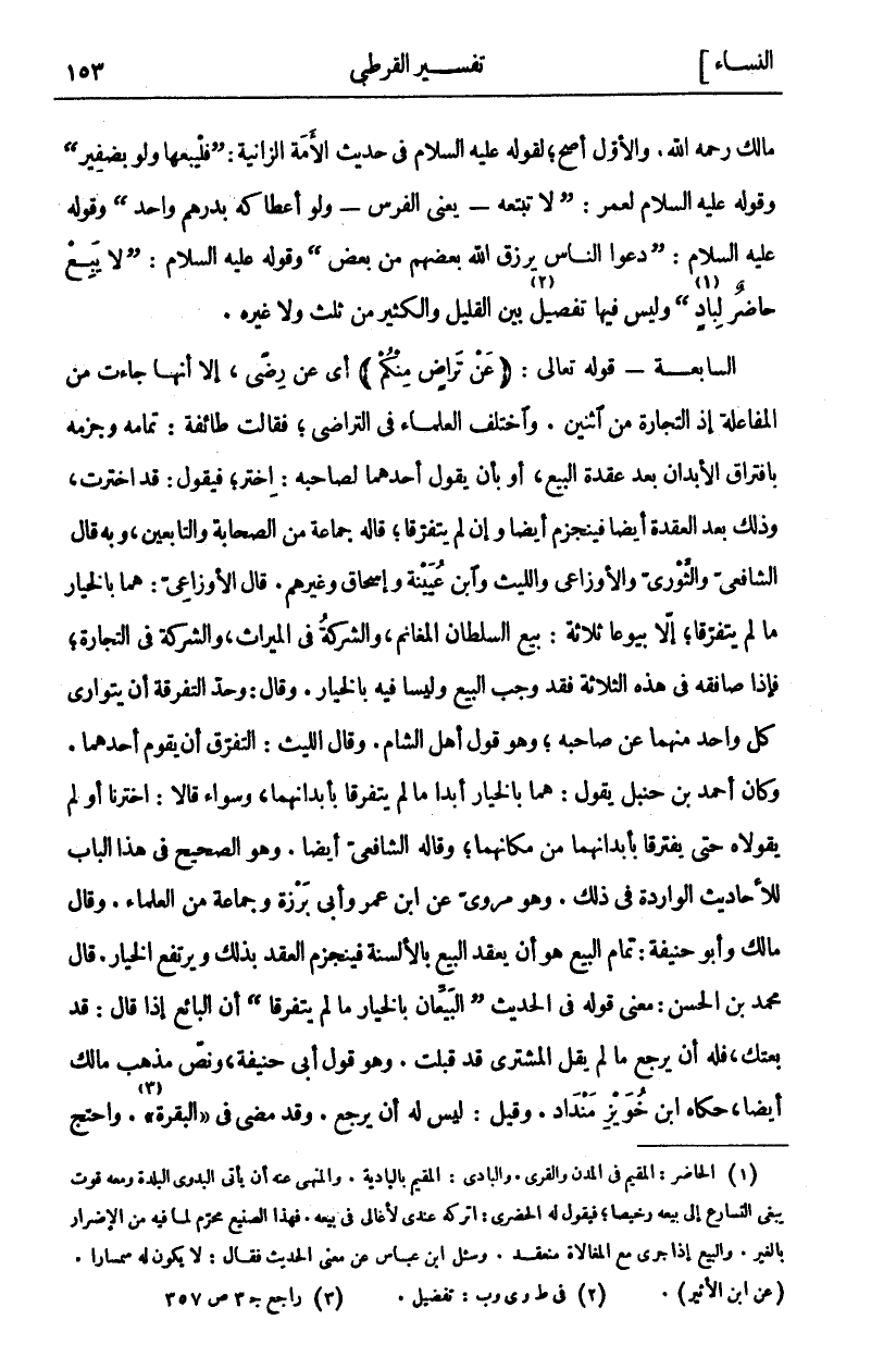 مَالِكٍ رَحِمَهُ اللَّهُ. وَالْأَوَّلُ أَصَحُّ، لِقَوْلِهِ عَلَيْهِ السَّلَامُ فِي حَدِيثِ الْأَمَةِ الزَّانِيَةِ. (فَلْيَبِعْهَا وَلَوْ بِضَفِيرٍ) وَقَوْلِهِ عَلَيْهِ السَّلَامُ لِعُمَرَ: (لَا تَبْتَعْهُ- يَعْنِي الْفَرَسَ- وَلَوْ أَعْطَاكَهُ بِدِرْهَمٍ وَاحِدٍ) وَقَوْلِهِ عَلَيْهِ السَّلَامُ: (دَعُوا النَّاسَ يَرْزُقُ اللَّهُ بَعْضَهُمْ من بعض) وقوله عليه السلام: (لا يبغ حَاضِرٌ لِبَادٍ «١») وَلَيْسَ فِيهَا تَفْصِيلٌ «٢» بَيْنَ الْقَلِيلِ وَالْكَثِيرِ مِنْ ثُلُثٍ وَلَا غَيْرِهِ. السَّابِعَةُ- قَوْلُهُ تعالى: (عَنْ تَراضٍ مِنْكُمْ) أي عن رضى، إِلَّا أَنَّهَا جَاءَتْ مِنَ الْمُفَاعَلَةِ إِذِ التِّجَارَةُ مِنَ اثْنَيْنِ. وَاخْتَلَفَ الْعُلَمَاءُ فِي التَّرَاضِي، فَقَالَتْ طَائِفَةٌ: تَمَامُهُ وَجَزْمُهُ بِافْتِرَاقِ الْأَبْدَانِ بَعْدَ عُقْدَةِ الْبَيْعِ، أَوْ بِأَنْ يَقُولَ أَحَدُهُمَا لِصَاحِبِهِ: اخْتَرْ، فَيَقُولُ: قَدِ اخْتَرْتُ، وَذَلِكَ بَعْدَ الْعُقْدَةِ أَيْضًا فَيَنْجَزِمُ أَيْضًا وَإِنْ لَمْ يَتَفَرَّقَا، قَالَهُ جَمَاعَةٌ مِنَ الصَّحَابَةِ وَالتَّابِعِينَ، وَبِهِ قَالَ الشَّافِعِيُّ وَالثَّوْرِيُّ وَالْأَوْزَاعِيُّ وَاللَّيْثُ وَابْنُ عُيَيْنَةَ وَإِسْحَاقُ وَغَيْرُهُمْ. قَالَ الْأَوْزَاعِيُّ: هُمَا بِالْخِيَارِ مَا لَمْ يَتَفَرَّقَا، إِلَّا بُيُوعًا ثَلَاثَةً: بَيْعُ السُّلْطَانِ الْمَغَانِمَ، وَالشَّرِكَةُ فِي الْمِيرَاثِ، وَالشَّرِكَةُ فِي التِّجَارَةِ، فَإِذَا صَافَقَهُ فِي هَذِهِ الثَّلَاثَةِ فَقَدْ وَجَبَ الْبَيْعُ وَلَيْسَا فِيهِ بِالْخِيَارِ. وَقَالَ: وَحَدُّ التَّفْرِقَةِ أَنْ يَتَوَارَى كُلُّ وَاحِدٍ مِنْهُمَا عَنْ صَاحِبِهِ، وَهُوَ قَوْلُ أَهْلِ الشَّامِ. وَقَالَ اللَّيْثُ: التَّفَرُّقُ أَنْ يَقُومَ أَحَدُهُمَا. وَكَانَ أَحْمَدُ بْنُ حَنْبَلٍ يَقُولُ: هُمَا بِالْخِيَارِ أَبَدًا مَا لَمْ يَتَفَرَّقَا بِأَبْدَانِهِمَا، وَسَوَاءً قَالَا: اخْتَرْنَا أَوْ لَمْ يَقُولَاهُ حَتَّى يَفْتَرِقَا بِأَبْدَانِهِمَا من مكانهما، وقال الشَّافِعِيُّ أَيْضًا. وَهُوَ الصَّحِيحُ فِي هَذَا الْبَابِ لِلْأَحَادِيثِ الْوَارِدَةِ فِي ذَلِكَ. وَهُوَ مَرْوِيٌّ عَنِ ابْنِ عُمَرَ وَأَبِي بَرْزَةَ وَجَمَاعَةٍ مِنَ الْعُلَمَاءِ. وَقَالَ مَالِكٌ وَأَبُو حَنِيفَةَ: تَمَامُ الْبَيْعِ هُوَ أَنْ يُعْقَدَ الْبَيْعُ بِالْأَلْسِنَةِ فَيَنْجَزِمُ الْعَقْدُ بِذَلِكَ وَيَرْتَفِعُ الْخِيَارُ. قَالَ مُحَمَّدُ بْنُ الْحَسَنِ: مَعْنَى قَوْلِهِ فِي الْحَدِيثِ (الْبَيِّعَانِ بِالْخِيَارِ مَا لَمْ يَتَفَرَّقَا) أَنَّ الْبَائِعَ إِذَا قَالَ: قَدْ بِعْتُكَ، فَلَهُ أَنْ يَرْجِعَ مَا لَمْ يَقُلِ الْمُشْتَرِيَ قَدْ قَبِلْتُ. وَهُوَ قَوْلُ أَبِي حَنِيفَةَ، وَنَصُّ مَذْهَبِ مَالِكٍ أَيْضًا، حَكَاهُ ابْنُ خُوَيْزِ مَنْدَادُ. وَقِيلَ: لَيْسَ لَهُ أَنْ يَرْجِعَ. وَقَدْ مَضَى في (البقرة «٣»). واحتج