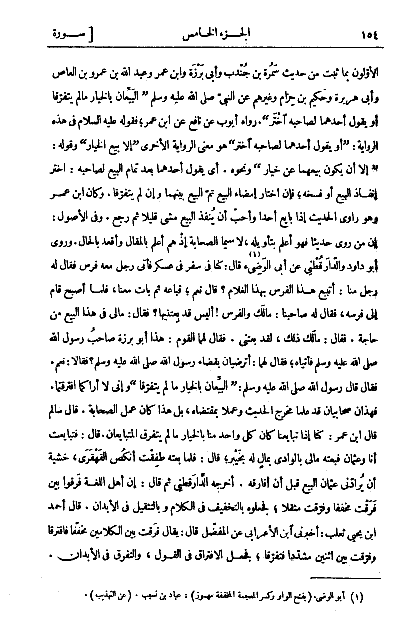 الْأَوَّلُونَ بِمَا ثَبَتَ مِنْ حَدِيثِ سَمُرَةَ بْنِ جُنْدَبٍ وَأَبِي بَرْزَةَ وَابْنِ عُمَرَ وَعَبْدِ اللَّهِ بْنِ عَمْرِو بْنِ الْعَاصِ وَأَبِي هُرَيْرَةَ وَحَكِيمِ بْنِ حِزَامٍ وَغَيْرِهِمْ عَنِ النَّبِيِّ صَلَّى اللَّهُ عَلَيْهِ وَسَلَّمَ (الْبَيِّعَانِ بِالْخِيَارِ مَا لَمْ يَتَفَرَّقَا أَوْ يَقُولُ أَحَدُهُمَا لِصَاحِبِهِ اخْتَرْ). رَوَاهُ أَيُّوبُ عَنْ نَافِعٍ عَنِ ابْنِ عُمَرَ، فَقَوْلُهُ عَلَيْهِ السَّلَامُ فِي هَذِهِ الرِّوَايَةِ: (أَوْ يَقُولُ أَحَدُهُمَا لِصَاحِبِهِ اخْتَرْ) هُوَ مَعْنَى الرِّوَايَةِ الْأُخْرَى (إِلَّا بَيْعَ الْخِيَارِ) وَقَوْلُهُ: (إِلَّا أَنْ يَكُونَ بَيْعُهُمَا عَنْ خِيَارٍ) وَنَحْوِهِ. أَيْ يَقُولُ أَحَدُهُمَا بَعْدَ تَمَامِ الْبَيْعِ لِصَاحِبِهِ: اخْتَرْ إِنْفَاذَ الْبَيْعِ أَوْ فَسْخَهُ، فَإِنِ اخْتَارَ إِمْضَاءَ الْبَيْعِ تَمَّ الْبَيْعُ بينها وَإِنْ لَمْ يَتَفَرَّقَا. وَكَانَ ابْنُ عُمَرَ وَهُوَ رَاوِي الْحَدِيثِ إِذَا بَايَعَ أَحَدًا وَأَحَبَّ أَنْ يُنْفِذَ الْبَيْعَ مَشَى قَلِيلًا ثُمَّ رَجَعَ. وَفِي الْأُصُولِ: إِنَّ مَنْ رَوَى حَدِيثًا فَهُوَ أَعْلَمُ بِتَأْوِيلِهِ، لَا سِيَّمَا الصَّحَابَةُ إِذْ هُمْ أَعْلَمُ بِالْمَقَالِ وَأَقْعَدُ بِالْحَالِ. وَرَوَى أَبُو دَاوُدَ وَالدَّارَقُطْنِيُّ عن أبي الوضي «١» قَالَ: كُنَّا فِي سَفَرٍ فِي عَسْكَرٍ فَأَتَى رَجُلٌ مَعَهُ فَرَسٌ فَقَالَ لَهُ رَجُلٌ مِنَّا: أَتَبِيعُ هَذَا الْفَرَسَ بِهَذَا الْغُلَامِ؟ قَالَ: نَعَمْ، فَبَاعَهُ ثُمَّ بَاتَ مَعَنَا، فَلَمَّا أَصْبَحَ قَامَ إلى فرسه، فقال له صاحبنا: مالك وَالْفَرَسُ! أَلَيْسَ قَدْ بِعْتَنِيهَا؟ فَقَالَ: مَا لِي في هذا البيع من حاجة. فقال: مالك ذَلِكَ، لَقَدْ بِعْتَنِي. فَقَالَ لَهُمَا الْقَوْمُ: هَذَا أَبُو بَرْزَةَ صَاحِبُ رَسُولِ اللَّهِ صَلَّى اللَّهُ عَلَيْهِ وَسَلَّمَ فَأْتِيَاهُ، فَقَالَ لَهُمَا: أَتَرْضَيَانِ بِقَضَاءِ رَسُولِ اللَّهِ صَلَّى اللَّهُ عَلَيْهِ وَسَلَّمَ؟ فَقَالَا: نَعَمْ. فَقَالَ: قَالَ رَسُولُ اللَّهِ صَلَّى اللَّهُ عَلَيْهِ وَسَلَّمَ: (الْبَيِّعَانِ بِالْخِيَارِ مَا لَمْ يَتَفَرَّقَا) وَإِنِّي لَا أَرَاكُمَا افْتَرَقْتُمَا. فَهَذَانَ صَحَابِيَّانِ قَدْ عَلِمَا مَخْرَجَ الْحَدِيثِ وَعَمِلَا بِمُقْتَضَاهُ، بَلْ هَذَا كَانَ عَمَلَ الصَّحَابَةِ. قَالَ سَالِمٌ قَالَ ابْنُ عُمَرَ: كُنَّا إِذَا تَبَايَعْنَا كَانَ كُلُّ وَاحِدٍ منا بالخيار ما لم يفرق الْمُتَبَايِعَانِ. قَالَ: فَتَبَايَعْتُ أَنَا وَعُثْمَانُ فَبِعْتُهُ مَالِي بِالْوَادِي بِمَالٍ لَهُ بِخَيْبَرَ، قَالَ: فَلَمَّا بِعْتُهُ طَفِقْتُ أَنْكُصُ الْقَهْقَرَى، خَشْيَةَ أَنْ يُرَادَّنِي عُثْمَانُ الْبَيْعَ قَبْلَ أَنْ أُفَارِقَهُ. أَخْرَجَهُ الدَّارَقُطْنِيُّ ثُمَّ قَالَ: إِنَّ أَهْلَ اللُّغَةِ فَرَّقُوا بَيْنَ فَرَقْتُ مُخَفَّفًا وَفَرَّقْتُ مُثَقَّلًا، فَجَعَلُوهُ بِالتَّخْفِيفِ فِي الْكَلَامِ وبالتثقيل في الأبدان. قال أحمد ابن يَحْيَى ثَعْلَبٌ: أَخْبَرَنِي ابْنُ الْأَعْرَابِيِّ عَنِ الْمُفَضَّلِ قَالَ: يُقَالُ فَرَقْتُ بَيْنَ الْكَلَامَيْنِ مُخَفَّفًا فَافْتَرَقَا وفرقت بين اثنين مشدد افترقا، فَجَعَلَ الِافْتِرَاقَ فِي الْقَوْلِ، وَالتَّفَرُّقَ فِي الْأَبْدَانِ.