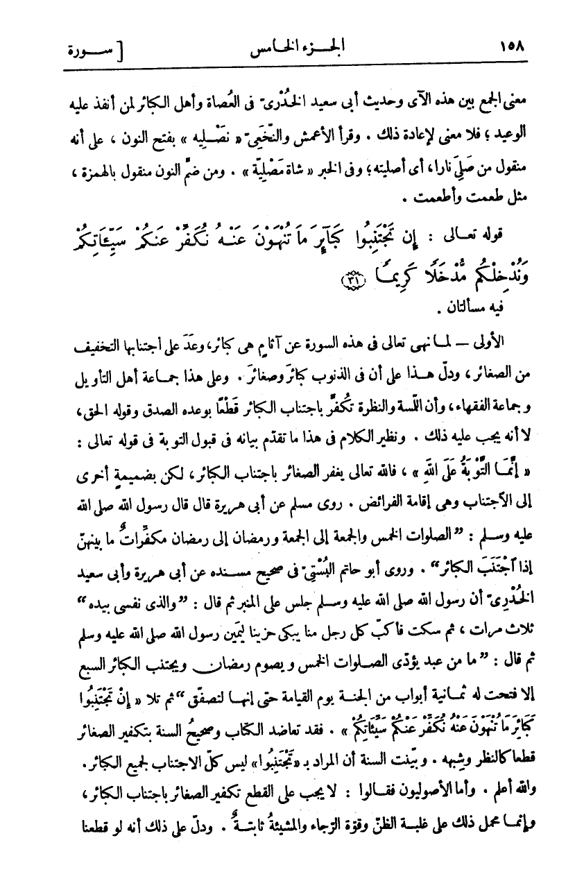 فِيهِ مَسْأَلَتَانِ: الْأُولَى- لَمَّا نَهَى تَعَالَى فِي هَذِهِ السُّورَةِ عَنْ آثَامٍ هِيَ كَبَائِرُ، وَعَدَ عَلَى اجْتِنَابِهَا التَّخْفِيفَ مِنَ الصَّغَائِرِ، وَدَلَّ هَذَا عَلَى أَنَّ فِي الذُّنُوبِ كَبَائِرَ وَصَغَائِرَ. وَعَلَى هَذَا جَمَاعَةُ أَهْلِ التَّأْوِيلِ وَجَمَاعَةُ الْفُقَهَاءِ، وَأَنَّ اللَّمْسَةَ وَالنَّظْرَةَ تُكَفَّرُ بِاجْتِنَابِ الْكَبَائِرِ قَطْعًا بِوَعْدِهِ الصِّدْقِ وَقَوْلِهِ الْحَقِّ، لَا أَنَّهُ يَجِبُ عَلَيْهِ ذَلِكَ. وَنَظِيرُ الْكَلَامِ فِي هَذَا مَا تَقَدَّمَ بَيَانُهُ فِي قَبُولِ التَّوْبَةِ فِي قَوْلِهِ تَعَالَى: (إِنَّمَا التَّوْبَةُ عَلَى اللَّهِ)، فَاللَّهُ تَعَالَى يَغْفِرُ الصَّغَائِرَ بِاجْتِنَابِ الْكَبَائِرِ، لَكِنْ بِضَمِيمَةٍ أُخْرَى إِلَى الِاجْتِنَابِ وَهِيَ إِقَامَةُ الْفَرَائِضِ. رَوَى مُسْلِمٌ عَنْ أَبِي هُرَيْرَةَ قَالَ قَالَ رَسُولُ اللَّهِ صَلَّى اللَّهُ عَلَيْهِ وَسَلَّمَ: (الصَّلَوَاتُ الْخَمْسُ وَالْجُمُعَةُ إِلَى الْجُمُعَةِ وَرَمَضَانُ إِلَى رَمَضَانَ مُكَفِّرَاتٌ مَا بَيْنَهُنَّ إِذَا اجْتَنَبَ الكبائر. وروى أبو حاتم البستي إلى صَحِيحِ مُسْنَدِهِ عَنْ أَبِي هُرَيْرَةَ وَأَبِي سَعِيدٍ الْخُدْرِيِّ أَنَّ رَسُولَ اللَّهِ صَلَّى اللَّهُ عَلَيْهِ وَسَلَّمَ جَلَسَ عَلَى الْمِنْبَرِ ثُمَّ قَالَ: (وَالَّذِي نَفْسِي بِيَدِهِ) ثَلَاثَ مَرَّاتٍ، ثُمَّ سَكَتَ فَأَكَبَّ كُلُّ رَجُلٍ مِنَّا يَبْكِي حَزِينًا لِيَمِينِ رَسُولِ اللَّهِ صَلَّى اللَّهُ عَلَيْهِ وَسَلَّمَ ثُمَّ قَالَ: (مَا مِنْ عَبْدٍ يُؤَدِّي الصَّلَوَاتِ الْخَمْسَ وَيَصُومُ رَمَضَانَ وَيَجْتَنِبُ الْكَبَائِرَ السَّبْعَ إِلَّا فُتِحَتْ لَهُ ثَمَانِيَةُ أَبْوَابٍ مِنَ الْجَنَّةِ يَوْمَ الْقِيَامَةِ حَتَّى إِنَّهَا لَتَصْفِقُ) ثُمَّ تَلَا (إِنْ تَجْتَنِبُوا كَبائِرَ مَا تُنْهَوْنَ عَنْهُ نُكَفِّرْ عَنْكُمْ سَيِّئاتِكُمْ). فَقَدْ تَعَاضَدَ الْكِتَابُ وَصَحِيحُ السُّنَّةِ بِتَكْفِيرِ الصَّغَائِرِ قَطْعًا كَالنَّظَرِ وَشَبَهِهِ. وَبَيَّنَتِ السُّنَّةُ أَنَّ الْمُرَادَ بِ (تَجْتَنِبُوا) لَيْسَ كُلُّ الِاجْتِنَابِ لِجَمِيعِ الْكَبَائِرِ. وَاللَّهُ أَعْلَمُ. وَأَمَّا الْأُصُولِيُّونَ فَقَالُوا: لَا يَجِبُ عَلَى الْقَطْعِ تَكْفِيرُ الصَّغَائِرِ بِاجْتِنَابِ الْكَبَائِرِ، وَإِنَّمَا مَحْمَلُ ذَلِكَ عَلَى غَلَبَةِ الظَّنِّ وَقُوَّةِ الرَّجَاءِ وَالْمَشِيئَةُ ثَابِتَةٌ. وَدَلَّ عَلَى ذَلِكَ أَنَّهُ لَوْ قَطَعْنَا