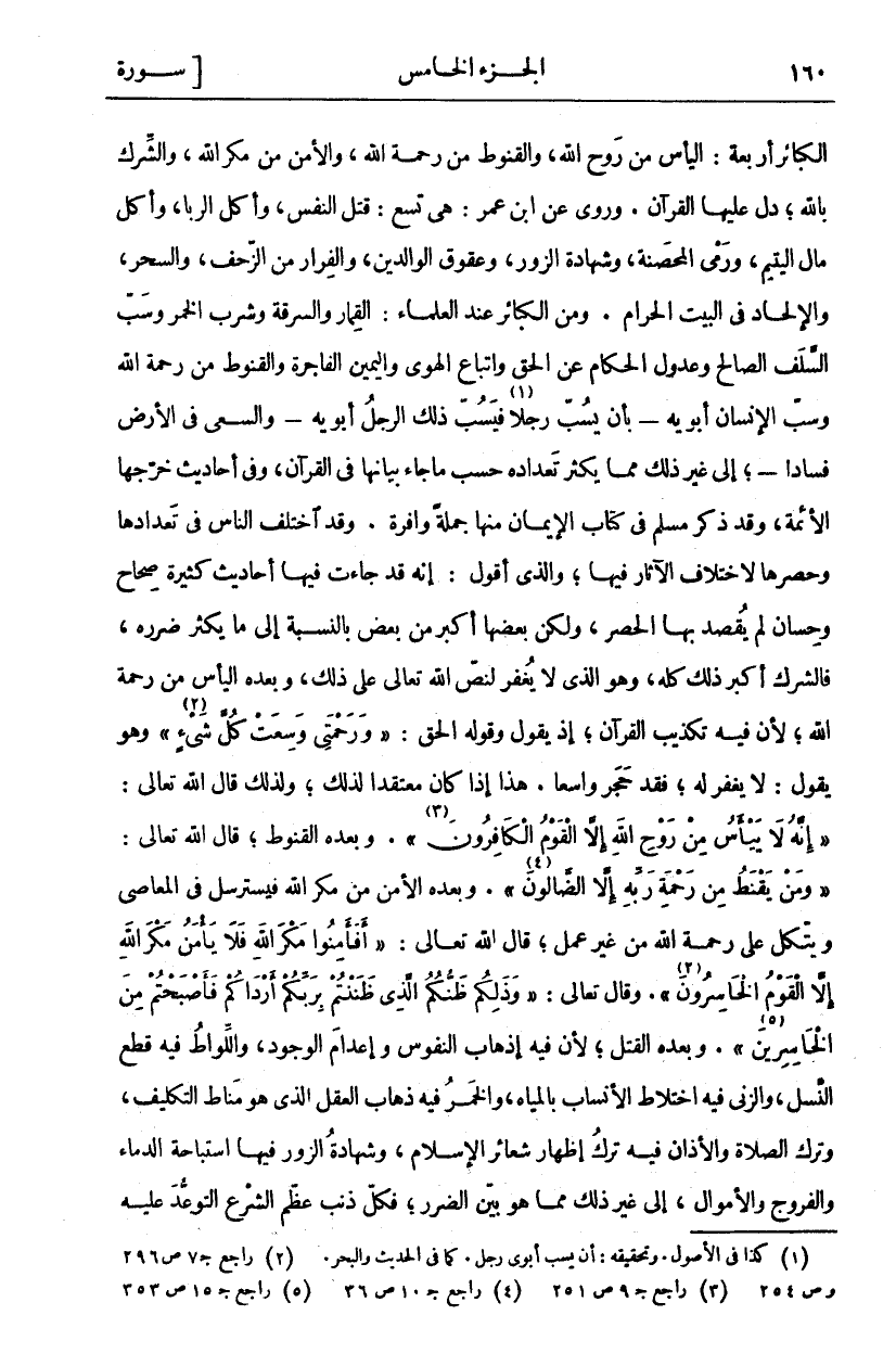 الكبائر أربعة: اليأس من روج اللَّهِ، وَالْقُنُوطُ مِنْ رَحْمَةِ اللَّهِ، وَالْأَمْنُ مِنْ مَكْرِ اللَّهِ، وَالشِّرْكُ بِاللَّهِ، دَلَّ عَلَيْهَا الْقُرْآنُ. وَرُوِيَ عَنِ ابْنِ عُمَرَ: هِيَ تِسْعٌ: قَتْلُ النَّفْسِ، وَأَكْلُ الرِّبَا، وَأَكْلُ مَالِ الْيَتِيمِ، وَرَمْيُ الْمُحْصَنَةِ، وَشَهَادَةُ الزُّورِ، وَعُقُوقُ الْوَالِدَيْنِ، وَالْفِرَارُ مِنَ الزَّحْفِ، وَالسِّحْرُ، وَالْإِلْحَادُ فِي الْبَيْتِ الْحَرَامِ. وَمِنَ الْكَبَائِرِ عِنْدَ الْعُلَمَاءِ: الْقِمَارُ وَالسَّرِقَةُ وَشُرْبُ الْخَمْرِ وَسَبُّ السَّلَفِ الصَّالِحِ وَعُدُولُ الْحُكَّامِ عَنِ الْحَقِّ وَاتِّبَاعُ الْهَوَى وَالْيَمِينُ الْفَاجِرَةُ وَالْقُنُوطُ مِنْ رَحْمَةِ اللَّهِ وَسَبُّ الْإِنْسَانِ أَبَوَيْهِ- بِأَنْ يَسُبَّ رَجُلًا «١» فَيَسُبُّ ذَلِكَ الرَّجُلُ أَبَوَيْهِ- وَالسَّعْيُ فِي الْأَرْضِ فَسَادًا-، إِلَى غَيْرِ ذَلِكَ مِمَّا يَكْثُرُ تَعْدَادُهُ حَسْبَ مَا جَاءَ بَيَانُهَا فِي الْقُرْآنِ، وَفِي أَحَادِيثَ خَرَّجَهَا الْأَئِمَّةُ، وَقَدْ ذَكَرَ مُسْلِمٌ فِي كِتَابِ الْإِيمَانِ مِنْهَا جُمْلَةً وَافِرَةً. وَقَدِ اخْتَلَفَ النَّاسُ فِي تَعْدَادِهَا وَحَصْرِهَا لِاخْتِلَافِ الْآثَارِ فِيهَا، وَالَّذِي أَقُولُ: إِنَّهُ قَدْ جَاءَتْ فِيهَا أَحَادِيثُ كَثِيرَةٌ صِحَاحٌ وَحِسَانٌ لَمْ يُقْصَدْ بِهَا الْحَصْرُ، وَلَكِنَّ بَعْضَهَا أَكْبَرُ مِنْ بَعْضٍ بِالنِّسْبَةِ إِلَى مَا يَكْثُرُ ضَرَرُهُ، فَالشِّرْكُ أَكْبَرُ ذَلِكَ كُلِّهِ، وَهُوَ الَّذِي لَا يُغْفَرُ لِنَصِّ اللَّهِ تَعَالَى عَلَى ذَلِكَ، وَبَعْدَهُ الْيَأْسُ مِنْ رَحْمَةِ اللَّهِ، لِأَنَّ فِيهِ تَكْذِيبَ الْقُرْآنِ، إِذْ يَقُولُ وَقَوْلُهُ الْحَقُّ: (وَرَحْمَتِي وَسِعَتْ كُلَّ شَيْءٍ «٢») وَهُوَ يَقُولُ: لَا يُغْفَرُ لَهُ، فَقَدْ حَجَرَ وَاسِعًا. هَذَا إِذَا كَانَ مُعْتَقِدًا لِذَلِكَ، وَلِذَلِكَ قَالَ اللَّهُ تَعَالَى: (إِنَّهُ لَا يَيْأَسُ مِنْ رَوْحِ اللَّهِ إِلَّا الْقَوْمُ الْكافِرُونَ «٣»). وَبَعْدَهُ الْقُنُوطُ، قَالَ اللَّهُ تَعَالَى: [وَمَنْ يَقْنَطُ مِنْ رَحْمَةِ رَبِّهِ إِلَّا الضَّالُّونَ «٤» [. وَبَعْدَهُ الْأَمْنُ مِنْ مَكْرِ اللَّهِ فَيَسْتَرْسِلُ فِي الْمَعَاصِي وَيَتَّكِلُ عَلَى رَحْمَةِ اللَّهِ مِنْ غَيْرِ عَمَلٍ، قَالَ اللَّهُ تَعَالَى: (أَفَأَمِنُوا مَكْرَ اللَّهِ فَلا يَأْمَنُ مَكْرَ اللَّهِ إِلَّا الْقَوْمُ الْخاسِرُونَ «٥»). وَقَالَ تَعَالَى: (وَذلِكُمْ ظَنُّكُمُ الَّذِي ظَنَنْتُمْ بِرَبِّكُمْ أَرْداكُمْ فَأَصْبَحْتُمْ مِنَ الْخاسِرِينَ «٦»). وَبَعْدَهُ الْقَتْلُ، لِأَنَّ فِيهِ إِذْهَابَ النُّفُوسِ وَإِعْدَامَ الْوُجُودِ، وَاللِّوَاطُ فِيهِ قَطْعُ النَّسْلِ، وَالزِّنَى فِيهِ اخْتِلَاطُ الْأَنْسَابِ بِالْمِيَاهِ وَالْخَمْرُ فِيهِ ذَهَابُ الْعَقْلِ الَّذِي هُوَ مَنَاطُ التَّكْلِيفِ، وَتَرْكُ الصَّلَاةِ وَالْأَذَانِ فِيهِ تَرْكُ إِظْهَارِ شَعَائِرِ الْإِسْلَامِ، وَشَهَادَةُ الزُّورِ فِيهَا اسْتِبَاحَةُ الدِّمَاءِ وَالْفُرُوجِ وَالْأَمْوَالِ، إِلَى غَيْرِ ذَلِكَ مِمَّا هُوَ بَيِّنُ الضَّرَرِ، فَكُلُّ ذَنْبٍ عَظَّمَ الشَّرْعُ التوعد عليه