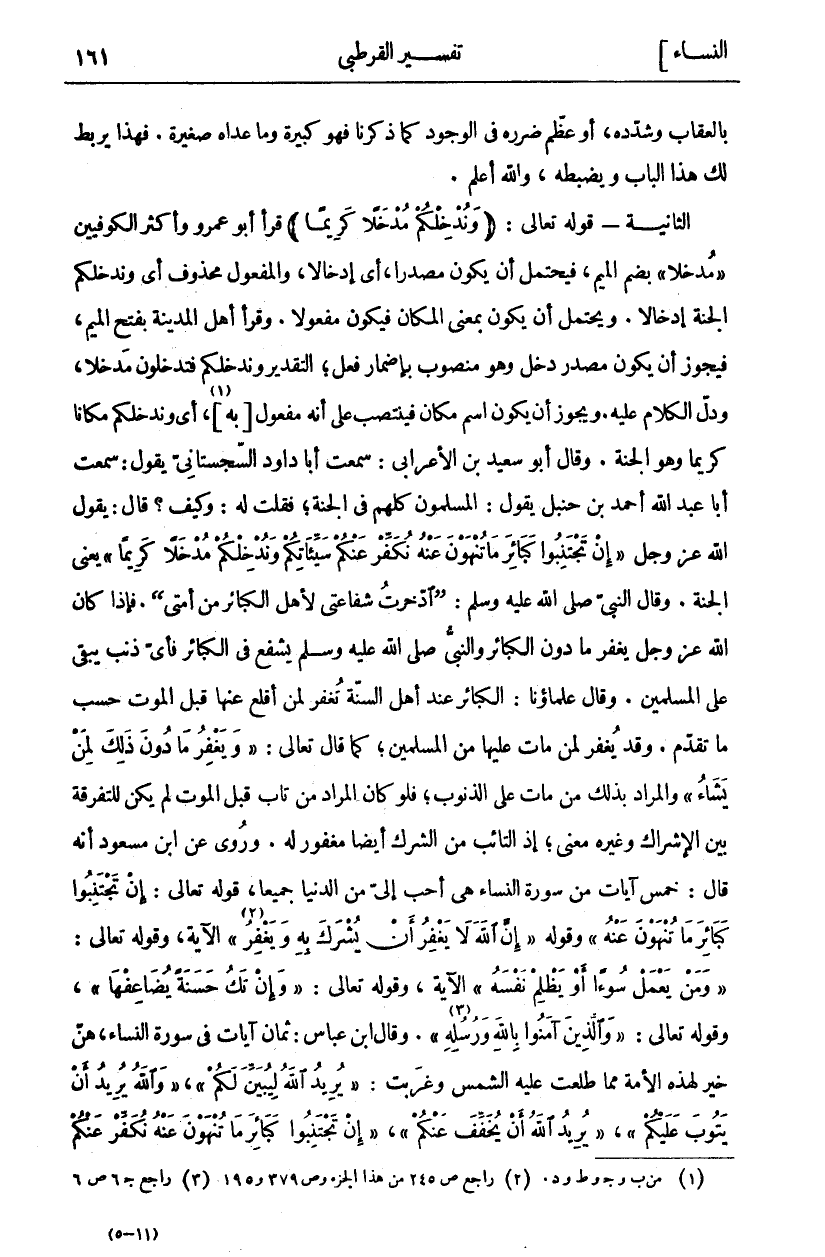 بِالْعِقَابِ وَشَدَّدَهُ، أَوْ عَظُمَ ضَرَرُهُ فِي الْوُجُودِ كَمَا ذَكَرْنَا فَهُوَ كَبِيرَةٌ وَمَا عَدَاهُ صَغِيرَةٌ. فَهَذَا يَرْبِطُ لَكَ هَذَا الْبَابَ وَيَضْبِطُهُ، وَاللَّهُ أَعْلَمُ. الثَّانِيةُ- قَوْلُهُ تَعَالَى: (وَنُدْخِلْكُمْ مُدْخَلًا كَرِيماً) قَرَأَ أَبُو عَمْرٍو وَأَكْثَرُ الْكُوفِيِّينَ (مُدْخَلًا) بِضَمِّ الْمِيمِ، فَيَحْتَمِلُ أَنْ يَكُونَ مَصْدَرًا، أَيْ إِدْخَالًا، وَالْمَفْعُولُ مَحْذُوفٌ أَيْ وَنُدْخِلُكُمُ الْجَنَّةَ إِدْخَالًا. وَيَحْتَمِلُ أَنْ يَكُونَ بِمَعْنَى الْمَكَانِ فَيَكُونُ مَفْعُولًا. وَقَرَأَ أَهْلُ الْمَدِينَةِ بِفَتْحِ الْمِيمِ، فَيَجُوزُ أَنْ يَكُونَ مَصْدَرُ دَخَلَ وَهُوَ مَنْصُوبٌ بِإِضْمَارِ فِعْلٍ، التَّقْدِيرُ وَنُدْخِلُكُمْ فَتَدْخُلُونَ مُدْخَلًا، وَدَلَّ الْكَلَامُ عَلَيْهِ. وَيَجُوزُ أَنْ يَكُونَ اسْمَ مَكَانٍ فَيَنْتَصِبُ عَلَى أَنَّهُ مَفْعُولٌ [بِهِ «١»]، أَيْ وَنُدْخِلُكُمْ مَكَانًا كَرِيمًا وَهُوَ الْجَنَّةُ. وَقَالَ أَبُو سَعِيدِ بْنُ الْأَعْرَابِيِّ: سَمِعْتُ أَبَا دَاوُدَ السِّجِسْتَانِيَّ يَقُولُ: سَمِعْتُ أَبَا عَبْدِ اللَّهِ أَحْمَدَ بْنَ حَنْبَلٍ يَقُولُ: الْمُسْلِمُونَ كُلُّهُمْ فِي الْجَنَّةِ، فَقُلْتُ لَهُ: وَكَيْفَ؟ قَالَ: يَقُولُ الله عز وجل: إِنْ تَجْتَنِبُوا كَبائِرَ مَا تُنْهَوْنَ، عَنْهُ نُكَفِّرْ عَنْكُمْ سَيِّئاتِكُمْ وَنُدْخِلْكُمْ مُدْخَلًا كَرِيماً) يَعْنِي الْجَنَّةَ. وَقَالَ النَّبِيُّ صَلَّى اللَّهُ عَلَيْهِ وَسَلَّمَ: (ادَّخَرْتُ شَفَاعَتِي لِأَهْلِ الْكَبَائِرِ مِنْ أُمَّتِي). فَإِذَا كَانَ اللَّهُ عَزَّ وَجَلَّ يَغْفِرُ مَا دُونَ الْكَبَائِرِ وَالنَّبِيُّ صَلَّى اللَّهُ عَلَيْهِ وَسَلَّمَ يَشْفَعُ فِي الْكَبَائِرِ فَأَيُّ ذَنْبٍ يَبْقَى عَلَى الْمُسْلِمِينَ. وَقَالَ عُلَمَاؤُنَا: الْكَبَائِرُ عِنْدَ أَهْلِ السُّنَّةِ تُغْفَرُ لِمَنْ أَقْلَعَ عَنْهَا قَبْلَ الْمَوْتِ حَسْبَ مَا تَقَدَّمَ. وَقَدْ يُغْفَرُ لِمَنْ مَاتَ عَلَيْهَا مِنَ الْمُسْلِمِينَ كَمَا قَالَ تَعَالَى: (وَيَغْفِرُ مَا دُونَ ذلِكَ لِمَنْ يَشاءُ) وَالْمُرَادُ بِذَلِكَ مَنْ مَاتَ عَلَى الذُّنُوبِ، فَلَوْ كَانَ الْمُرَادُ مَنْ تَابَ قَبْلَ الْمَوْتِ لَمْ يَكُنْ لِلتَّفْرِقَةِ بَيْنَ الْإِشْرَاكِ وَغَيْرِهِ مَعْنًى، إِذِ التَّائِبُ مِنَ الشِّرْكِ أَيْضًا مَغْفُورٌ لَهُ. وَرُوِيَ عَنِ ابْنِ مَسْعُودٍ أَنَّهُ قَالَ: خَمْسُ آيَاتٍ مِنْ سُورَةِ النِّسَاءِ هِيَ أَحَبُّ إِلَيَّ مِنَ الدُّنْيَا جَمِيعًا، قَوْلُهُ تَعَالَى: (إِنْ تَجْتَنِبُوا كَبائِرَ مَا تُنْهَوْنَ عَنْهُ) وَقَوْلُهُ (إِنَّ اللَّهَ لَا يَغْفِرُ أَنْ يُشْرَكَ بِهِ وَيَغْفِرُ «٢») الْآيَةَ، وَقَوْلُهُ تَعَالَى: (وَمَنْ يَعْمَلْ سُوءاً أَوْ يَظْلِمْ نَفْسَهُ)