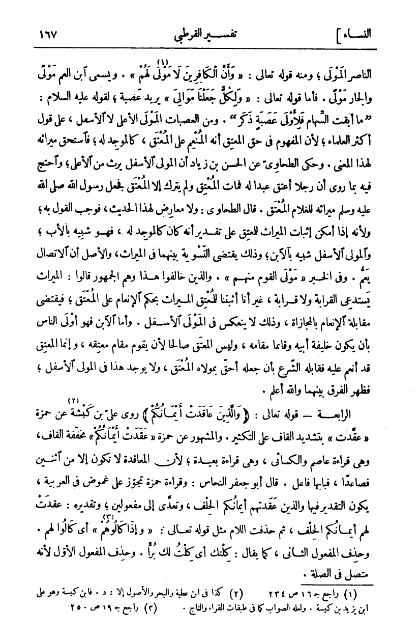 النَّاصِرُ الْمَوْلَى، وَمِنْهُ قَوْلُهُ تَعَالَى: (وَأَنَّ الْكافِرِينَ لَا مَوْلى «١» لَهُمْ). وَيُسَمَّى ابْنُ الْعَمِّ مَوْلَى وَالْجَارُ مَوْلَى. فَأَمَّا قَوْلُهُ تَعَالَى: (وَلِكُلٍّ جَعَلْنا مَوالِيَ) يُرِيدُ عَصَبَةً، لِقَوْلِهِ عَلَيْهِ السَّلَامُ: (مَا أَبْقَتِ السِّهَامُ فَلِأَوْلَى عَصَبَةٍ ذَكَرٍ). وَمِنَ الْعَصَبَاتِ الْمَوْلَى الْأَعْلَى لَا الْأَسْفَلُ، عَلَى قَوْلِ أَكْثَرِ الْعُلَمَاءِ، لِأَنَّ الْمَفْهُومَ فِي حَقِّ الْمُعْتِقِ أَنَّهُ الْمُنْعِمُ عَلَى الْمُعْتَقِ، كَالْمُوجِدِ لَهُ، فَاسْتَحَقَّ مِيرَاثَهُ لِهَذَا الْمَعْنَى. وَحَكَى الطَّحَاوِيُّ عَنِ الْحَسَنِ بْنِ زِيَادٍ أَنَّ الْمَوْلَى الْأَسْفَلَ يَرِثُ مِنَ الْأَعْلَى، وَاحْتَجَّ فِيهِ بِمَا رُوِيَ أَنَّ رَجُلًا أَعْتَقَ عبد اله فَمَاتَ الْمُعْتِقُ وَلَمْ يَتْرُكْ إِلَّا الْمُعْتَقَ فَجَعَلَ رَسُولُ اللَّهِ صَلَّى اللَّهُ عَلَيْهِ وَسَلَّمَ مِيرَاثَهُ لِلْغُلَامِ الْمُعْتَقِ. قَالَ الطَّحَاوِيُّ: وَلَا مُعَارِضَ لِهَذَا الْحَدِيثِ، فَوَجَبَ الْقَوْلُ بِهِ، وَلِأَنَّهُ إِذَا أَمْكَنَ إِثْبَاتُ الْمِيرَاثِ لِلْمُعْتِقِ عَلَى تَقْدِيرِ أَنَّهُ كَانَ كَالْمُوجِدِ لَهُ، فَهُوَ شَبِيهٌ بِالْأَبِ، وَالْمَوْلَى الْأَسْفَلُ شَبِيهٌ بِالِابْنِ، وَذَلِكَ يَقْتَضِي التَّسْوِيَةَ بَيْنَهُمَا فِي الْمِيرَاثِ، وَالْأَصْلُ أَنَّ الِاتِّصَالَ يَعُمُّ. وَفِي الْخَبَرِ (مَوْلَى الْقَوْمِ مِنْهُمْ). وَالَّذِينَ خَالَفُوا هَذَا وَهُمُ الْجُمْهُورُ قَالُوا: الْمِيرَاثُ يَسْتَدْعِي الْقَرَابَةَ وَلَا قَرَابَةَ، غَيْرَ أَنَّا أَثْبَتْنَا لِلْمُعْتِقِ الْمِيرَاثَ بِحُكْمِ الْإِنْعَامِ عَلَى الْمُعْتَقِ، فَيَقْتَضِي مُقَابَلَةَ الْإِنْعَامِ بِالْمُجَازَاةِ، وَذَلِكَ لَا يَنْعَكِسُ فِي الْمَوْلَى الْأَسْفَلِ. وَأَمَّا الِابْنُ فَهُوَ أَوْلَى النَّاسِ بِأَنْ يَكُونَ خَلِيفَةَ أَبِيهِ وَقَائِمًا مَقَامَهُ، وَلَيْسَ الْمُعْتَقُ صَالِحًا لِأَنْ يَقُومَ مَقَامَ مُعْتِقِهِ، وَإِنَّمَا الْمُعْتِقُ قَدْ أَنْعَمَ عَلَيْهِ فَقَابَلَهُ الشَّرْعُ بِأَنْ جَعَلَهُ أَحَقَّ بِمَوْلَاهُ الْمُعْتَقِ، وَلَا يُوجَدُ هَذَا فِي الْمَوْلَى الْأَسْفَلِ، فَظَهَرَ الْفَرْقُ بَيْنَهُمَا وَاللَّهُ أَعْلَمُ. الرَّابِعَةُ- قَوْلُهُ تَعَالَى: (وَالَّذِينَ عَاقَدَتْ أَيْمَانُكُمْ) رَوَى عَلِيُّ بْنُ كَبْشَةَ «٢» عَنْ حَمْزَةَ (عَقَّدَتْ) بِتَشْدِيدِ الْقَافِ عَلَى التَّكْثِيرِ. وَالْمَشْهُورُ عَنْ حَمْزَةَ (عَقَدَتْ أَيْمانُكُمْ) مُخَفَّفَةُ الْقَافِ، وَهِيَ قِرَاءَةُ عَاصِمٍ وَالْكِسَائِيِّ، وَهِيَ قِرَاءَةٌ بَعِيدَةٌ، لِأَنَّ الْمُعَاقَدَةَ لَا تَكُونُ إِلَّا مِنَ اثْنَيْنِ فَصَاعِدًا، فَبَابُهَا فَاعَلَ. قَالَ أَبُو جَعْفَرٍ النَّحَّاسُ: وَقِرَاءَةُ حَمْزَةَ تَجُوزُ عَلَى غُمُوضٍ فِي الْعَرَبِيَّةِ، يَكُونُ التَّقْدِيرُ فِيهَا وَالَّذِينَ عَقَدَتْهُمْ أَيْمَانُكُمُ الْحِلْفَ، وَتَعَدَّى إِلَى مَفْعُولَيْنِ، وَتَقْدِيرُهُ: عَقَدَتْ لَهُمْ أَيْمَانُكُمُ الْحِلْفَ، ثُمَّ حُذِفَتِ اللَّامُ مِثْلَ قَوْلِهِ تَعَالَى: (وَإِذا كالُوهُمْ «٣») أَيْ كَالُوا لَهُمْ. وَحُذِفَ الْمَفْعُولُ الثَّانِي، كَمَا يُقَالُ: كِلْتُكَ أَيْ كِلْتُ لَكَ بُرًّا. وَحُذِفَ الْمَفْعُولُ الْأَوَّلُ لِأَنَّهُ مُتَّصِلٌ فِي الصلة.