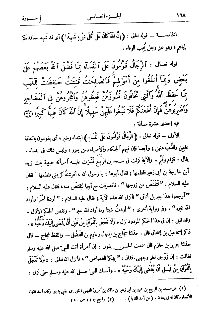 فِيهِ إِحْدَى عَشْرَةَ مَسْأَلَةً: الْأُولَى- قَوْلُهُ تَعَالَى: (الرِّجالُ قَوَّامُونَ عَلَى النِّساءِ) ابْتِدَاءٌ وَخَبَرٌ، أَيْ يَقُومُونَ بِالنَّفَقَةِ عَلَيْهِنَّ وَالذَّبِّ عَنْهُنَّ، وَأَيْضًا فَإِنَّ فِيهِمُ الْحُكَّامَ وَالْأُمَرَاءَ وَمَنْ يَغْزُو، وَلَيْسَ ذَلِكَ فِي النِّسَاءِ. يُقَالُ: قِوَامٌ وَقِيَمٌ. وَالْآيَةُ نَزَلَتْ فِي سَعْدِ بْنِ الرَّبِيعِ «١» نَشَزَتْ عَلَيْهِ امْرَأَتُهُ حَبِيبَةُ بِنْتُ زيد ابن خَارِجَةَ بْنِ أَبِي زُهَيْرٍ فَلَطَمَهَا، فَقَالَ أَبُوهَا: يَا رَسُولَ اللَّهِ، أَفْرَشْتُهُ كَرِيمَتِي فَلَطَمَهَا! فَقَالَ عَلَيْهِ السَّلَامُ: (لِتَقْتَصَّ مِنْ زَوْجِهَا). فَانْصَرَفَتْ مَعَ أَبِيهَا لِتَقْتَصَّ مِنْهُ، فَقَالَ عَلَيْهِ السَّلَامُ: (ارْجِعُوا هَذَا جِبْرِيلُ أَتَانِي) فَأَنْزَلَ اللَّهُ هَذِهِ الْآيَةَ، فَقَالَ عَلَيْهِ السَّلَامُ: (أَرَدْنَا أَمْرًا وَأَرَادَ اللَّهُ غَيْرَهُ). وَفِي رِوَايَةٍ أُخْرَى: (أَرَدْتُ شَيْئًا وَمَا أَرَادَ اللَّهُ خَيْرٌ). وَنَقَضَ الْحُكْمَ الْأَوَّلَ. وَقَدْ قِيلَ: إِنَّ فِي هَذَا الْحُكْمِ الْمَرْدُودِ نَزَلَ (وَلا تَعْجَلْ بِالْقُرْآنِ مِنْ قَبْلِ أَنْ يُقْضى إِلَيْكَ وَحْيُهُ «٢»). ذَكَرَ إِسْمَاعِيلُ بْنُ إِسْحَاقَ قَالَ: حَدَّثَنَا حَجَّاجُ بْنُ الْمِنْهَالِ وَعَارِمُ بْنُ الْفَضْلِ- وَاللَّفْظُ. لِحَجَّاجٍ- قَالَ حَدَّثَنَا جَرِيرُ بْنُ حَازِمٍ قَالَ سَمِعْتُ الْحَسَنَ يَقُولُ: إِنَّ امْرَأَةً أَتَتِ النَّبِيَّ صَلَّى اللَّهُ عَلَيْهِ وَسَلَّمَ فَقَالَتْ: إِنَّ زَوْجِي لَطَمَ وَجْهِي. فَقَالَ: (بَيْنَكُمَا الْقِصَاصُ)، فَأَنْزَلَ اللَّهُ تَعَالَى: (وَلا تَعْجَلْ بِالْقُرْآنِ مِنْ قَبْلِ أَنْ يُقْضى إِلَيْكَ وَحْيُهُ). وَأَمْسَكَ النَّبِيُّ صَلَّى اللَّهُ عَلَيْهِ وَسَلَّمَ حتى نزل: