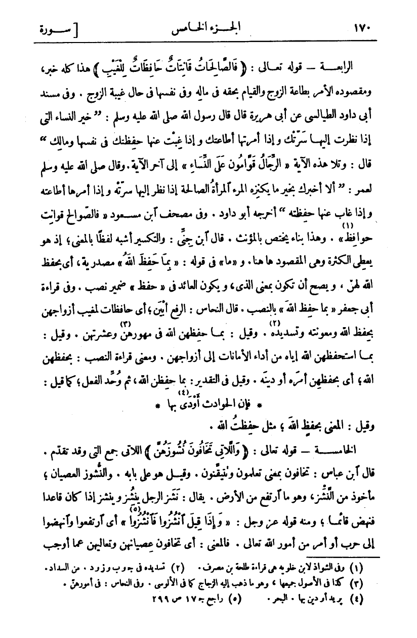 الرَّابِعَةُ- قَوْلُهُ تَعَالَى: (فَالصَّالِحاتُ قانِتاتٌ حافِظاتٌ لِلْغَيْبِ) هَذَا كُلُّهُ خَبَرٌ، وَمَقْصُودُهُ الْأَمْرُ بِطَاعَةِ الزَّوْجِ وَالْقِيَامُ بِحَقِّهِ فِي مَالِهِ وَفِي نَفْسِهَا فِي حَالِ غَيْبَةِ الزَّوْجِ. وَفِي مُسْنَدِ أَبِي دَاوُدَ الطَّيَالِسِيِّ عَنْ أَبِي هُرَيْرَةَ قَالَ قَالَ رَسُولُ اللَّهِ صَلَّى اللَّهُ عَلَيْهِ وَسَلَّمَ: (خَيْرُ النِّسَاءِ الَّتِي إِذَا نَظَرْتَ إِلَيْهَا سَرَّتْكَ وَإِذَا أَمَرْتَهَا أَطَاعَتْكَ وَإِذَا غِبْتَ عَنْهَا حَفِظَتْكَ فِي نَفْسِهَا وَمَالِكَ) قَالَ: وَتَلَا هَذِهِ الْآيَةَ (الرِّجالُ قَوَّامُونَ عَلَى النِّساءِ) إِلَى آخِرِ الْآيَةِ. وَقَالَ صَلَّى اللَّهُ عَلَيْهِ وَسَلَّمَ لِعُمَرَ: (أَلَا أُخْبِرُكَ بِخَيْرِ مَا يَكْنِزُهُ الْمَرْءُ الْمَرْأَةُ الصَّالِحَةُ إِذَا نَظَرَ إِلَيْهَا سَرَّتْهُ وَإِذَا أَمَرَهَا أَطَاعَتْهُ وَإِذَا غَابَ عَنْهَا حَفِظَتْهُ) أَخْرَجَهُ أَبُو دَاوُدَ. وَفِي مُصْحَفِ ابْنِ مَسْعُودٍ (فَالصَّوَالِحُ قَوَانِتُ حَوَافِظُ «١»). وَهَذَا بِنَاءٌ يَخْتَصُّ بِالْمُؤَنَّثِ. قَالَ ابْنُ جِنِّي: وَالتَّكْسِيرُ أَشْبَهُ لَفْظًا بِالْمَعْنَى، إِذْ هُوَ يُعْطِي الْكَثْرَةَ وَهِيَ المقصود هاهنا. و (بِما) فِي قَوْلِهِ: (بِما حَفِظَ اللَّهُ) مَصْدَرِيَّةٌ، أَيْ بِحِفْظِ اللَّهِ لَهُنَّ. وَيَصِحُّ أَنْ تَكُونَ بِمَعْنَى الَّذِي وَيَكُونُ الْعَائِدُ فِي (حَفِظَ) ضَمِيرَ نَصْبٍ. وَفِي قِرَاءَةِ أَبِي جَعْفَرٍ (بِمَا حَفِظَ اللَّهُ) بِالنَّصْبِ. قَالَ النَّحَّاسُ: الرَّفْعُ أَبْيَنُ، أَيْ حَافِظَاتٌ لِمَغِيبِ أَزْوَاجِهِنَّ بِحِفْظِ اللَّهِ وَمَعُونَتِهِ وَتَسْدِيدِهِ «٢». وَقِيلَ: بِمَا حَفِظَهُنَّ اللَّهُ فِي مُهُورِهِنَّ «٣» وَعِشْرَتِهِنَّ. وَقِيلَ: بِمَا اسْتَحْفَظَهُنَّ اللَّهُ إِيَّاهُ مِنْ أَدَاءِ الْأَمَانَاتِ إِلَى أَزْوَاجِهِنَّ. وَمَعْنَى قِرَاءَةِ النَّصْبِ: بِحِفْظِهِنَّ اللَّهَ، أَيْ بِحِفْظِهِنَّ أَمْرَهُ أَوْ دِينَهُ. وَقِيلَ فِي التَّقْدِيرِ: بِمَا حَفِظْنَ اللَّهَ، ثُمَّ وَحَّدَ الْفِعْلَ، كَمَا قِيلَ: