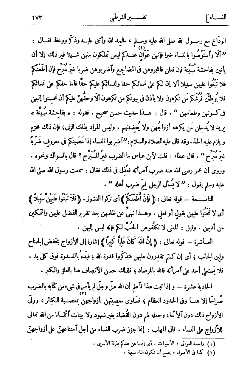 الْوَدَاعِ مَعَ رَسُولِ اللَّهِ صَلَّى اللَّهُ عَلَيْهِ وَسَلَّمَ، فَحَمِدَ اللَّهَ وَأَثْنَى عَلَيْهِ وَذَكَّرَ وَوَعَظَ فَقَالَ: (أَلَا وَاسْتَوْصُوا بِالنِّسَاءِ خَيْرًا فَإِنَّهُنَّ عَوَانٌ «١» عِنْدَكُمْ لَيْسَ تَمْلِكُونَ مِنْهُنَّ شَيْئًا غَيْرَ ذَلِكَ إِلَّا أَنْ يَأْتِينَ بِفَاحِشَةٍ مُبَيِّنَةٍ فَإِنْ فَعَلْنَ فَاهْجُرُوهُنَّ فِي الْمَضَاجِعِ وَاضْرِبُوهُنَّ ضَرْبًا غَيْرَ مُبَرِّحٍ فَإِنْ أَطَعْنَكُمْ فَلَا تَبْغُوا عَلَيْهِنَّ سَبِيلًا أَلَا إِنَّ لَكُمْ عَلَى نِسَائِكُمْ حَقًّا وَلِنِسَائِكُمْ عَلَيْكُمْ حَقًّا فَأَمَّا حَقُّكُمْ عَلَى نِسَائِكُمْ فَلَا يُوطِئْنَ فُرُشَكُمْ مَنْ تَكْرَهُونَ وَلَا يَأْذَنَّ فِي بُيُوتِكُمْ مَنْ تَكْرَهُونَ أَلَا وَحَقُّهُنَّ عَلَيْكُمْ أَنْ تُحْسِنُوا إليهن في كسوتهن وطعامهن (. قال: هَذَا حَدِيثٌ حَسَنٌ صَحِيحٌ. فَقَوْلُهُ: (بِفاحِشَةٍ مُبَيِّنَةٍ) يُرِيدُ لَا يُدْخِلْنَ مَنْ يَكْرَهُهُ أَزْوَاجُهُنَّ وَلَا يُغْضِبْنَهُمْ. وَلَيْسَ الْمُرَادُ بِذَلِكَ الزِّنَى، فَإِنَّ ذَلِكَ مُحَرَّمٌ وَيَلْزَمُ عَلَيْهِ الْحَدُّ. وَقَدْ قَالَ عَلَيْهِ الصَّلَاةُ وَالسَّلَامُ: (اضْرِبُوا النِّسَاءَ إِذَا عَصَيْنَكُمْ فِي مَعْرُوفٍ ضَرْبًا غَيْرَ مُبَرِّحٍ). قَالَ عَطَاءٌ: قُلْتُ لِابْنِ عَبَّاسٍ مَا الضَّرْبُ غَيْرُ الْمُبَرِّحِ؟ قَالَ بِالسِّوَاكِ وَنَحْوِهِ. وَرُوِيَ أَنَّ عُمَرَ رَضِيَ اللَّهُ عَنْهُ ضَرَبَ امْرَأَتَهُ فَعُذِلَ فِي ذَلِكَ فَقَالَ: سَمِعْتُ رَسُولَ اللَّهِ صَلَّى اللَّهُ عَلَيْهِ وَسَلَّمَ يَقُولُ: (لَا يُسْأَلُ الرَّجُلُ فِيمَ ضَرَبَ أَهْلَهُ). التَّاسِعَةُ- قَوْلُهُ تَعَالَى: (فَإِنْ أَطَعْنَكُمْ) أَيْ تَرَكُوا النُّشُوزَ. (فَلا تَبْغُوا عَلَيْهِنَّ سَبِيلًا) أَيْ لَا تَجْنُوا عَلَيْهِنَّ بِقَوْلٍ أَوْ فِعْلٍ. وَهَذَا نَهْيٌ عَنْ ظُلْمِهِنَّ بَعْدَ تَقْرِيرِ الْفَضْلِ عَلَيْهِنَّ وَالتَّمْكِينِ مِنْ أَدَبِهِنَّ. وَقِيلَ: الْمَعْنَى لَا تُكَلِّفُوهُنَّ الْحُبَّ لَكُمْ فَإِنَّهُ لَيْسَ إِلَيْهِنَّ. الْعَاشِرَةُ- قَوْلُهُ تَعَالَى: (إِنَّ اللَّهَ كانَ عَلِيًّا كَبِيراً) إِشَارَةٌ إِلَى الْأَزْوَاجِ بِخَفْضِ الْجَنَاحِ وَلِينِ الْجَانِبِ، أَيْ إِنْ كنتم تقذرون عَلَيْهِنَّ فَتَذَكَّرُوا قُدْرَةَ اللَّهِ، فَيَدُهُ بِالْقُدْرَةِ فَوْقَ كُلِّ يَدٍ. فَلَا يَسْتَعْلِي أَحَدٌ عَلَى امْرَأَتِهِ فَاللَّهُ بِالْمِرْصَادِ، فَلِذَلِكَ حَسُنَ الِاتِّصَافُ هُنَا بِالْعُلُوِّ وَالْكِبَرِ. الْحَادِيَةُ عَشْرَةَ- وَإِذَا ثَبَتَ هَذَا فَاعْلَمْ أَنَّ اللَّهَ عَزَّ وَجَلَّ لَمْ يَأْمُرْ فِي شي مِنْ كِتَابِهِ بِالضَّرْبِ صُرَاحًا إِلَّا هُنَا وَفِي الْحُدُودِ الْعِظَامِ، فَسَاوَى مَعْصِيَتَهُنَّ بِأَزْوَاجِهِنَّ «٢» بِمَعْصِيَةِ الْكَبَائِرِ، وَوَلَّى الْأَزْوَاجَ ذَلِكَ دُونَ الْأَئِمَّةِ، وَجَعَلَهُ لَهُمْ دُونَ الْقُضَاةِ بِغَيْرِ شُهُودٍ وَلَا بَيِّنَاتٍ ائْتِمَانًا مِنَ اللَّهِ تَعَالَى لِلْأَزْوَاجِ عَلَى النِّسَاءِ. قَالَ الْمُهَلَّبُ: إِنَّمَا جُوِّزَ ضَرْبُ النِّسَاءِ مِنْ أَجْلِ امتناعهن على أزواجهن