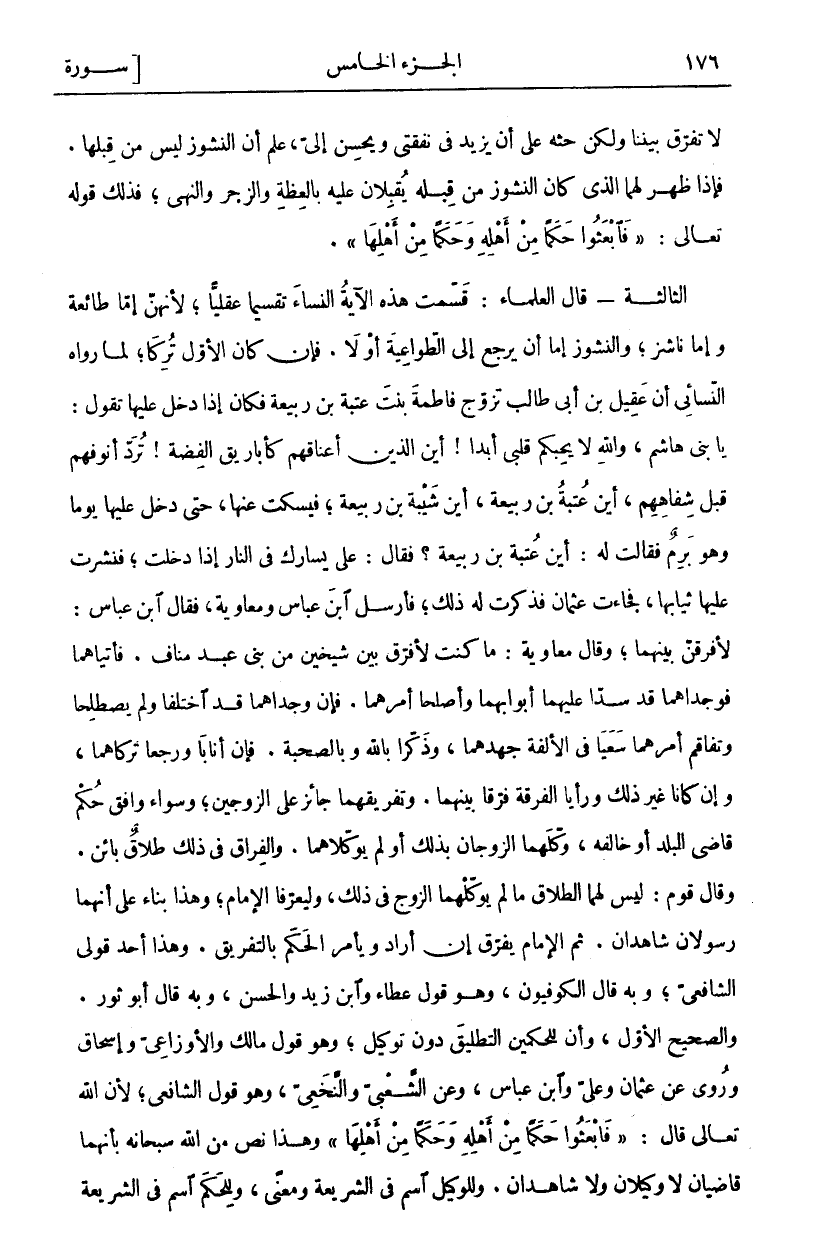 لَا تُفَرِّقْ بَيْنَنَا وَلَكِنْ حُثَّهُ عَلَى أَنْ يَزِيدَ فِي نَفَقَتِي وَيُحْسِنَ إِلَيَّ، عُلِمَ أَنَّ النُّشُوزَ لَيْسَ مِنْ قِبَلِهَا. فَإِذَا ظَهَرَ لَهُمَا الَّذِي كَانَ النُّشُوزُ مِنْ قِبَلِهِ يُقْبِلَانِ عَلَيْهِ بِالْعِظَةِ وَالزَّجْرِ وَالنَّهْيِ، فَذَلِكَ قَوْلُهُ تَعَالَى: (فَابْعَثُوا حَكَماً مِنْ أَهْلِهِ وَحَكَماً مِنْ أَهْلِها). الثَّالِثَةُ- قَالَ الْعُلَمَاءُ: قَسَّمَتْ هَذِهِ الْآيَةُ النِّسَاءَ تَقْسِيمًا عَقْلِيًّا، لِأَنَّهُنَّ إِمَّا طَائِعَةٌ وَإِمَّا نَاشِزٌ، وَالنُّشُوزُ إِمَّا أَنْ يَرْجِعَ إِلَى الطَّوَاعِيَةِ أَوْ لَا. فَإِنْ كَانَ الْأَوَّلَ تُرِكَا، لِمَا رَوَاهُ النَّسَائِيُّ أَنَّ عَقِيلَ بْنَ أَبِي طَالِبٍ تَزَوَّجَ فَاطِمَةَ بِنْتَ عُتْبَةَ بْنِ رَبِيعَةَ فَكَانَ إِذَا دَخَلَ عَلَيْهَا تَقُولُ: يَا بَنِي هَاشِمٍ، وَاللَّهِ لَا يُحِبُّكُمْ قَلْبِي أَبَدًا! أَيْنَ الَّذِينَ أَعْنَاقُهُمْ كَأَبَارِيقِ الْفِضَّةِ! تُرَدُّ أُنُوفُهُمْ قَبْلَ شِفَاهِهِمْ، أَيْنَ عُتْبَةُ بْنُ رَبِيعَةَ، أَيْنَ شَيْبَةُ بْنُ رَبِيعَةَ، فَيَسْكُتُ عَنْهَا، حَتَّى دَخَلَ عَلَيْهَا يَوْمًا وَهُوَ بَرِمٌ فَقَالَتْ لَهُ: أَيْنَ عُتْبَةُ بْنُ رَبِيعَةَ؟ فَقَالَ: عَلَى يَسَارِكِ فِي النَّارِ إِذَا دَخَلْتِ، فَنَشَرَتْ عَلَيْهَا ثِيَابَهَا، فَجَاءَتْ عُثْمَانَ فَذَكَرَتْ لَهُ ذَلِكَ، فَأَرْسَلَ ابْنَ عَبَّاسٍ وَمُعَاوِيَةَ، فَقَالَ ابْنُ عَبَّاسٍ: لا فرقن بينهما، وقال معاوية: ما كنت لا فرق بَيْنَ شَيْخَيْنِ مِنْ بَنِي عَبْدِ مَنَافٍ. فَأَتَيَاهُمَا فوجدا هما قَدْ سَدَّا عَلَيْهِمَا أَبْوَابَهُمَا وَأَصْلَحَا أَمْرَهُمَا. فَإِنْ وَجَدَاهُمَا قَدِ اخْتَلَفَا وَلَمْ يَصْطَلِحَا وَتَفَاقَمَ أَمْرُهُمَا سَعَيَا فِي الْأُلْفَةِ جَهْدَهُمَا، وَذُكِّرَا بِاللَّهِ وَبِالصُّحْبَةِ. فَإِنْ أَنَابَا وَرَجَعَا تَرَكَاهُمَا، وَإِنْ كَانَا غَيْرَ ذَلِكَ وَرَأَيَا الْفُرْقَةَ فَرَّقَا بَيْنَهُمَا. وَتَفْرِيقُهُمَا جَائِزٌ عَلَى الزَّوْجَيْنِ، وَسَوَاءً وَافَقَ حُكْمَ قَاضِي الْبَلَدِ أَوْ خَالَفَهُ، وَكَّلَهُمَا الزَّوْجَانِ بِذَلِكَ أَوْ لَمْ يُوَكِّلَاهُمَا. وَالْفِرَاقُ فِي ذَلِكَ طَلَاقٌ بَائِنٌ. وَقَالَ قَوْمٌ: لَيْسَ لَهُمَا الطَّلَاقُ مَا لَمْ يُوَكِّلْهُمَا الزَّوْجُ فِي ذَلِكَ، وَلْيُعَرِّفَا الْإِمَامَ، وَهَذَا بِنَاءٌ عَلَى أَنَّهُمَا رَسُولَانِ شَاهِدَانِ. ثُمَّ الْإِمَامُ يُفَرِّقُ إِنْ أَرَادَ وَيَأْمُرُ الْحَكَمَ بِالتَّفْرِيقِ. وَهَذَا أَحَدُ قَوْلَيِ الشَّافِعِيِّ، وَبِهِ قَالَ الْكُوفِيُّونَ، وَهُوَ قَوْلُ عَطَاءٍ وَابْنِ زَيْدٍ وَالْحَسَنِ، وَبِهِ قَالَ أَبُو ثور. والصحيح الأول، وأن لِلْحَكَمَيْنِ التَّطْلِيقَ دُونَ تَوْكِيلٍ، وَهُوَ قَوْلُ مَالِكٍ وَالْأَوْزَاعِيِّ وَإِسْحَاقَ وَرُوِيَ عَنْ عُثْمَانَ وَعَلِيٍّ وَابْنِ عَبَّاسٍ، وَعَنِ الشَّعْبِيِّ وَالنَّخَعِيِّ، وَهُوَ قَوْلُ الشَّافِعِيِّ، لِأَنَّ اللَّهَ تَعَالَى قَالَ: (فَابْعَثُوا حَكَماً مِنْ أَهْلِهِ وَحَكَماً مِنْ أَهْلِها) وَهَذَا نَصٌّ مِنَ اللَّهِ سُبْحَانَهُ بِأَنَّهُمَا قَاضِيَانِ لَا وَكِيلَانِ وَلَا شَاهِدَانِ. وَلِلْوَكِيلِ اسْمٌ فِي الشَّرِيعَةِ وَمَعْنًى، وَلِلْحَكَمِ اسْمٌ فِي الشَّرِيعَةِ