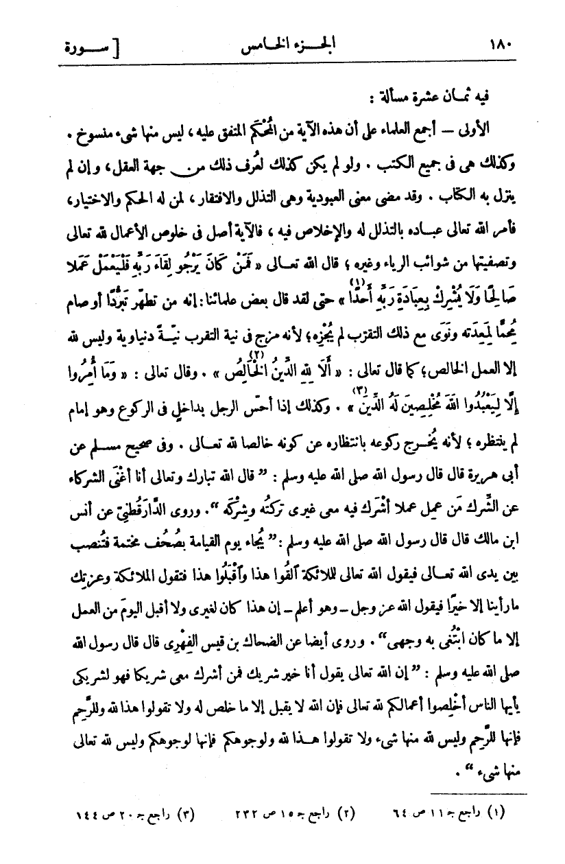 فِيهِ ثَمَانِ عَشْرَةَ مَسْأَلَةً: الْأُولَى أَجْمَعَ الْعُلَمَاءُ عَلَى أَنَّ هَذِهِ الْآيَةَ مِنَ الْمُحْكَمِ الْمُتَّفَقِ عليه، ليس منها شي مَنْسُوخٌ. وَكَذَلِكَ هِيَ فِي جَمِيعِ الْكُتُبِ. وَلَوْ لَمْ يَكُنْ كَذَلِكَ لَعُرِفَ ذَلِكَ مِنْ جِهَةِ الْعَقْلِ، وَإِنْ لَمْ يَنْزِلْ بِهِ الْكِتَابُ. وَقَدْ مَضَى مَعْنَى الْعُبُودِيَّةِ وَهِيَ التَّذَلُّلُ وَالِافْتِقَارُ، لِمَنْ لَهُ الْحُكْمُ وَالِاخْتِيَارُ، فَأَمَرَ اللَّهُ تَعَالَى عِبَادَهُ بِالتَّذَلُّلِ لَهُ وَالْإِخْلَاصِ فِيهِ، فَالْآيَةُ أَصْلٌ فِي خُلُوصِ الْأَعْمَالِ لِلَّهِ تَعَالَى وَتَصْفِيَتِهَا مِنْ شَوَائِبِ الرِّيَاءِ وَغَيْرِهِ، قَالَ اللَّهُ تَعَالَى (فَمَنْ كانَ يَرْجُوا لِقاءَ رَبِّهِ فَلْيَعْمَلْ عَمَلًا صالِحاً وَلا يُشْرِكْ بِعِبادَةِ رَبِّهِ أَحَداً «١») حَتَّى لَقَدْ قَالَ بَعْضُ عُلَمَائِنَا: إِنَّهُ مَنْ تَطَهَّرَ تَبَرُّدًا أَوْ صَامَ مُحِمًّا لِمَعِدَتِهِ وَنَوَى مَعَ ذَلِكَ التَّقَرُّبَ لَمْ يُجْزِهِ، لِأَنَّهُ مَزَجَ فِي نِيَّةِ التَّقَرُّبِ نِيَّةً دُنْيَاوِيَّةً وَلَيْسَ لِلَّهِ إِلَّا الْعَمَلُ الْخَالِصُ، كَمَا قَالَ تَعَالَى: (أَلا لِلَّهِ الدِّينُ الْخالِصُ «٢») وَقَالَ تَعَالَى: (وَما أُمِرُوا إِلَّا لِيَعْبُدُوا اللَّهَ مُخْلِصِينَ لَهُ الدِّينَ «٣»). وَكَذَلِكَ إِذَا أَحَسَّ الرَّجُلُ بِدَاخِلٍ فِي الرُّكُوعِ وَهُوَ إِمَامٌ لَمْ يَنْتَظِرْهُ، لِأَنَّهُ يُخْرِجُ رُكُوعَهُ بِانْتِظَارِهِ عَنْ كَوْنِهِ خَالِصًا لِلَّهِ تَعَالَى. وَفِي صَحِيحِ مُسْلِمٍ عَنْ أَبِي هُرَيْرَةَ قَالَ قَالَ رَسُولُ اللَّهِ صَلَّى اللَّهُ عَلَيْهِ وَسَلَّمَ: (قَالَ اللَّهُ تَبَارَكَ وَتَعَالَى أَنَا أَغْنَى الشُّرَكَاءِ عَنِ الشِّرْكِ مَنْ عَمِلَ عَمَلًا أَشْرَكَ فِيهِ مَعِي غَيْرِي تَرَكْتُهُ وَشِرْكَهُ). وَرَوَى الدَّارَقُطْنِيُّ عن أنس ابن مَالِكٍ قَالَ قَالَ رَسُولُ اللَّهِ صَلَّى اللَّهُ عَلَيْهِ وَسَلَّمَ: (يُجَاءُ يَوْمَ الْقِيَامَةِ بِصُحُفٍ مُخْتَمَةٍ فَتُنْصَبُ بَيْنَ يَدَيِ اللَّهِ تَعَالَى فَيَقُولُ اللَّهُ تَعَالَى لِلْمَلَائِكَةِ أَلْقُوا هَذَا وَاقْبَلُوا هَذَا فَتَقُولُ الْمَلَائِكَةُ وَعِزَّتِكَ مَا رَأَيْنَا إِلَّا خَيْرًا فَيَقُولُ اللَّهُ عَزَّ وَجَلَّ- وَهُوَ أَعْلَمُ- إِنَّ هَذَا كَانَ لِغَيْرِي وَلَا أَقْبَلُ الْيَوْمَ مِنَ الْعَمَلِ إِلَّا مَا كَانَ ابْتُغِيَ بِهِ وَجْهِي (. وَرُوِيَ أَيْضًا عَنِ الضَّحَّاكُ بْنُ قَيْسٍ الْفِهْرِيِّ قَالَ قَالَ رَسُولُ اللَّهِ صَلَّى اللَّهُ عَلَيْهِ وَسَلَّمَ:) إِنَّ اللَّهَ تَعَالَى يَقُولُ أَنَا خَيْرُ شَرِيكٍ فَمَنْ أَشْرَكَ مَعِي شَرِيكًا فَهُوَ لِشَرِيكِي يَا أَيُّهَا النَّاسُ أَخْلِصُوا أَعْمَالَكُمْ لِلَّهِ تَعَالَى فَإِنَّ اللَّهَ لَا يَقْبَلُ إِلَّا مَا خَلَصَ لَهُ وَلَا تَقُولُوا هَذَا لِلَّهِ وَلِلرَّحِمِ فَإِنَّهَا لِلرَّحِمِ وَلَيْسَ لله منها شي وَلَا تَقُولُوا هَذَا لِلَّهِ وَلِوُجُوهِكُمْ فَإِنَّهَا لِوُجُوهِكُمْ وليس لله تعالى منها شي).