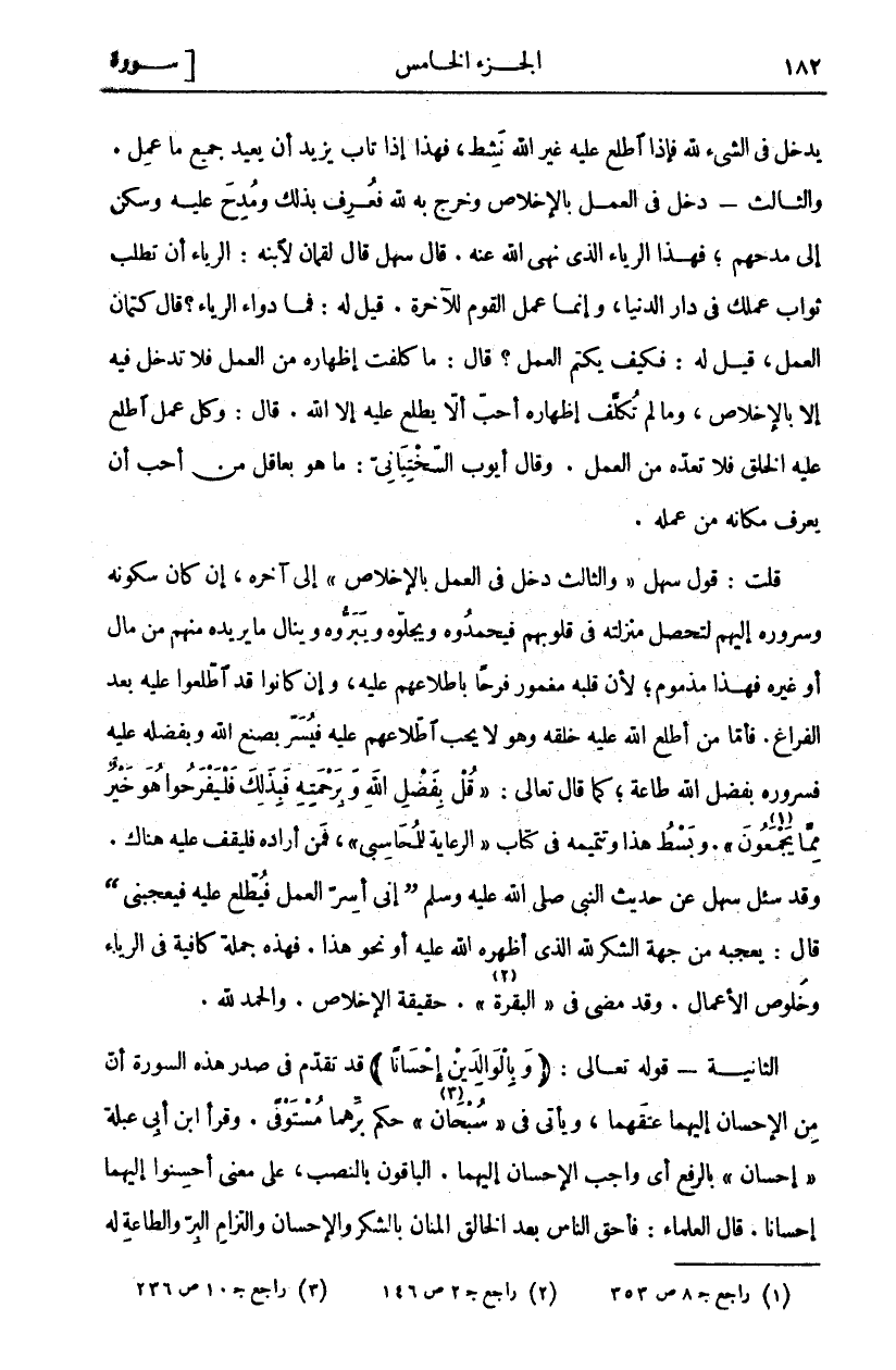 يَدْخُلُ فِي الشَّيْءِ لِلَّهِ فَإِذَا اطَّلَعَ عَلَيْهِ غَيْرُ اللَّهِ نَشِطَ، فَهَذَا إِذَا تَابَ يَزِيدُ أَنْ يُعِيدَ جَمِيعَ مَا عَمِلَ. وَالثَّالِثُ- دَخَلَ فِي الْعَمَلِ بِالْإِخْلَاصِ وَخَرَجَ بِهِ لِلَّهِ فَعُرِفَ بِذَلِكَ وَمُدِحَ عَلَيْهِ وَسَكَنَ إِلَى مَدْحِهِمْ، فَهَذَا الرِّيَاءُ الَّذِي نَهَى اللَّهُ عَنْهُ. قَالَ سَهْلٌ قَالَ لُقْمَانُ لِابْنِهِ: الرِّيَاءُ أَنْ تَطْلُبَ ثَوَابَ عَمَلِكَ فِي دَارِ الدُّنْيَا، وَإِنَّمَا عَمَلُ الْقَوْمِ لِلْآخِرَةِ. قِيلَ لَهُ: فَمَا دَوَاءُ الرِّيَاءِ؟ قَالَ كِتْمَانُ الْعَمَلِ، قِيلَ لَهُ: فَكَيْفَ يُكْتَمُ الْعَمَلُ؟ قَالَ: مَا كُلِّفْتَ إِظْهَارَهُ مِنَ الْعَمَلِ فَلَا تَدْخُلْ فِيهِ إِلَّا بِالْإِخْلَاصِ، وَمَا لَمْ تُكَلَّفْ إِظْهَارَهُ أَحَبُّ أَلَّا يَطَّلِعَ عَلَيْهِ إِلَّا اللَّهُ. قَالَ: وَكُلُّ عَمَلٍ اطَّلَعَ عَلَيْهِ الْخَلْقُ فَلَا تَعُدُّهُ مِنَ الْعَمَلِ. وَقَالَ أَيُّوبُ السِّخْتِيَانِيُّ: مَا هُوَ بِعَاقِلٍ مَنْ أَحَبَّ أَنْ يَعْرِفَ مَكَانَهُ مِنْ عَمَلِهِ. قُلْتُ: قَوْلُ سَهْلٍ (وَالثَّالِثُ دَخَلَ فِي الْعَمَلِ بِالْإِخْلَاصِ) إِلَى آخِرِهِ، إِنْ كَانَ سُكُونُهُ وَسُرُورُهُ إِلَيْهِمْ لِتَحْصُلَ مَنْزِلَتُهُ فِي قُلُوبِهِمْ فيحمدوه ويجلوه ويبرؤه وَيَنَالَ مَا يُرِيدُهُ مِنْهُمْ مِنْ مَالٍ أَوْ غَيْرِهِ فَهَذَا مَذْمُومٌ، لِأَنَّ قَلْبَهُ مَغْمُورٌ فَرَحًا بِاطِّلَاعِهِمْ عَلَيْهِ، وَإِنْ كَانُوا قَدِ اطَّلَعُوا عَلَيْهِ بَعْدَ الْفَرَاغِ. فَأَمَّا مَنْ أَطْلَعَ اللَّهُ عَلَيْهِ خَلْقَهُ وَهُوَ لَا يُحِبُّ اطِّلَاعَهُمْ عَلَيْهِ فَيُسَرُّ بِصُنْعِ اللَّهِ وَبِفَضْلِهِ عَلَيْهِ فَسُرُورُهُ بِفَضْلِ اللَّهِ طَاعَةٌ، كَمَا قَالَ تَعَالَى: (قُلْ بِفَضْلِ اللَّهِ وَبِرَحْمَتِهِ فَبِذلِكَ فَلْيَفْرَحُوا هُوَ خَيْرٌ مِمَّا يَجْمَعُونَ «١»). وَبَسْطُ هَذَا وَتَتْمِيمُهُ فِي كِتَابِ (الرِّعَايَةِ لِلْمُحَاسِبِيِّ)، فَمَنْ أَرَادَهُ فَلْيَقِفْ عَلَيْهِ هُنَاكَ. وَقَدْ سُئِلَ سَهْلٌ عَنْ حَدِيثِ النَّبِيِّ صَلَّى اللَّهُ عَلَيْهِ وَسَلَّمَ (أَنِّي أُسِرُّ الْعَمَلَ فَيُطَّلَعُ عَلَيْهِ فَيُعْجِبُنِي) قَالَ: يُعْجِبُهُ مِنْ جِهَةِ الشُّكْرِ لِلَّهِ الَّذِي أَظْهَرَهُ اللَّهُ عَلَيْهِ أَوْ نَحْوَ هَذَا. فَهَذِهِ جُمْلَةٌ كَافِيَةٌ فِي الرِّيَاءِ وَخُلُوصِ الْأَعْمَالِ. وَقَدْ مَضَى فِي (الْبَقَرَةِ «٢»). حَقِيقَةُ الْإِخْلَاصِ. وَالْحَمْدُ لِلَّهِ. الثَّانِيةُ- قَوْلُهُ تَعَالَى: (وَبِالْوالِدَيْنِ إِحْساناً) قَدْ تَقَدَّمَ فِي صَدْرِ هَذِهِ السُّورَةِ أَنَّ مِنَ الْإِحْسَانِ إِلَيْهِمَا عِتْقَهُمَا، وَيَأْتِي فِي (سُبْحَانَ «٣») حُكْمُ بِرِّهِمَا مُسْتَوْفًى. وَقَرَأَ ابْنُ أَبِي عَبْلَةَ (إِحْسَانٌ) بِالرَّفْعِ أَيْ وَاجِبٌ الْإِحْسَانُ إِلَيْهِمَا. الْبَاقُونَ بِالنَّصْبِ، عَلَى مَعْنَى أَحْسِنُوا إِلَيْهِمَا إِحْسَانًا. قَالَ الْعُلَمَاءُ: فَأَحَقُّ النَّاسِ بَعْدَ الْخَالِقِ الْمَنَّانِ بِالشُّكْرِ وَالْإِحْسَانِ وَالْتِزَامِ البر والطاعة له
