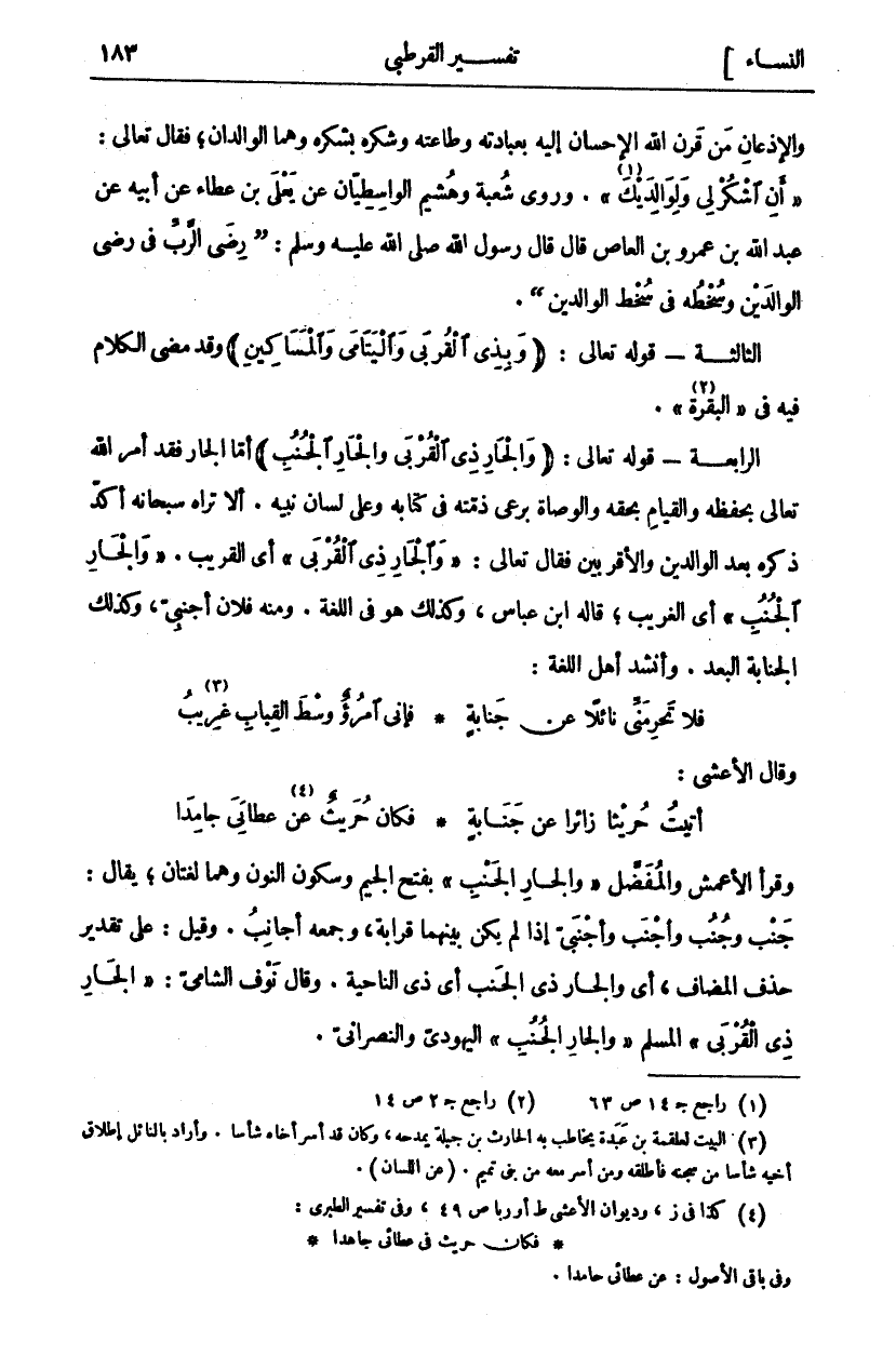 وَالْإِذْعَانِ مَنْ قَرَنَ اللَّهُ الْإِحْسَانَ إِلَيْهِ بِعِبَادَتِهِ وَطَاعَتِهِ وَشُكْرِهِ بِشُكْرِهِ وَهُمَا الْوَالِدَانِ، فَقَالَ تَعَالَى: (أَنِ اشْكُرْ لِي وَلِوالِدَيْكَ «١»). وَرَوَى شُعْبَةُ وَهُشَيْمٌ الْوَاسِطِيَّانِ عَنْ يَعْلَى بْنِ عَطَاءٍ عَنْ أَبِيهِ عَنْ عَبْدِ اللَّهِ بْنِ عَمْرٍو بْنِ الْعَاصِ قَالَ قَالَ رَسُولُ اللَّهِ صَلَّى اللَّهُ عَلَيْهِ وَسَلَّمَ: (رضى الرب في رضى الْوَالِدَيْنِ وَسُخْطُهُ فِي سُخْطِ الْوَالِدَيْنِ). الثَّالِثَةُ- قَوْلُهُ تَعَالَى: (وَبِذِي الْقُرْبى وَالْيَتامى وَالْمَساكِينِ) وَقَدْ مَضَى الْكَلَامُ فِيهِ فِي (الْبَقَرَةِ «٢»). الرَّابِعَةُ- قَوْلُهُ تَعَالَى: (وَالْجارِ ذِي الْقُرْبى وَالْجارِ الْجُنُبِ) أَمَّا الْجَارُ فَقَدْ أَمَرَ اللَّهُ تَعَالَى بِحِفْظِهِ وَالْقِيَامِ بِحَقِّهِ وَالْوَصَاةِ بِرَعْيِ ذِمَّتِهِ فِي كِتَابِهِ وَعَلَى لِسَانِ نَبِيِّهِ. أَلَا تَرَاهُ سُبْحَانَهُ أَكَّدَ ذِكْرَهُ بَعْدَ الْوَالِدَيْنِ وَالْأَقْرَبِينَ فَقَالَ تَعَالَى: (وَالْجارِ ذِي الْقُرْبى) أَيِ الْقَرِيبِ. (وَالْجارِ الْجُنُبِ) أَيِ الْغَرِيبِ، قَالَهُ ابْنُ عَبَّاسٍ، وَكَذَلِكَ هُوَ فِي اللُّغَةِ. وَمِنْهُ فُلَانٌ أَجْنَبِيٌّ، وَكَذَلِكَ الْجَنَابَةُ الْبُعْدُ. وَأَنْشَدَ أَهْلُ اللُّغَةِ: