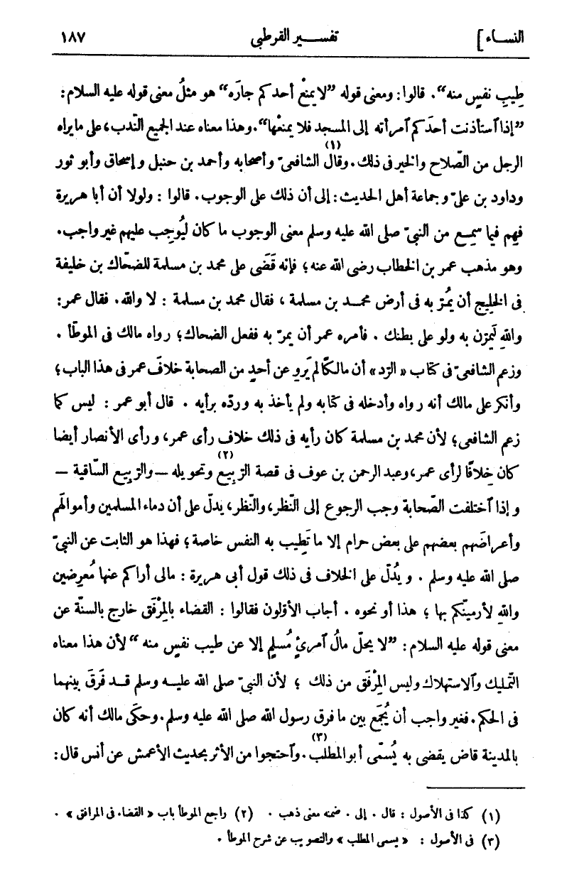 طِيبٍ نَفْسٍ مِنْهُ (. قَالُوا: وَمَعْنَى قَوْلِهِ (لَا يَمْنَعُ أَحَدُكُمْ جَارَهُ) هُوَ مِثْلُ مَعْنَى قَوْلِهِ عَلَيْهِ السَّلَامُ: (إِذَا اسْتَأْذَنَتْ أَحَدَكُمُ امْرَأَتُهُ إِلَى الْمَسْجِدِ فَلَا يَمْنَعْهَا). وَهَذَا مَعْنَاهُ عِنْدَ الْجَمِيعِ النَّدْبُ، عَلَى مَا يَرَاهُ الرَّجُلُ مِنَ الصَّلَاحِ وَالْخَيْرِ فِي ذَلِكَ. وَقَالَ «١» الشَّافِعِيُّ وَأَصْحَابُهُ وَأَحْمَدُ بْنُ حَنْبَلٍ وَإِسْحَاقُ وَأَبُو ثَوْرٍ وَدَاوُدُ بْنُ عَلِيٍّ وَجَمَاعَةُ أَهْلِ الْحَدِيثِ: إِلَى أَنَّ ذَلِكَ عَلَى الْوُجُوبِ. قَالُوا: وَلَوْلَا أَنَّ أَبَا هُرَيْرَةَ فَهِمَ فِيمَا سَمِعَ مِنَ النَّبِيِّ صَلَّى اللَّهُ عَلَيْهِ وَسَلَّمَ مَعْنَى الْوُجُوبِ مَا كَانَ لِيُوجِبَ عَلَيْهِمْ غَيْرَ وَاجِبٍ. وَهُوَ مَذْهَبُ عُمَرَ بْنِ الْخَطَّابِ رَضِيَ اللَّهُ عَنْهُ، فَإِنَّهُ قَضَى عَلَى مُحَمَّدِ بْنِ مَسْلَمَةَ لِلضَّحَّاكِ بْنِ خَلِيفَةَ فِي الْخَلِيجِ أَنْ يَمُرَّ بِهِ فِي أَرْضِ مُحَمَّدِ بْنِ مَسْلَمَةَ، فَقَالَ مُحَمَّدُ بْنُ مَسْلَمَةَ: لَا وَاللَّهِ. فَقَالَ عُمَرُ: وَاللَّهِ لَيَمُرَّنَّ بِهِ وَلَوْ عَلَى بَطْنِكَ. فَأَمَرَهُ عُمَرُ أَنْ يَمُرَّ بِهِ فَفَعَلَ الضَّحَّاكُ رَوَاهُ مَالِكٌ فِي الْمُوَطَّأِ. وَزَعَمَ الشَّافِعِيُّ فِي كِتَابِ (الرَّدِّ) أَنَّ مَالِكًا لَمْ يَرْوِ عَنْ أَحَدٍ مِنَ الصَّحَابَةِ خِلَافَ عُمَرَ فِي هَذَا الْبَابِ، وَأَنْكَرَ عَلَى مَالِكٍ أَنَّهُ رَوَاهُ وَأَدْخَلَهُ فِي كِتَابِهِ وَلَمْ يَأْخُذْ بِهِ وَرَدَّهُ بِرَأْيِهِ. قَالَ أَبُو عُمَرَ: لَيْسَ كَمَا زَعَمَ الشَّافِعِيُّ، لِأَنَّ مُحَمَّدَ بْنَ مَسْلَمَةَ كَانَ رَأْيُهُ فِي ذَلِكَ خِلَافَ رَأْيِ عُمَرَ، وَرَأْيُ الْأَنْصَارِ أَيْضًا كَانَ خِلَافًا لِرَأْيِ عُمَرَ، وَعَبْدِ الرَّحْمَنِ بْنِ عَوْفٍ فِي قِصَّةِ الرَّبِيعِ «٢» وَتَحْوِيلِهِ- وَالرَّبِيعُ السَّاقِيَّةُ- وَإِذَا اخْتَلَفَتِ الصَّحَابَةُ وَجَبَ الرُّجُوعُ إِلَى النَّظَرِ، وَالنَّظَرُ، يَدُلُّ عَلَى أَنَّ دِمَاءَ الْمُسْلِمِينَ وَأَمْوَالَهُمْ وَأَعْرَاضَهُمْ بَعْضُهُمْ عَلَى بَعْضٍ حَرَامٌ إِلَّا مَا تَطِيبُ بِهِ النَّفْسُ خَاصَّةً، فَهَذَا هُوَ الثَّابِتِ عَنِ النَّبِيِّ صَلَّى اللَّهُ عَلَيْهِ وَسَلَّمَ. وَيَدُلُّ عَلَى الْخِلَافِ فِي ذَلِكَ قَوْلُ أَبِي هُرَيْرَةَ: مَا لِي أَرَاكُمْ عَنْهَا مُعْرِضِينَ وَاللَّهِ لَأَرْمِيَنَّكُمْ بِهَا، هَذَا أَوْ نَحْوُهُ. أَجَابَ الْأَوَّلُونَ فَقَالُوا: الْقَضَاءُ بِالْمِرْفَقِ خَارِجٌ بِالسُّنَّةِ عَنْ مَعْنَى قَوْلِهِ عَلَيْهِ السَّلَامُ: (لَا يَحِلُّ مَالُ امْرِئٍ مُسْلِمٍ إلا عن طيب نفس منه) لِأَنَّ هَذَا مَعْنَاهُ التَّمْلِيكُ وَالِاسْتِهْلَاكُ وَلَيْسَ الْمِرْفَقُ مِنْ ذَلِكَ، لِأَنَّ النَّبِيَّ صَلَّى اللَّهُ عَلَيْهِ وَسَلَّمَ قَدْ فَرَّقَ بَيْنَهُمَا فِي الْحُكْمِ. فَغَيْرُ وَاجِبٍ أَنْ يُجْمَعَ بَيْنَ مَا فَرَقَ رَسُولُ اللَّهِ صَلَّى اللَّهُ عَلَيْهِ وَسَلَّمَ. وَحَكَى مَالِكٌ أَنَّهُ كَانَ بِالْمَدِينَةِ قَاضٍ يَقْضِي بِهِ يُسَمَّى أَبُو الْمُطَّلِبِ «٣». وَاحْتَجُّوا مِنَ الْأَثَرِ بِحَدِيثِ الْأَعْمَشِ عن أنس قال: