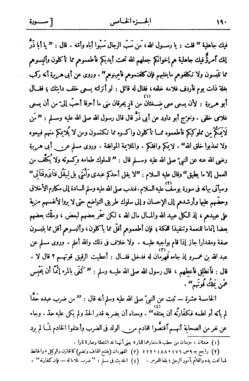 فِيكَ جَاهِلِيَّةٌ) قُلْتُ: يَا رَسُولَ اللَّهِ، مَنْ سَبَّ الرِّجَالَ سَبُّوا أَبَاهُ وَأُمَّهُ. قَالَ: (يَا أَبَا ذَرٍّ إِنَّكَ امْرُؤٌ فِيكَ جَاهِلِيَّةٌ هُمْ إِخْوَانُكُمْ جَعَلَهُمُ اللَّهُ تَحْتَ أَيْدِيكُمْ فَأَطْعِمُوهُمْ مِمَّا تَأْكُلُونَ وَأَلْبِسُوهُمْ مِمَّا تَلْبَسُونَ وَلَا تُكَلِّفُوهُمْ مَا يَغْلِبُهُمْ فَإِنْ كَلَّفْتُمُوهُمْ فَأَعِينُوهُمْ (. وَرُوِيَ عَنِ أَبِي هُرَيْرَةَ أَنَّهُ رَكِبَ بَغْلَةً ذَاتَ يَوْمٍ فَأَرْدَفَ غُلَامَهُ خَلْفَهُ، فَقَالَ لَهُ قَائِلٌ: لَوْ أَنْزَلْتَهُ يَسْعَى خَلْفَ دَابَّتِكَ، فَقَالَ أَبُو هُرَيْرَةَ: لَأَنْ يَسْعَى مَعِي ضِغْثَانِ «١» مِنْ نَارٍ يُحْرِقَانِ مِنِّي مَا أَحْرَقَا أَحَبُّ إِلَيَّ مِنْ أَنْ يَسْعَى غُلَامِي خَلْفِي. وَخَرَّجَ أَبُو دَاوُدَ عَنْ أَبِي ذَرٍّ قَالَ قَالَ رَسُولُ اللَّهِ صَلَّى اللَّهُ عَلَيْهِ وَسَلَّمَ: (مَنْ لَايَمَكُمْ مِنْ مَمْلُوكِيكُمْ فَأَطْعِمُوهُ مِمَّا تَأْكُلُونَ وَاكْسُوهُ مِمَّا تَكْتَسُونَ وَمَنْ لَا يلائمكم مِنْهُمْ فَبِيعُوهُ وَلَا تُعَذِّبُوا خَلْقَ اللَّهِ (. لَايَمَكُمْ وافقكم. والملائمة الْمُوَافَقَةُ. وَرَوَى مُسْلِمٌ عَنْ أَبِي هُرَيْرَةَ رَضِيَ اللَّهُ عَنْهُ عَنِ النَّبِيِّ صَلَّى اللَّهُ عَلَيْهِ وَسَلَّمَ قَالَ:) لِلْمَمْلُوكِ طَعَامُهُ وَكِسْوَتُهُ وَلَا يُكَلَّفُ مِنَ الْعَمَلِ إِلَّا مَا يُطِيقُ) وَقَالَ عَلَيْهِ السَّلَامُ: (لَا يَقُلْ أَحَدُكُمْ عَبْدِي وَأَمَتِي بَلْ لِيَقُلْ فَتَايَ وَفَتَاتِي) وَسَيَأْتِي بَيَانُهُ فِي سُورَةِ يُوسُفَ «٢» عَلَيْهِ السَّلَامُ. فَنَدَبَ صَلَّى اللَّهُ عَلَيْهِ وَسَلَّمَ السَّادَةَ إِلَى مَكَارِمِ الْأَخْلَاقِ وَحَضَّهُمْ عَلَيْهَا وَأَرْشَدَهُمْ إِلَى الْإِحْسَانِ وَإِلَى سُلُوكِ طَرِيقِ التَّوَاضُعِ حتى لا يرو الا نفسهم مَزِيَّةً عَلَى عَبِيدِهِمْ، إِذِ الْكُلُّ عَبِيدُ اللَّهِ وَالْمَالُ مَالُ اللَّهِ، لَكِنْ سَخَّرَ بَعْضَهُمْ لِبَعْضٍ، وَمَلَّكَ بَعْضَهُمْ بَعْضًا إِتْمَامًا لِلنِّعْمَةِ وَتَنْفِيذًا لِلْحِكْمَةِ، فَإِنْ أَطْعَمُوهُمْ أَقَلَّ مِمَّا يَأْكُلُونَ، وَأَلْبَسُوهُمْ أَقَلَّ مِمَّا يَلْبَسُونَ صِفَةً وَمِقْدَارًا جَازَ إِذَا قَامَ بِوَاجِبِهِ عَلَيْهِ. وَلَا خِلَافَ فِي ذَلِكَ وَاللَّهُ أَعْلَمُ. وَرَوَى مُسْلِمٌ عَنْ عَبْدِ اللَّهِ بْنِ عَمْرٍو إِذْ جَاءَهُ قَهْرَمَانٌ «٣» لَهُ فَدَخَلَ فَقَالَ: أَعْطَيْتُ الرَّقِيقَ قُوتَهُمْ؟ قَالَ لَا. قَالَ: فَانْطَلِقْ فَأَعْطِهِمْ، قَالَ رَسُولُ اللَّهِ صَلَّى اللَّهُ عَلَيْهِ وَسَلَّمَ: (كَفَى بِالْمَرْءِ إِثْمًا أَنْ يَحْبِسَ عَمَّنْ يَمْلُكُ قُوتَهُمْ). الْخَامِسَةُ عَشْرَةَ- ثَبَتَ عَنِ النَّبِيِّ صَلَّى اللَّهُ عَلَيْهِ وَسَلَّمَ أَنَّهُ قَالَ: (مَنْ ضَرَبَ عَبْدَهُ حَدًّا لَمْ يَأْتِهِ أَوْ لَطَمَهُ فَكَفَّارَتُهُ أَنْ يُعْتِقَهُ «٤»). وَمَعْنَاهُ أَنْ يَضْرِبَهُ قَدْرَ الْحَدِّ وَلَمْ يَكُنْ عَلَيْهِ حَدٌّ. وَجَاءَ عَنْ نَفَرٍ مِنَ الصَّحَابَةِ أَنَّهُمُ اقْتَصُّوا لِلْخَادِمِ مِنَ الْوَلَدِ فِي الضَّرْبِ وَأَعْتَقُوا الْخَادِمَ لَمَّا لَمْ يرد