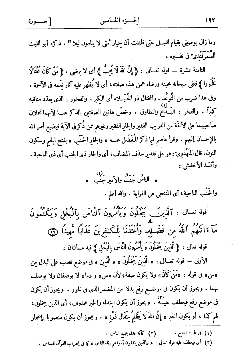 قَوْلُهُ تَعَالَى: (الَّذِينَ يَبْخَلُونَ وَيَأْمُرُونَ النَّاسَ بِالْبُخْلِ) فِيهِ مَسْأَلَتَانِ: الْأُولَى- قَوْلُهُ تَعَالَى: (الَّذِينَ يَبْخَلُونَ) (الَّذِينَ) فِي مَوْضِعِ نَصْبٍ عَلَى الْبَدَلِ مِنْ (مَنْ) فِي قَوْلِهِ: (مَنْ كانَ) وَلَا يَكُونُ صِفَةً، لِأَنَّ (مَنْ) وَ (مَا) لَا يُوصَفَانِ وَلَا يُوصَفُ بِهِمَا. وَيَجُوزُ أَنْ يَكُونَ فِي مَوْضِعِ رَفْعٍ بَدَلًا مِنَ الْمُضْمَرِ الَّذِي فِي فَخُورٍ. وَيَجُوزُ أَنْ يَكُونَ فِي مَوْضِعِ رَفْعٍ فَيُعْطَفُ عَلَيْهِ «٣». وَيَجُوزُ أَنْ يَكُونَ ابْتِدَاءً وَالْخَبَرُ مَحْذُوفٌ، أَيِ الَّذِينَ يَبْخَلُونَ، لَهُمْ كَذَا، أَوْ يَكُونُ الْخَبَرُ (إِنَّ اللَّهَ لَا يَظْلِمُ مِثْقالَ ذَرَّةٍ). وَيَجُوزُ أَنْ يَكُونَ مَنْصُوبًا بِإِضْمَارٍ