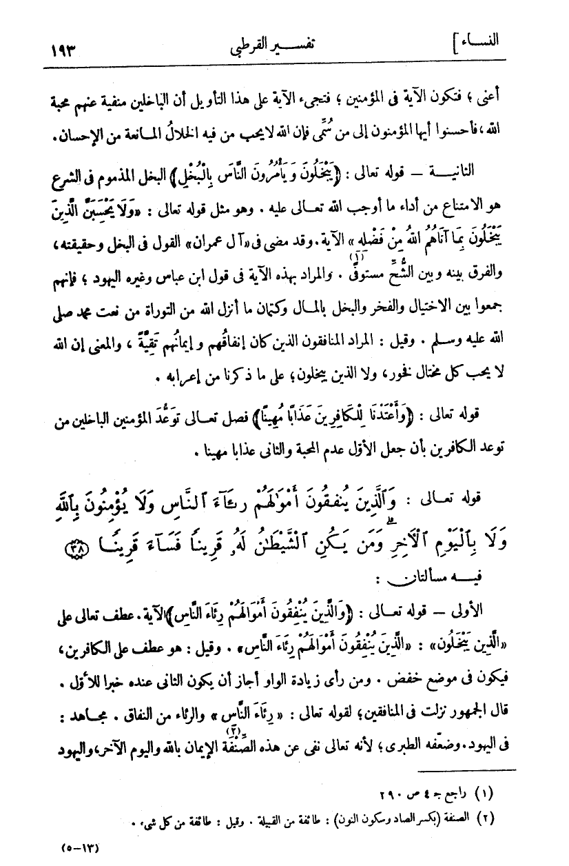 فِيهِ مَسْأَلَتَانِ: الْأُولَى- قَوْلُهُ تَعَالَى: (وَالَّذِينَ يُنْفِقُونَ أَمْوالَهُمْ رِئاءَ النَّاسِ) الْآيَةَ. عَطَفَ تَعَالَى عَلَى (الَّذِينَ يَبْخَلُونَ): (الَّذِينَ يُنْفِقُونَ أَمْوالَهُمْ رِئاءَ النَّاسِ). وَقِيلَ: هُوَ عَطْفٌ عَلَى الْكَافِرِينَ، فَيَكُونُ فِي مَوْضِعِ خَفْضٍ. وَمَنْ رَأَى زِيَادَةَ الْوَاوِ أَجَازَ أَنْ يَكُونَ الثَّانِي عِنْدَهُ خَبَرًا لِلْأَوَّلِ. قَالَ الْجُمْهُورُ نَزَلَتْ فِي الْمُنَافِقِينَ: لِقَوْلِهِ تَعَالَى: (رِئاءَ النَّاسِ)