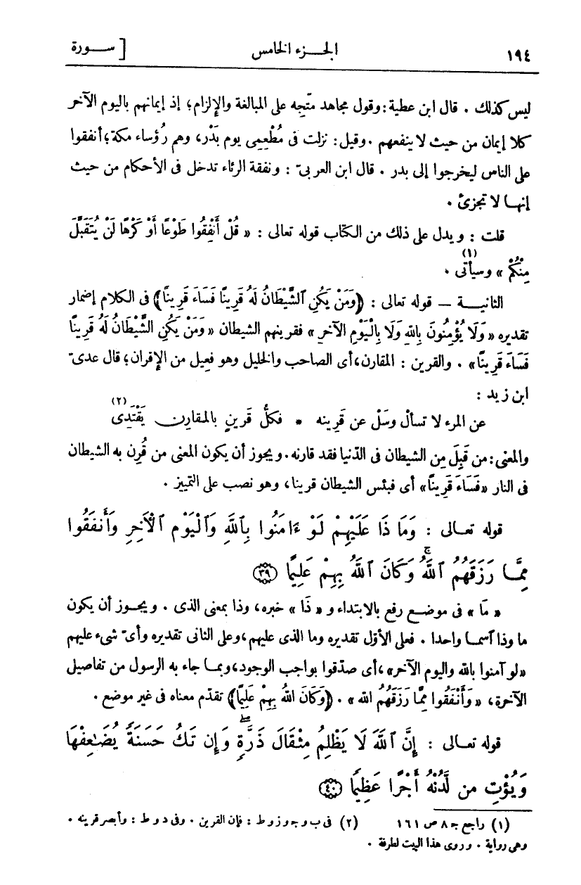 لَيْسَ كَذَلِكَ. قَالَ ابْنُ عَطِيَّةَ: وَقَوْلُ مُجَاهِدٍ مُتَّجِهٌ عَلَى الْمُبَالَغَةِ وَالْإِلْزَامِ، إِذْ إِيمَانُهُمْ بِالْيَوْمِ الْآخِرِ كَلَا إِيمَانٍ مِنْ حَيْثُ لَا يَنْفَعُهُمْ. وَقِيلَ: نَزَلَتْ فِي مُطْعِمِي يَوْمِ بَدْرٍ، وَهُمْ رؤساء مكة، أنفقوا عَلَى النَّاسِ لِيَخْرُجُوا إِلَى بَدْرٍ. قَالَ ابْنُ الْعَرَبِيِّ: وَنَفَقَةُ الرِّئَاءِ تَدْخُلُ فِي الْأَحْكَامِ مِنْ حَيْثُ إِنَّهَا لَا تُجْزِئُ. قُلْتُ: وَيَدُلُّ عَلَى ذلك من الكتاب قول تَعَالَى: (قُلْ أَنْفِقُوا طَوْعاً أَوْ كَرْهاً لَنْ يُتَقَبَّلَ مِنْكُمْ) وَسَيَأْتِي «١». الثَّانِيةُ- قَوْلُهُ تَعَالَى: (وَمَنْ يَكُنِ الشَّيْطانُ لَهُ قَرِيناً فَساءَ قَرِيناً) فِي الْكَلَامِ إِضْمَارٌ تَقْدِيرُهُ (وَلا يُؤْمِنُونَ بِاللَّهِ وَلا بِالْيَوْمِ الْآخِرِ) فَقَرِينُهُمُ الشَّيْطَانُ (وَمَنْ يَكُنِ الشَّيْطانُ لَهُ قَرِيناً فَساءَ قَرِيناً). وَالْقَرِينُ: الْمُقَارِنُ، أَيِ الصَّاحِبُ وَالْخَلِيلُ وَهُوَ فَعِيلٌ مِنَ الْإِقْرَانِ، قَالَ عدي ابن زَيْدٍ: