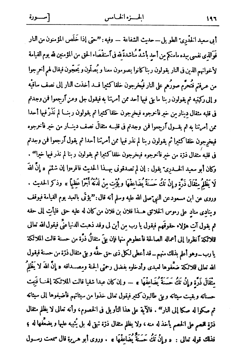 أَبِي سَعِيدٍ الْخُدْرِيِّ الطَّوِيلِ- حَدِيثُ الشَّفَاعَةِ- وَفِيهِ: (حَتَّى إِذَا خَلَصَ الْمُؤْمِنُونَ مِنَ النَّارِ فَوَالَّذِي نَفْسِي بِيَدِهِ مَا مِنْكُمْ مِنْ أَحَدٍ بِأَشَدَّ مُنَاشَدَةً لِلَّهِ فِي اسْتِقْصَاءِ الْحَقِّ مِنَ الْمُؤْمِنِينَ لِلَّهِ يَوْمَ الْقِيَامَةِ لِإِخْوَانِهِمُ الَّذِينَ فِي النَّارِ يَقُولُونَ رَبَّنَا كَانُوا يَصُومُونَ مَعَنَا وَيُصَلُّونَ وَيَحُجُّونَ فَيُقَالُ لَهُمْ أَخْرِجُوا مَنْ عَرَفْتُمْ فَتُحَرَّمُ صُوَرُهُمْ عَلَى النَّارِ فَيُخْرِجُونَ خَلْقًا كَثِيرًا قَدْ أَخَذَتِ النَّارُ إِلَى نِصْفِ سَاقَيْهِ وَإِلَى رُكْبَتَيْهِ ثُمَّ يَقُولُونَ رَبَّنَا مَا بَقِيَ فِيهَا أَحَدٌ مِمَّنْ أَمَرْتَنَا بِهِ فَيَقُولُ عَزَّ وَجَلَّ ارْجِعُوا فَمَنْ وَجَدْتُمْ فِي قَلْبِهِ مِثْقَالَ دِينَارٍ مِنْ خَيْرٍ فَأَخْرِجُوهُ فَيُخْرِجُونَ خَلْقًا كَثِيرًا ثُمَّ يَقُولُونَ رَبَّنَا لَمْ نَذَرْ فِيهَا أَحَدًا مِمَّنْ أَمَرْتَنَا بِهِ ثُمَّ يَقُولُ ارْجِعُوا فَمَنْ وَجَدْتُمْ فِي قَلْبِهِ مثقال نصف دينار من خير فأخرجوه فيخرجون خَلْقًا كَثِيرًا ثُمَّ يَقُولُونَ رَبَّنَا لَمْ نَذَرْ فيها ممن أمرتنا أحدا ثم يقول ارجعوا فَمَنْ وَجَدْتُمْ فِي قَلْبِهِ مِثْقَالَ ذَرَّةٍ مِنْ خَيْرٍ فَأَخْرِجُوهُ فَيُخْرِجُونَ خَلْقًا كَثِيرًا ثُمَّ يَقُولُونَ رَبَّنَا لَمْ نَذَرْ فِيهَا خَيْرًا (. وَكَانَ أَبُو سَعِيدٍ الْخُدْرِيُّ يَقُولُ: إِنْ لَمْ تُصَدِّقُونِي بِهَذَا الْحَدِيثِ فَاقْرَءُوا إِنْ شِئْتُمْ (إِنَّ اللَّهَ لَا يَظْلِمُ مِثْقالَ ذَرَّةٍ وَإِنْ تَكُ حَسَنَةً يُضاعِفْها وَيُؤْتِ مِنْ لَدُنْهُ أَجْراً عَظِيماً) وَذَكَرَ الْحَدِيثَ. وَرُوِيَ عَنِ ابْنِ مَسْعُودٍ عَنِ النَّبِيِّ صَلَّى اللَّهُ عَلَيْهِ وَسَلَّمَ أَنَّهُ قَالَ: (يُؤْتَى بِالْعَبْدِ يَوْمَ الْقِيَامَةِ فَيُوقَفُ وَيُنَادِي مُنَادٍ عَلَى رُءُوسِ الْخَلَائِقِ هَذَا فُلَانُ بْنُ فُلَانٍ مَنْ كَانَ لَهُ عَلَيْهِ حَقٌّ فَلْيَأْتِ إِلَى حَقِّهِ ثُمَّ يَقُولُ آتِ هَؤُلَاءِ حُقُوقَهُمْ فَيَقُولُ يَا رَبِّ مِنْ أَيْنَ لِي وَقَدْ ذَهَبَتِ الدُّنْيَا عَنِّي فَيَقُولُ اللَّهُ تَعَالَى لِلْمَلَائِكَةِ انْظُرُوا إِلَى أَعْمَالِهِ الصَّالِحَةِ فَأَعْطُوهُمْ مِنْهَا فَإِنْ بَقِيَ مِثْقَالُ ذَرَّةٍ مِنْ حَسَنَةٍ قَالَتِ الْمَلَائِكَةُ يَا رَبِّ- وَهُوَ أَعْلَمُ بِذَلِكَ مِنْهُمْ- قَدْ أُعْطِيَ لِكُلِّ ذِي حَقٍّ حَقَّهُ وَبَقِيَ مِثْقَالُ ذَرَّةٍ مِنْ حَسَنَةٍ فَيَقُولُ اللَّهُ تَعَالَى لِلْمَلَائِكَةِ ضَعِّفُوهَا لِعَبْدِي وَأَدْخِلُوهُ بِفَضْلِ رَحْمَتِي الْجَنَّةَ وَمِصْدَاقُهُ (إِنَّ اللَّهَ لَا يَظْلِمُ مِثْقالَ ذَرَّةٍ وَإِنْ تَكُ حَسَنَةً يُضاعِفْها) - وَإِنْ كَانَ عَبْدًا شَقِيًّا قَالَتِ الْمَلَائِكَةُ إِلَهَنَا فَنِيَتْ حَسَنَاتُهُ وَبَقِيَتْ سَيِّئَاتُهُ وَبَقِيَ طَالِبُونَ كَثِيرٌ فَيَقُولُ تَعَالَى خُذُوا مِنْ سَيِّئَاتِهِمْ فَأَضِيفُوهَا إِلَى سَيِّئَاتِهِ ثُمَّ صُكُّوا لَهُ صَكًّا إِلَى النَّارِ (. فَالْآيَةُ عَلَى هَذَا التَّأْوِيلِ فِي الْخُصُومِ، وَأَنَّهُ تَعَالَى لَا يَظْلِمُ مِثْقَالَ ذَرَّةٍ لِلْخَصْمِ عَلَى الْخَصْمِ يَأْخُذُ لَهُ مِنْهُ، وَلَا يَظْلِمُ مِثْقَالَ ذَرَّةٍ تَبْقَى لَهُ بَلْ يُثِيبُهُ عَلَيْهَا وَيُضَعِّفُهَا لَهُ، فَذَلِكَ قَوْلُهُ تَعَالَى: (وَإِنْ تَكُ حَسَنَةً يُضاعِفْها). وَرَوَى أَبُو هُرَيْرَةَ قَالَ سَمِعْتُ رَسُولَ