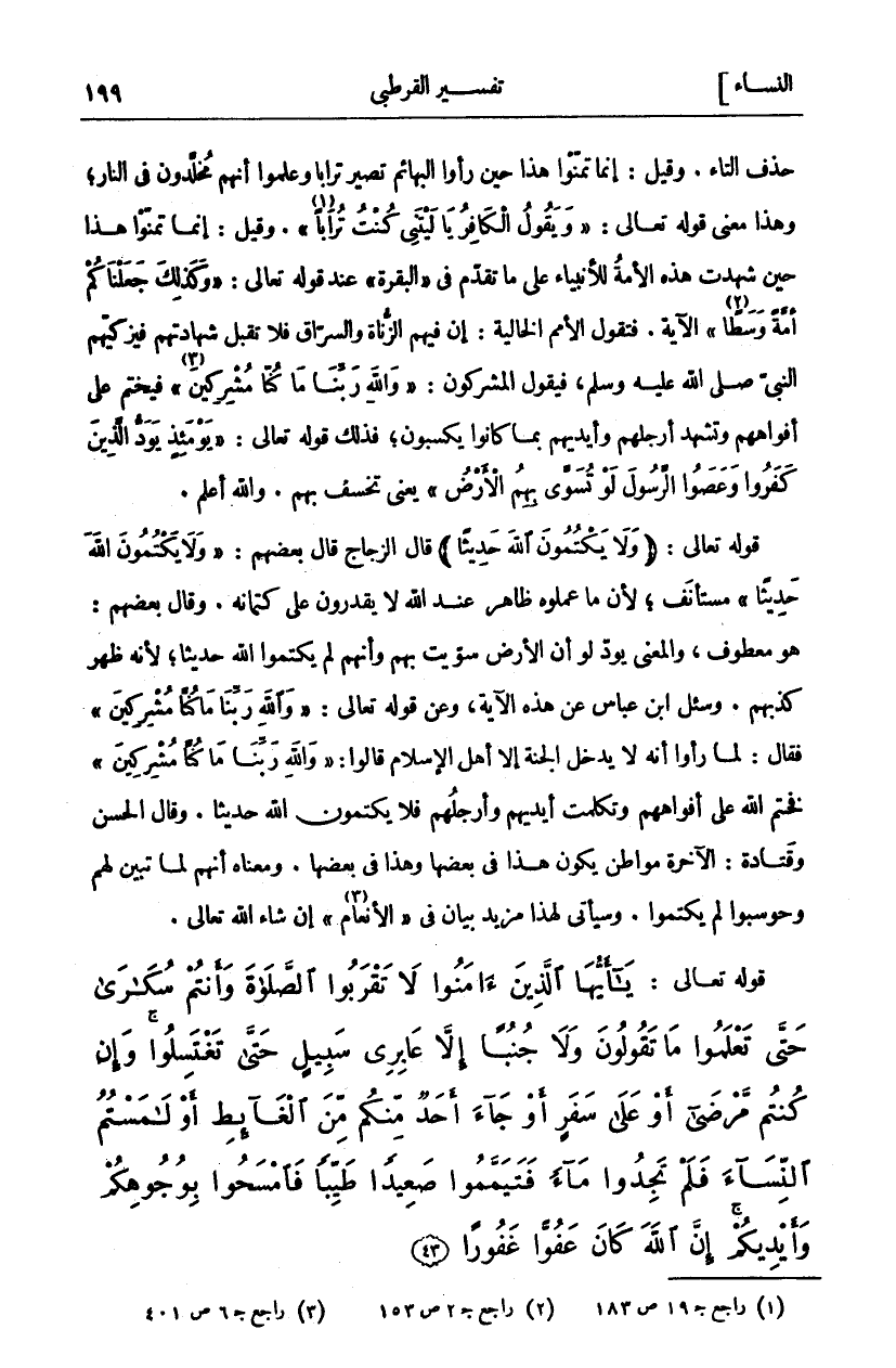 يَا أَيُّهَا الَّذِينَ آمَنُوا لَا تَقْرَبُوا الصَّلاةَ وَأَنْتُمْ سُكارى حَتَّى تَعْلَمُوا مَا تَقُولُونَ وَلا جُنُباً إِلاَّ عابِرِي سَبِيلٍ حَتَّى تَغْتَسِلُوا وَإِنْ كُنْتُمْ مَرْضى أَوْ عَلى سَفَرٍ أَوْ جاءَ أَحَدٌ مِنْكُمْ مِنَ الْغائِطِ أَوْ لامَسْتُمُ النِّساءَ فَلَمْ تَجِدُوا مَاءً فَتَيَمَّمُوا صَعِيداً طَيِّباً فَامْسَحُوا بِوُجُوهِكُمْ وَأَيْدِيكُمْ إِنَّ اللَّهَ كانَ عَفُوًّا غَفُوراً (٤٣)