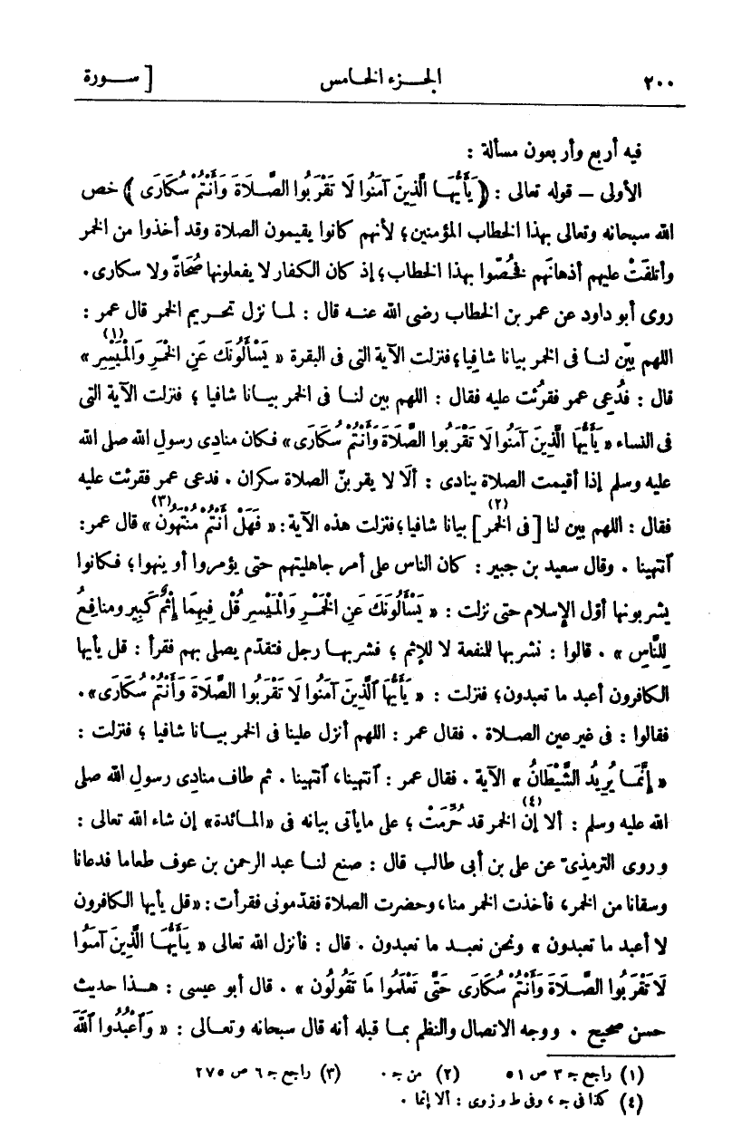 فيه أربع وَأَرْبَعُونَ مَسْأَلَةً: الْأُولَى- قَوْلُهُ تَعَالَى: (يَا أَيُّهَا الَّذِينَ آمَنُوا لَا تَقْرَبُوا الصَّلاةَ وَأَنْتُمْ سُكارى) خَصَّ اللَّهُ سُبْحَانَهُ وَتَعَالَى بِهَذَا الْخِطَابِ الْمُؤْمِنِينَ، لِأَنَّهُمْ كَانُوا يُقِيمُونَ الصَّلَاةَ وَقَدْ أَخَذُوا مِنَ الْخَمْرِ وَأَتْلَفَتْ عَلَيْهِمْ أَذْهَانَهُمْ فَخُصُّوا بِهَذَا الْخِطَابِ، إِذْ كَانَ الْكُفَّارُ لَا يَفْعَلُونَهَا صُحَاةً وَلَا سُكَارَى. رَوَى أَبُو دَاوُدَ عَنْ عُمَرَ بْنِ الْخَطَّابِ رَضِيَ اللَّهُ عَنْهُ قَالَ: لَمَّا نَزَلَ تَحْرِيمُ الْخَمْرِ قَالَ عُمَرُ: اللَّهُمَّ بَيِّنْ لَنَا فِي الْخَمْرِ بَيَانًا شَافِيًا، فَنَزَلَتِ الْآيَةُ الَّتِي في البقرة (يَسْئَلُونَكَ عَنِ الْخَمْرِ وَالْمَيْسِرِ «١» قَالَ: فَدُعِيَ عُمَرُ فَقُرِئَتْ عَلَيْهِ فَقَالَ: اللَّهُمَّ بَيِّنْ لَنَا فِي الْخَمْرِ بَيَانًا شَافِيًا، فَنَزَلَتِ الْآيَةُ الَّتِي فِي النِّسَاءِ (يَا أَيُّهَا الَّذِينَ آمَنُوا لَا تَقْرَبُوا الصَّلاةَ وَأَنْتُمْ سُكارى) فَكَانَ مُنَادِي رَسُولِ اللَّهِ صَلَّى اللَّهُ عَلَيْهِ وَسَلَّمَ إِذَا أُقِيمَتِ الصَّلَاةُ يُنَادِي: أَلَا لَا يَقْرَبَنَّ الصَّلَاةَ سَكْرَانُ. فَدُعِيَ عُمَرُ فَقُرِئَتْ عَلَيْهِ فَقَالَ: اللَّهُمَّ بَيِّنْ لَنَا [فِي الْخَمْرِ «٢»] بَيَانًا شَافِيًا، فَنَزَلَتْ هَذِهِ الْآيَةُ: (فَهَلْ أَنْتُمْ مُنْتَهُونَ «٣») قَالَ عُمَرُ: انْتَهَيْنَا. وَقَالَ سَعِيدُ بْنُ جُبَيْرٍ: كَانَ النَّاسُ عَلَى أَمْرِ جَاهِلِيَّتِهِمْ حَتَّى يُؤْمَرُوا أَوْ يُنْهَوْا، فَكَانُوا يَشْرَبُونَهَا أَوَّلَ الإسلام حتى نزلت: (يَسْئَلُونَكَ عَنِ الْخَمْرِ وَالْمَيْسِرِ قُلْ فِيهِما إِثْمٌ كَبِيرٌ وَمَنافِعُ لِلنَّاسِ). قَالُوا: نَشْرَبُهَا لِلْمَنْفَعَةِ لَا لِلْإِثْمِ، فَشَرِبَهَا رَجُلٌ فَتَقَدَّمَ يُصَلِّي بِهِمْ فَقَرَأَ: قُلْ يَا أَيُّهَا الْكَافِرُونَ أَعْبُدُ مَا تَعْبُدُونَ، فَنَزَلَتْ: (يَا أَيُّهَا الَّذِينَ آمَنُوا لَا تَقْرَبُوا الصَّلاةَ وَأَنْتُمْ سُكارى). فَقَالُوا: فِي غَيْرِ عَيْنِ الصَّلَاةِ. فَقَالَ عُمَرُ: اللَّهُمَّ أَنْزِلْ عَلَيْنَا فِي الْخَمْرِ بَيَانًا شَافِيًا، فَنَزَلَتْ: (إِنَّما يُرِيدُ الشَّيْطانُ) الْآيَةَ. فَقَالَ عُمَرُ: انْتَهَيْنَا، انْتَهَيْنَا. ثُمَّ طَافَ مُنَادِي رَسُولِ اللَّهِ صَلَّى اللَّهُ عَلَيْهِ وَسَلَّمَ: أَلَا إِنَّ «٤» الْخَمْرَ قَدْ حُرِّمَتْ، عَلَى مَا يَأْتِي بَيَانُهُ فِي (الْمَائِدَةِ) إِنْ شَاءَ اللَّهُ تَعَالَى: وَرَوَى التِّرْمِذِيُّ عَنْ عَلِيِّ بْنِ أَبِي طَالِبٍ قَالَ: صَنَعَ لَنَا عَبْدُ الرَّحْمَنِ بْنُ عَوْفٍ طَعَامًا فَدَعَانَا وَسَقَانَا مِنَ الْخَمْرِ، فَأَخَذَتِ الْخَمْرُ مِنَّا، وَحَضَرَتِ الصَّلَاةُ فَقَدَّمُونِي فَقَرَأْتُ: (قُلْ يَا أَيُّهَا الْكافِرُونَ لَا أَعْبُدُ مَا تَعْبُدُونَ) وَنَحْنُ نَعْبُدُ مَا تَعْبُدُونَ. قَالَ: فَأَنْزَلَ اللَّهُ تَعَالَى (يَا أَيُّهَا الَّذِينَ آمَنُوا لَا تَقْرَبُوا الصَّلاةَ وَأَنْتُمْ سُكارى حَتَّى تَعْلَمُوا مَا تَقُولُونَ). قَالَ أَبُو عِيسَى: هَذَا حَدِيثٌ حَسَنٌ صَحِيحٌ. وَوَجْهُ الِاتِّصَالِ وَالنَّظْمِ بِمَا قَبْلَهُ أَنَّهُ قَالَ سُبْحَانَهُ وتعالى: