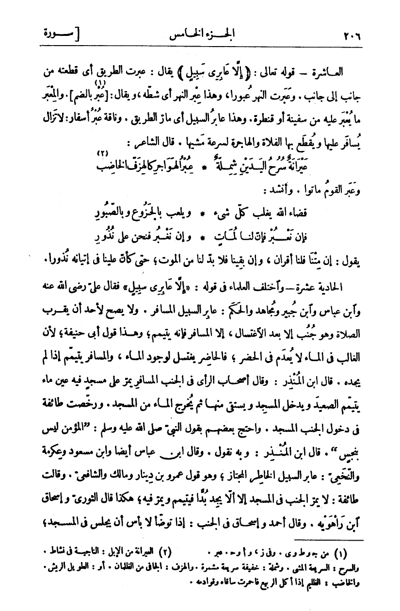 الْعَاشِرَةُ- قَوْلُهُ تَعَالَى: (إِلَّا عابِرِي سَبِيلٍ) يُقَالُ: عَبَرْتُ الطَّرِيقَ أَيْ قَطَعْتُهُ مِنْ جَانِبٍ إِلَى جَانِبٍ. وَعَبَرْتُ النَّهَرَ عُبُورًا، وَهَذَا عِبْرُ النَّهَرِ أَيْ شَطَّهُ، وَيُقَالُ: [عُبْرٌ «١» بِالضَّمِّ [. وَالْمَعْبَرُ مَا يُعْبَرُ عَلَيْهِ مِنْ سَفِينَةٍ أَوْ قَنْطَرَةٍ. وَهَذَا عَابِرُ السَّبِيلِ أَيْ مَارُّ الطَّرِيقِ. وَنَاقَةٌ عُبْرُ أَسْفَارٍ: لَا تَزَالُ يُسَافَرُ عَلَيْهَا وَيُقْطَعُ بِهَا الْفَلَاةُ وَالْهَاجِرَةُ لِسُرْعَةِ مَشْيِهَا. قَالَ الشَّاعِرُ: