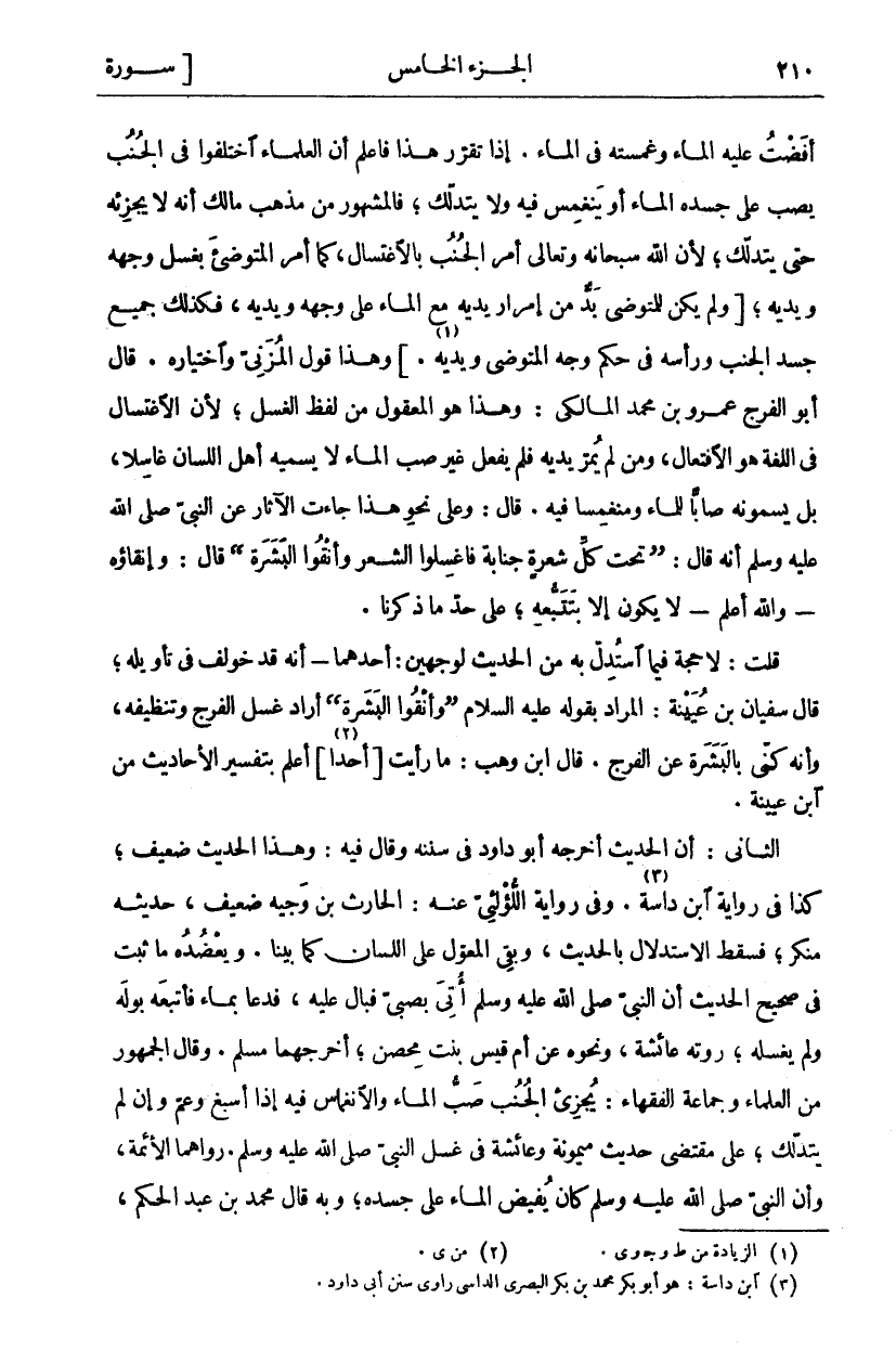 أَفَضْتُ عَلَيْهِ الْمَاءَ وَغَمَسْتُهُ فِي الْمَاءِ. إِذَا تَقَرَّرَ هَذَا فَاعْلَمْ أَنَّ الْعُلَمَاءَ اخْتَلَفُوا فِي الْجُنُبِ يَصُبُّ عَلَى جَسَدِهِ الْمَاءَ أَوْ يَنْغَمِسُ فِيهِ وَلَا يَتَدَلَّكُ، فَالْمَشْهُورُ مِنْ مَذْهَبِ مَالِكٍ أنه لا بجزية حَتَّى يَتَدَلَّكَ، لِأَنَّ اللَّهَ سُبْحَانَهُ وَتَعَالَى أَمَرَ الْجُنُبَ بِالِاغْتِسَالِ، كَمَا أَمَرَ الْمُتَوَضِّئَ بِغَسْلِ وَجْهِهِ وَيَدَيْهِ، [وَلَمْ يَكُنْ لِلْمُتَوَضِّئِ بُدٌّ مِنْ إِمْرَارِ يَدَيْهِ مَعَ الْمَاءِ عَلَى وَجْهِهِ وَيَدَيْهِ، فَكَذَلِكَ جَمِيعُ جَسَدِ الْجُنُبِ وَرَأْسِهِ فِي حُكْمِ وَجْهِ الْمُتَوَضِّئِ وَيَدَيْهِ «١». [وَهَذَا قَوْلُ الْمُزَنِيِّ وَاخْتِيَارِهِ. قَالَ أَبُو الْفَرَجِ عَمْرُو بْنُ مُحَمَّدٍ الْمَالِكِيُّ: وَهَذَا هُوَ الْمَعْقُولُ مِنْ لَفْظِ الْغُسْلِ، لِأَنَّ الِاغْتِسَالَ فِي اللُّغَةِ هُوَ الِافْتِعَالُ، وَمَنْ لَمْ يَمُرَّ يديه فَلَمْ يَفْعَلْ غَيْرَ صَبِّ الْمَاءِ لَا يُسَمِّيهِ أَهْلُ اللِّسَانِ غَاسِلًا، بَلْ يُسَمُّونَهُ صَابًّا لِلْمَاءِ وَمُنْغَمِسًا فِيهِ. قَالَ: وَعَلَى نَحْوِ هَذَا جَاءَتِ الْآثَارُ عَنِ النَّبِيِّ صَلَّى اللَّهُ عَلَيْهِ وَسَلَّمَ أَنَّهُ قَالَ: (تَحْتَ كُلِّ شَعْرَةٍ جَنَابَةٌ فَاغْسِلُوا الشَّعْرَ وَأَنْقُوا الْبَشَرَةَ) قَالَ: وَإِنْقَاؤُهُ وَاللَّهُ أَعْلَمُ- لَا يَكُونُ إِلَّا بِتَتَبُّعِهِ، عَلَى حَدِّ مَا ذَكَرْنَا. قُلْتُ: لَا حُجَّةَ فِيمَا اسْتُدِلَّ بِهِ مِنَ الْحَدِيثِ لِوَجْهَيْنِ: أَحَدُهُمَا- أَنَّهُ قَدْ خُولِفَ فِي تَأْوِيلِهِ، قَالَ سُفْيَانُ بْنُ عُيَيْنَةَ: الْمُرَادُ بِقَوْلِهِ عَلَيْهِ السَّلَامُ (وَأَنْقُوا الْبَشَرَةَ) أَرَادَ غَسْلَ الْفَرْجِ وَتَنْظِيفَهُ، وَأَنَّهُ كَنَّى بِالْبَشَرَةِ عَنِ الْفَرْجِ. قَالَ ابْنُ وَهْبٍ: مَا رَأَيْتُ] أَحَدًا «٢» [أَعْلَمَ بِتَفْسِيرِ الْأَحَادِيثِ مِنَ ابْنِ عُيَيْنَةَ. الثَّانِي: أَنَّ الْحَدِيثَ أَخْرَجَهُ أَبُو دَاوُدَ فِي سُنَنِهِ وَقَالَ فِيهِ: وَهَذَا الْحَدِيثُ ضَعِيفٌ، كَذَا فِي رِوَايَةِ ابن داسة «٣». وفي رواية اللؤلؤي عَنْهُ: الْحَارِثُ بْنُ وَجِيهٍ ضَعِيفٌ، حَدِيثُهُ مُنْكَرٌ، فَسَقَطَ الِاسْتِدْلَالُ بِالْحَدِيثِ، وَبَقِيَ الْمُعَوَّلُ عَلَى اللِّسَانِ كَمَا بَيَّنَّا. وَيُعَضِّدُهُ مَا ثَبَتَ فِي صَحِيحِ الْحَدِيثِ أَنَّ النَّبِيَّ صَلَّى اللَّهُ عَلَيْهِ وَسَلَّمَ أُتِيَ بِصَبِيٍّ فَبَالَ عَلَيْهِ، فَدَعَا بِمَاءٍ فَأَتْبَعَهُ بَوْلَهُ وَلَمْ يَغْسِلْهُ، رَوَتْهُ عَائِشَةُ، وَنَحْوَهُ عَنْ أُمِّ قَيْسٍ بِنْتِ مِحْصَنٍ، أَخْرَجَهُمَا مُسْلِمٌ. وَقَالَ الْجُمْهُورُ مِنَ الْعُلَمَاءِ وَجَمَاعَةِ الْفُقَهَاءِ: يُجْزِئُ الْجُنُبَ صَبُّ الْمَاءِ وَالِانْغِمَاسُ فِيهِ إِذَا أَسْبَغَ وَعَمَّ وَإِنْ لَمْ يَتَدَلَّكْ، عَلَى مُقْتَضَى حَدِيثِ مَيْمُونَةَ وَعَائِشَةَ فِي غُسْلِ النَّبِيِّ صَلَّى اللَّهُ عَلَيْهِ وَسَلَّمَ. رَوَاهُمَا الْأَئِمَّةُ، وَأَنَّ النَّبِيَّ صَلَّى اللَّهُ عَلَيْهِ وَسَلَّمَ كَانَ يُفِيضُ الْمَاءَ عَلَى جَسَدِهِ، وبه قال محمد بن عبد الحكم،