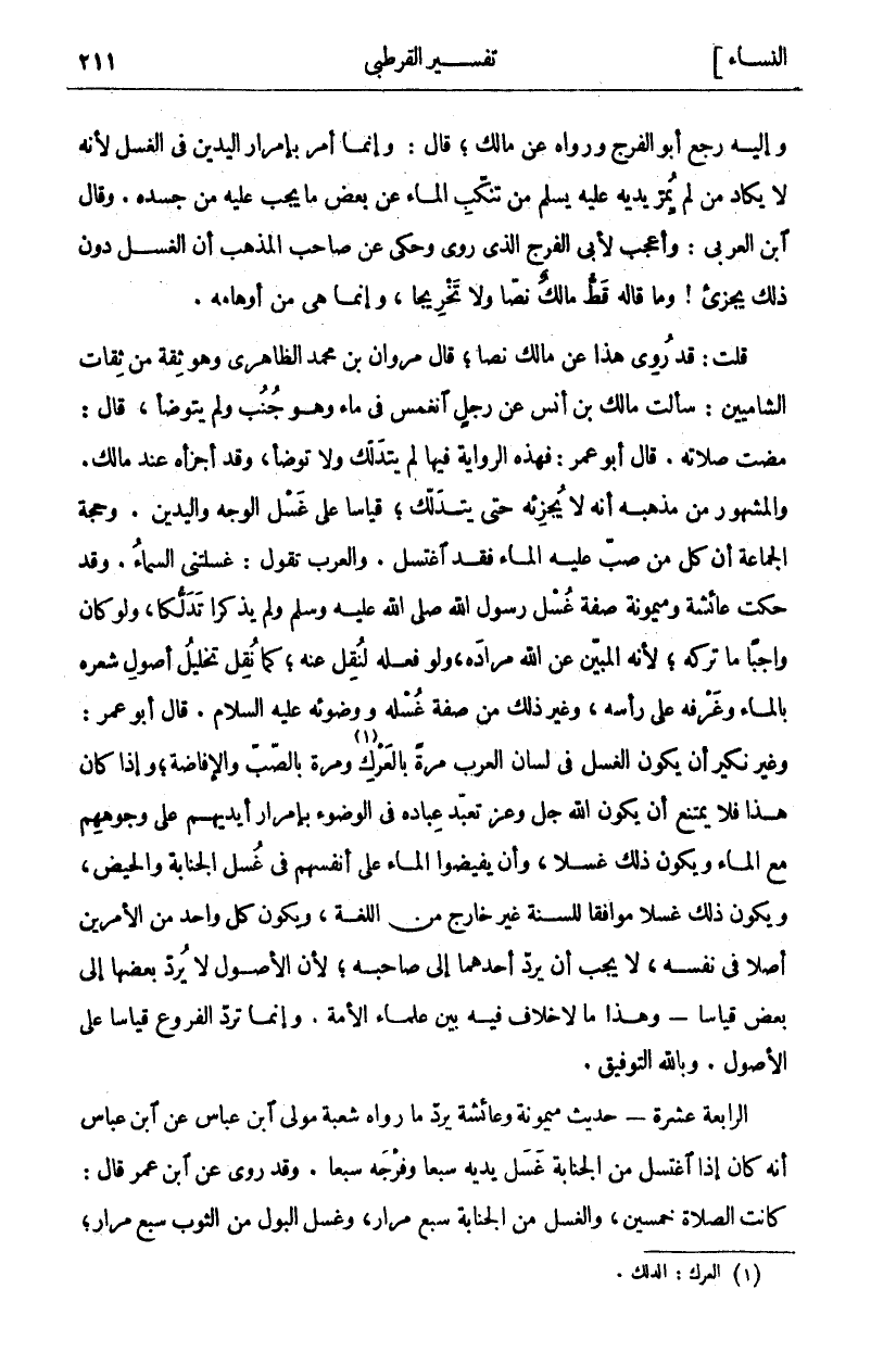 وَإِلَيْهِ رَجَعَ أَبُو الْفَرَجِ وَرَوَاهُ عَنْ مَالِكٍ، قَالَ: وَإِنَّمَا أَمَرَ بِإِمْرَارِ الْيَدَيْنِ فِي الْغُسْلِ لِأَنَّهُ لَا يَكَادُ مَنْ لَمْ يُمِرَّ يَدَيْهِ عَلَيْهِ يَسْلَمُ مِنْ تَنَكُّبِ الْمَاءِ عَنْ بَعْضِ مَا يَجِبُ عَلَيْهِ مِنْ جَسَدِهِ. وَقَالَ ابْنُ الْعَرَبِيِّ: وَأَعْجَبُ لِأَبِي الْفَرَجِ الَّذِي رَوَى وَحَكَى عَنْ صَاحِبِ الْمَذْهَبِ أَنَّ الْغُسْلَ دُونَ ذَلِكَ يُجْزِئُ! وَمَا قَالَهُ قَطُّ مَالِكٌ نَصًّا وَلَا تَخْرِيجًا، وَإِنَّمَا هِيَ مِنْ أَوْهَامِهِ. قُلْتُ: قَدْ رُوِيَ هَذَا عَنْ مَالِكٍ نَصًّا، قَالَ مَرْوَانُ بْنُ مُحَمَّدٍ الظَّاهِرِيُّ وَهُوَ ثِقَةٌ مِنْ ثِقَاتِ الشَّامِيِّينَ: سَأَلْتُ مَالِكَ بْنَ أَنَسٍ عَنْ رَجُلٍ انْغَمَسَ فِي مَاءٍ وَهُوَ جُنُبٌ وَلَمْ يَتَوَضَّأْ، قَالَ: مَضَتْ صَلَاتُهُ. قَالَ أَبُو عُمَرَ: فَهَذِهِ الرِّوَايَةُ فِيهَا لَمْ يَتَدَلَّكْ وَلَا تَوَضَّأَ، وَقَدْ أَجْزَأَهُ عِنْدَ مَالِكٍ. وَالْمَشْهُورُ مِنْ مَذْهَبِهِ أَنَّهُ لَا يُجْزِئُهُ حَتَّى يَتَدَلَّكَ، قِيَاسًا عَلَى غَسْلِ الْوَجْهِ وَالْيَدَيْنِ. وَحُجَّةُ الْجَمَاعَةِ أَنَّ كُلَّ مَنْ صُبَّ عَلَيْهِ الْمَاءُ فَقَدِ اغْتَسَلَ. وَالْعَرَبُ تَقُولُ: غَسَلَتْنِي السَّمَاءُ. وَقَدْ حَكَتْ عَائِشَةُ وَمَيْمُونَةُ صِفَةَ غُسْلِ رَسُولُ اللَّهِ صَلَّى اللَّهُ عَلَيْهِ وَسَلَّمَ وَلَمْ يَذْكُرَا تَدَلُّكًا، وَلَوْ كَانَ وَاجِبًا مَا تَرَكَهُ، لِأَنَّهُ الْمُبَيِّنُ عَنِ اللَّهِ مُرَادَهُ، وَلَوْ فَعَلَهُ لَنُقِلَ عَنْهُ، كَمَا نُقِلَ تَخْلِيلُ أُصُولِ شَعْرِهِ بِالْمَاءِ وَغَرْفُهُ عَلَى رَأْسِهِ، وَغَيْرُ ذَلِكَ مِنْ صِفَةِ غُسْلِهِ وَوُضُوئِهِ عَلَيْهِ السَّلَامُ. قَالَ أَبُو عُمَرَ: وَغَيْرُ نَكِيرٍ أَنْ يَكُونَ الْغُسْلُ فِي لِسَانِ الْعَرَبِ مَرَّةً بِالْعَرْكِ «١» وَمَرَّةً بِالصَّبِّ وَالْإِفَاضَةِ، وَإِذَا كَانَ هَذَا فَلَا يَمْتَنِعُ أَنْ يكون الله عز وجل تَعَبَّدَ عِبَادَهُ فِي الْوُضُوءِ بِإِمْرَارِ أَيْدِيهِمْ عَلَى وُجُوهِهِمْ مَعَ الْمَاءِ وَيَكُونُ ذَلِكَ غُسْلًا، وَأَنْ يُفِيضُوا الْمَاءَ عَلَى أَنْفُسِهِمْ فِي غُسْلِ الْجَنَابَةِ وَالْحَيْضِ، وَيَكُونُ ذَلِكَ غُسْلًا مُوَافِقًا لِلسُّنَّةِ غَيْرَ خَارِجٍ مِنَ اللُّغَةِ وَيَكُونُ كُلُّ وَاحِدٍ مِنَ الْأَمْرَيْنِ أَصْلًا فِي نَفْسِهِ، لَا يَجِبُ أَنْ يُرَدَّ أَحَدُهُمَا إِلَى صَاحِبِهِ، لِأَنَّ الْأُصُولَ لَا يُرَدُّ بَعْضُهَا إِلَى بَعْضٍ قِيَاسًا- وَهَذَا مَا لَا خِلَافَ فِيهِ بَيْنَ عُلَمَاءِ الْأُمَّةِ. وَإِنَّمَا تُرَدُّ الْفُرُوعُ قِيَاسًا عَلَى الْأُصُولِ. وَبِاللَّهِ التَّوْفِيقُ. الرَّابِعَةُ عَشْرَةَ- حَدِيثُ مَيْمُونَةَ وَعَائِشَةَ يَرُدُّ مَا رَوَاهُ شُعْبَةُ مَوْلَى ابْنِ عَبَّاسٍ عَنِ ابْنِ عَبَّاسٍ أَنَّهُ كَانَ إِذَا اغْتَسَلَ مِنَ الْجَنَابَةِ غَسَلَ يَدَيْهِ سَبْعًا وَفَرْجَهُ سَبْعًا. وَقَدْ رُوِيَ عَنِ ابْنِ عُمَرَ قَالَ: كَانَتِ الصَّلَاةُ خَمْسِينَ، وَالْغُسْلُ مِنَ الْجَنَابَةِ سَبْعُ مِرَارٍ، وَغَسْلُ الْبَوْلِ من الثوب سبع مرار،