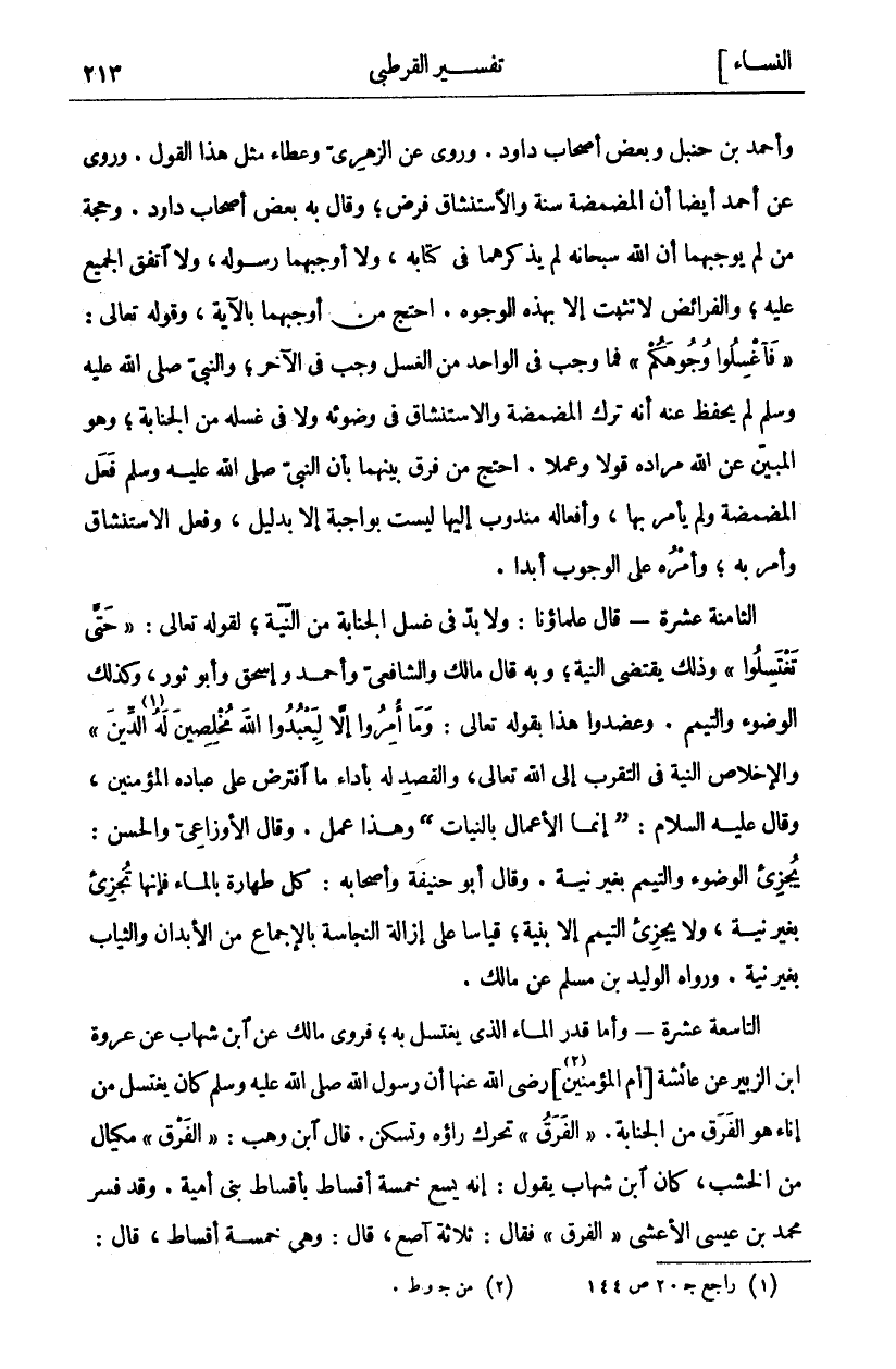 وَأَحْمَدَ بْنِ حَنْبَلٍ وَبَعْضِ أَصْحَابِ دَاوُدَ. وَرُوِيَ عَنِ الزُّهْرِيِّ وَعَطَاءٍ مِثْلَ هَذَا الْقَوْلِ. وَرُوِيَ عَنْ أَحْمَدَ أَيْضًا أَنَّ الْمَضْمَضَةَ سُنَّةٌ وَالِاسْتِنْشَاقَ فَرْضٌ، وَقَالَ بِهِ بَعْضُ أَصْحَابِ دَاوُدَ. وَحُجَّةُ مَنْ لَمْ يُوجِبْهُمَا أَنَّ اللَّهَ سُبْحَانَهُ لَمْ يَذْكُرْهُمَا فِي كِتَابِهِ، وَلَا أَوْجَبَهُمَا رَسُولُهُ، وَلَا اتَّفَقَ الْجَمِيعُ عَلَيْهِ، وَالْفَرَائِضُ لَا تَثْبُتُ إِلَّا بِهَذِهِ الْوُجُوهِ. احْتَجَّ مَنْ أَوْجَبَهُمَا بِالْآيَةِ، وَقَوْلُهُ تَعَالَى: (فَاغْسِلُوا وُجُوهَكُمْ) فَمَا وَجَبَ فِي الْوَاحِدِ مِنَ الْغُسْلِ وَجَبَ فِي الْآخَرِ، وَالنَّبِيُّ صَلَّى اللَّهُ عَلَيْهِ وَسَلَّمَ لَمْ يُحْفَظْ عَنْهُ أَنَّهُ تَرَكَ الْمَضْمَضَةَ وَالِاسْتِنْشَاقَ فِي وُضُوئِهِ وَلَا فِي غُسْلِهِ مِنَ الْجَنَابَةِ، وَهُوَ الْمُبَيِّنُ عَنِ اللَّهِ مُرَادَهُ قَوْلًا وَعَمَلًا. احْتَجَّ مَنْ فَرَّقَ بَيْنَهُمَا بِأَنَّ النَّبِيَّ صَلَّى اللَّهُ عَلَيْهِ وَسَلَّمَ فَعَلَ الْمَضْمَضَةَ وَلَمْ يَأْمُرْ بِهَا وَأَفْعَالُهُ مَنْدُوبٌ إِلَيْهَا لَيْسَتْ بِوَاجِبَةٍ إِلَّا بِدَلِيلٍ، وَفَعَلَ الِاسْتِنْشَاقَ وَأَمَرَ بِهِ، وَأَمْرُهُ عَلَى الْوُجُوبِ أَبَدًا. الثَّامِنَةُ عَشْرَةَ- قَالَ عُلَمَاؤُنَا: وَلَا بُدَّ فِي غُسْلِ الْجَنَابَةِ مِنَ النِّيَّةِ، لِقَوْلِهِ تَعَالَى: (حَتَّى تَغْتَسِلُوا) وَذَلِكَ يَقْتَضِي النِّيَّةَ، وَبِهِ قَالَ مَالِكٌ وَالشَّافِعِيُّ وَأَحْمَدُ وَإِسْحَاقُ وَأَبُو ثَوْرٍ، وَكَذَلِكَ الْوُضُوءُ وَالتَّيَمُّمُ. وَعَضَّدُوا هذا وبقوله تَعَالَى: (وَما أُمِرُوا إِلَّا لِيَعْبُدُوا اللَّهَ مُخْلِصِينَ لَهُ «١» الدِّينَ) وَالْإِخْلَاصُ النِّيَّةُ فِي التَّقَرُّبِ إِلَى اللَّهِ تَعَالَى، وَالْقَصْدُ لَهُ بِأَدَاءِ مَا افْتَرَضَ عَلَى عِبَادِهِ الْمُؤْمِنِينَ، وَقَالَ عَلَيْهِ السَّلَامُ: (إِنَّمَا الْأَعْمَالُ بِالنِّيَّاتِ) وَهَذَا عَمَلٌ. وَقَالَ الْأَوْزَاعِيُّ وَالْحَسَنُ: يُجْزِئُ الْوُضُوءَ وَالتَّيَمُّمَ بِغَيْرِ نِيَّةٍ. وَقَالَ أَبُو حَنِيفَةَ وَأَصْحَابُهُ: كُلُّ طَهَارَةٍ بِالْمَاءِ فَإِنَّهَا تُجْزِئُ بِغَيْرِ نِيَّةٍ، وَلَا يُجْزِئُ التَّيَمُّمُ إِلَّا بِنِيَّةٍ، قِيَاسًا عَلَى إِزَالَةِ النَّجَاسَةِ بِالْإِجْمَاعِ مِنَ الْأَبْدَانِ وَالثِّيَابِ بِغَيْرِ نِيَّةٍ. وَرَوَاهُ الْوَلِيدُ بْنُ مُسْلِمٍ عَنْ مَالِكٍ. التَّاسِعَةُ عَشْرَةَ- وَأَمَّا قَدْرُ الْمَاءِ الَّذِي يُغْتَسَلُ بِهِ، فَرَوَى مَالِكٌ عَنِ ابْنِ شهاب عن عروة ابن الزُّبَيْرِ عَنْ عَائِشَةَ [أُمِّ الْمُؤْمِنِينَ «٢»] رَضِيَ اللَّهُ عَنْهَا أَنَّ رَسُولَ اللَّهِ صَلَّى اللَّهُ عَلَيْهِ وَسَلَّمَ كَانَ يَغْتَسِلُ مِنْ إِنَاءٍ هُوَ الْفَرَقُ من الجنابة. (الفرق) تحرك رأوه وَتُسَكَّنُ. قَالَ ابْنُ وَهْبٍ: (الْفَرَقُ) مِكْيَالٌ مِنَ الْخَشَبِ، كَانَ ابْنُ شِهَابٍ يَقُولُ: إِنَّهُ يَسَعُ خَمْسَةَ أَقْسَاطٍ بِأَقْسَاطِ بَنِي أُمَيَّةَ. وَقَدْ فَسَّرَ مُحَمَّدُ بْنُ عِيسَى الْأَعْشَى (الْفَرَقَ) فَقَالَ: ثَلَاثَةُ آصع، قال: وهي خمسة أقساط، قال:
