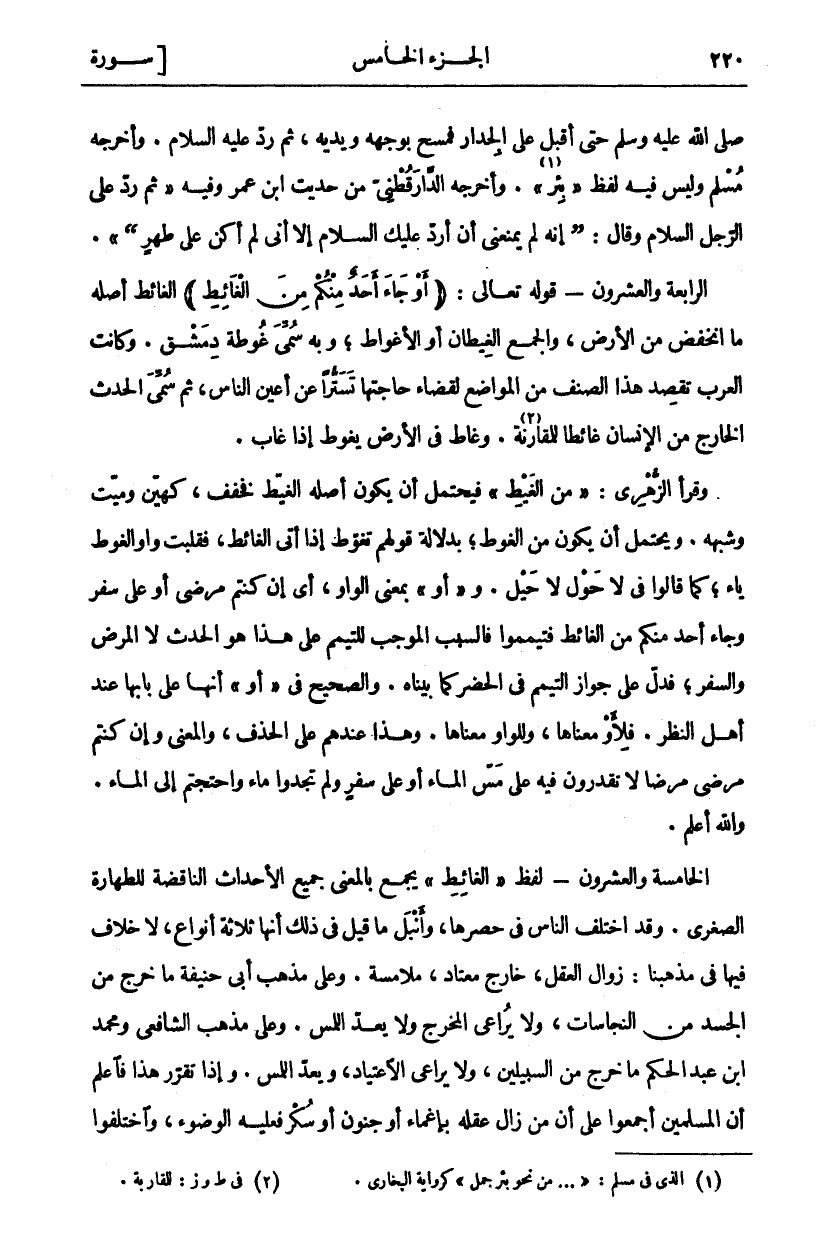 صَلَّى اللَّهُ عَلَيْهِ وَسَلَّمَ حَتَّى أَقْبَلَ عَلَى الْجِدَارِ فَمَسَحَ بِوَجْهِهِ وَيَدَيْهِ، ثُمَّ رَدَّ عَلَيْهِ السَّلَامَ. وَأَخْرَجَهُ مُسْلِمٌ وَلَيْسَ فِيهِ لَفْظُ (بِئْرٍ «١»). وَأَخْرَجَهُ الدَّارَقُطْنِيُّ مِنْ حَدِيثِ ابْنِ عُمَرَ وَفِيهِ (ثُمَّ رَدَّ عَلَى الرَّجُلِ السَّلَامَ وَقَالَ:) إِنَّهُ لَمْ يَمْنَعْنِي أَنْ أَرُدَّ عَلَيْكَ السَّلَامَ إِلَّا أَنِّي لَمْ أَكُنْ عَلَى طُهْرٍ. الرَّابِعَةُ وَالْعِشْرُونَ- قوله تعالى: (أَوْ جاءَ أَحَدٌ مِنْكُمْ مِنَ الْغائِطِ) الْغَائِطُ أَصْلُهُ مَا انْخَفَضَ مِنَ الْأَرْضِ، وَالْجَمْعُ الْغِيطَانُ أَوِ الْأَغْوَاطُ، وَبِهِ سُمِّيَ غُوطَةَ دِمَشْقَ. وَكَانَتِ الْعَرَبُ تَقْصِدُ هَذَا الصِّنْفَ مِنَ الْمَوَاضِعِ لِقَضَاءِ حَاجَتِهَا تَسَتُّرًا عَنْ أَعْيُنِ النَّاسِ، ثُمَّ سُمِّيَ الْحَدَثُ الْخَارِجُ مِنَ الْإِنْسَانِ غَائِطًا لِلْمُقَارَنَةِ «٢». وَغَاطَ فِي الْأَرْضِ يَغُوطُ إِذَا غَابَ. وَقَرَأَ الزُّهْرِيُّ: (مِنَ الْغَيْطِ) فَيَحْتَمِلُ أَنْ يَكُونَ أَصْلُهُ الْغَيْطُ فَخُفِّفَ، كَهَيِّنٍ وَمَيِّتٍ وَشَبَهِهِ. وَيَحْتَمِلُ أَنْ يَكُونَ مِنَ الْغَوْطِ، بِدَلَالَةِ قَوْلِهِمْ تَغَوَّطَ إِذَا أَتَى الْغَائِطَ، فَقُلِبَتْ وَاوُ الْغَوْطِ يَاءً، كَمَا قَالُوا في لا حول لا حيل. و (أَوْ) بِمَعْنَى الْوَاوِ، أَيْ إِنْ كُنْتُمْ مَرْضَى أَوْ عَلَى سَفَرٍ وَجَاءَ أَحَدٌ مِنْكُمْ مِنَ الْغَائِطِ فَتَيَمَّمُوا فَالسَّبَبُ الْمُوجِبُ لِلتَّيَمُّمِ عَلَى هَذَا هُوَ الْحَدَثُ لَا الْمَرَضُ وَالسَّفَرُ، فَدَلَّ عَلَى جَوَازِ التَّيَمُّمِ فِي الْحَضَرِ كَمَا بَيَّنَّاهُ. وَالصَّحِيحُ فِي (أَوْ) أَنَّهَا عَلَى بَابِهَا عِنْدَ أَهْلِ النَّظَرِ. فَلِأَوْ مَعْنَاهَا، وَلِلْوَاوِ مَعْنَاهَا. وَهَذَا عِنْدَهُمْ عَلَى الْحَذْفِ، وَالْمَعْنَى وَإِنْ كُنْتُمْ مَرْضَى مَرَضًا لَا تَقْدِرُونَ فِيهِ عَلَى مَسِّ الْمَاءِ أَوْ عَلَى سَفَرٍ وَلَمْ تَجِدُوا مَاءً وَاحْتَجْتُمْ إِلَى الْمَاءِ. وَاللَّهُ أَعْلَمُ. الْخَامِسَةُ وَالْعِشْرُونَ- لَفْظُ (الْغائِطِ) يَجْمَعُ بِالْمَعْنَى جَمِيعَ الْأَحْدَاثِ النَّاقِضَةِ لِلطَّهَارَةِ الصُّغْرَى. وَقَدِ اخْتَلَفَ النَّاسُ فِي حَصْرِهَا، وَأَنْبَلُ مَا قِيلَ فِي ذَلِكَ أَنَّهَا ثَلَاثَةُ أَنْوَاعٍ، لَا خِلَافَ فِيهَا فِي مَذْهَبِنَا: زَوَالُ الْعَقْلِ، خَارِجٌ مُعْتَادٌ، مُلَامَسَةٌ. وَعَلَى مَذْهَبِ أَبِي حَنِيفَةَ مَا خَرَجَ مِنَ الْجَسَدِ مِنَ النَّجَاسَاتِ، وَلَا يُرَاعَى الْمَخْرَجُ وَلَا يُعَدُّ اللَّمْسُ. وَعَلَى مَذْهَبِ الشَّافِعِيِّ وَمُحَمَّدِ ابن عَبْدِ الْحَكَمِ مَا خَرَجَ مِنَ السَّبِيلَيْنِ، وَلَا يُرَاعَى الِاعْتِيَادُ، وَيُعَدُّ اللَّمْسُ. وَإِذَا تَقَرَّرَ هَذَا فَاعْلَمْ أَنَّ الْمُسْلِمِينَ أَجْمَعُوا عَلَى أَنَّ مَنْ زَالَ عَقْلُهُ بِإِغْمَاءٍ أَوْ جُنُونٍ أَوْ سُكْرٍ فعليه الوضوء، واختلفوا
