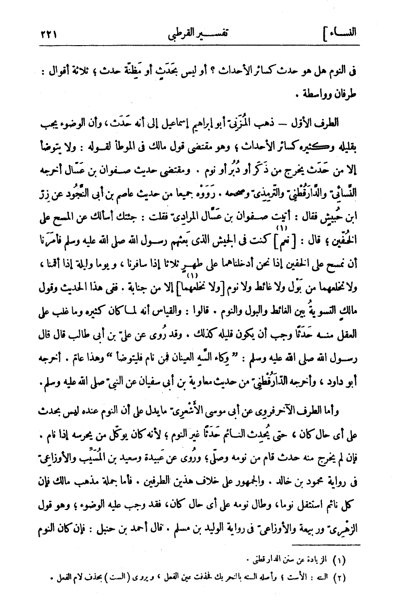 في النوم هل حدث كسائر الا حداث؟ أَوْ لَيْسَ بِحَدَثٍ أَوْ مَظِنَّةُ حَدَثٍ، ثَلَاثَةُ أَقْوَالٍ: طَرَفَانِ وَوَاسِطَةٌ. الطَّرَفُ الْأَوَّلُ- ذَهَبَ الْمُزَنِيُّ أَبُو إِبْرَاهِيمَ إِسْمَاعِيلُ إِلَى أَنَّهُ حَدَثٌ، وَأَنَّ الوضوء يجب بقليله وكثيره كسائر حداث، وَهُوَ مُقْتَضَى قَوْلِ مَالِكٍ فِي الْمُوَطَّأِ لِقَوْلِهِ: وَلَا يُتَوَضَّأُ إِلَّا مِنْ حَدَثٍ يَخْرُجُ مِنْ ذكر دُبُرٍ أَوْ نَوْمٍ. وَمُقْتَضَى حَدِيثِ صَفْوَانَ بْنِ عَسَّالٍ أَخْرَجَهُ النَّسَائِيُّ وَالدَّارَقُطْنِيُّ وَالتِّرْمِذِيُّ وَصَحَّحَهُ. رَوَوْهُ جَمِيعًا مِنْ حَدِيثِ عَاصِمِ بْنِ أَبِي النَّجُودِ عن زر ابن حُبَيْشٍ فَقَالَ: أَتَيْتُ صَفْوَانَ بْنَ عَسَّالٍ الْمُرَادِيَّ فَقُلْتُ: جِئْتُكَ أَسْأَلُكَ عَنِ الْمَسْحِ عَلَى الْخُفَّيْنِ، قَالَ: [نَعَمْ «١»] كُنْتُ فِي الْجَيْشِ الَّذِي بَعَثَهُمْ رَسُولُ اللَّهِ صَلَّى اللَّهُ عَلَيْهِ وَسَلَّمَ فَأَمَرَنَا أن نمسح على الخفين إذا نحن أدخلنا هما عَلَى طُهْرٍ ثَلَاثًا إِذَا سَافَرْنَا، وَيَوْمًا وَلَيْلَةً إِذَا أَقَمْنَا، وَلَا نَخْلَعْهُمَا مِنْ بَوْلٍ وَلَا غَائِطٍ وَلَا نَوْمٍ [وَلَا نَخْلَعْهُمَا «٢»] إِلَّا مِنْ جَنَابَةٍ. فَفِي هَذَا الْحَدِيثِ وَقَوْلُ مَالِكٍ التَّسْوِيَةُ بَيْنَ الْغَائِطِ وَالْبَوْلِ وَالنَّوْمِ. قَالُوا: وَالْقِيَاسُ أَنَّهُ لَمَّا كَانَ كَثِيرُهُ وَمَا غَلَبَ عَلَى الْعَقْلِ مِنْهُ حَدَثًا وَجَبَ أَنْ يَكُونَ قَلِيلُهُ كَذَلِكَ. وَقَدْ رُوِيَ عَنْ عَلِيِّ بْنِ أَبِي طَالِبٍ قَالَ قَالَ رَسُولُ اللَّهِ صَلَّى اللَّهُ عَلَيْهِ وَسَلَّمَ: (وِكَاءُ السَّهِ «٣» الْعَيْنَانِ فَمَنْ نَامَ فَلْيَتَوَضَّأْ) وَهَذَا عَامٌّ. أَخْرَجَهُ أَبُو دَاوُدَ، وَأَخْرَجَهُ الدَّارَقُطْنِيُّ مِنْ حَدِيثِ مُعَاوِيَةَ بْنِ أَبِي سُفْيَانَ عَنِ النَّبِيِّ صَلَّى اللَّهُ عَلَيْهِ وَسَلَّمَ. وَأَمَّا الطَّرَفُ الْآخَرُ فَرُوِيَ عَنْ أَبِي مُوسَى الْأَشْعَرِيِّ مَا يَدُلُّ عَلَى أَنَّ النَّوْمَ عِنْدَهُ لَيْسَ بِحَدَثٍ عَلَى أَيِّ حَالٍ كَانَ، حَتَّى يُحْدِثَ النَّائِمُ حَدَثًا غَيْرَ النَّوْمِ، لِأَنَّهُ كَانَ يُوَكِّلُ مَنْ يَحْرُسُهُ إِذَا نَامَ. فَإِنْ لَمْ يَخْرُجْ مِنْهُ حَدَثٌ قَامَ مِنْ نَوْمِهِ وَصَلَّى، وَرُوِيَ عَنْ عُبَيْدَةَ وَسَعِيدِ بْنِ الْمُسَيَّبِ وَالْأَوْزَاعِيِّ فِي رِوَايَةِ مَحْمُودِ بْنِ خَالِدٍ. وَالْجُمْهُورُ عَلَى خِلَافِ هَذَيْنَ الطَّرَفَيْنِ. فَأَمَّا جُمْلَةُ مَذْهَبِ مَالِكٍ فَإِنَّ كُلَّ نَائِمٍ اسْتَثْقَلَ نَوْمًا، وَطَالَ نَوْمُهُ عَلَى أَيِّ حَالٍ كَانَ، فَقَدْ وَجَبَ عَلَيْهِ الْوُضُوءُ، وَهُوَ قَوْلُ الزُّهْرِيِّ وَرَبِيعَةُ وَالْأَوْزَاعِيُّ فِي رِوَايَةِ الْوَلِيدِ بْنِ مُسْلِمٍ. قَالَ أَحْمَدُ بْنُ حَنْبَلٍ: فَإِنْ كان النوم