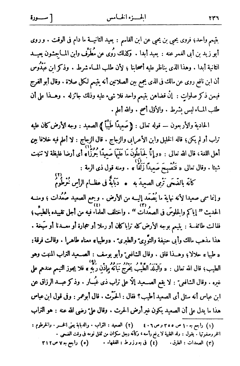 بِتَيَمُّمٍ وَاحِدٍ، فَرَوَى يَحْيَى بْنُ يَحْيَى عَنِ ابْنِ الْقَاسِمِ: يُعِيدُ الثَّانِيةَ مَا دَامَ فِي الْوَقْتِ. وَرَوَى أَبُو زَيْدِ بْنُ أَبِي الْغَمْرِ عَنْهُ: يُعِيدُ أَبَدًا. وَكَذَلِكَ رُوِيَ عَنْ مُطَرِّفٍ وَابْنِ الْمَاجِشُونِ يُعِيدُ الثَّانِيةَ أَبَدًا. وَهَذَا الَّذِي يُنَاظِرُ عَلَيْهِ أَصْحَابُنَا، لِأَنَّ طَلَبَ الْمَاءِ شَرْطٌ. وَذَكَرَ ابْنُ عَبْدُوسٍ أَنَّ ابْنَ نَافِعٍ رَوَى عَنْ مَالِكٍ فِي الَّذِي يَجْمَعُ بَيْنَ الصَّلَاتَيْنِ أَنَّهُ يَتَيَمَّمُ لِكُلِّ صَلَاةٍ. وَقَالَ أَبُو الْفَرَجِ فِيمَنْ ذَكَرَ صَلَوَاتٍ: إِنْ قَضَاهُنَّ بِتَيَمُّمٍ وَاحِدٍ فلا شي عَلَيْهِ وَذَلِكَ جَائِزٌ لَهُ. وَهَذَا عَلَى أَنَّ طَلَبَ الْمَاءِ لَيْسَ بِشَرْطٍ. وَالْأَوَّلُ أَصَحُّ. وَاللَّهُ أَعْلَمُ. الْحَادِيَةُ وَالْأَرْبَعُونَ- قَوْلُهُ تَعَالَى: (صَعِيداً طَيِّباً) الصَّعِيدُ: وَجْهُ الْأَرْضِ كَانَ عَلَيْهِ تُرَابٌ أَوْ لَمْ يَكُنْ، قَالَهُ الْخَلِيلُ وَابْنُ الْأَعْرَابِيِّ وَالزَّجَّاجُ. قَالَ الزَّجَّاجُ: لَا أَعْلَمُ فِيهِ خِلَافًا بَيْنَ أَهْلِ اللُّغَةِ، قَالَ اللَّهُ تَعَالَى: (وَإِنَّا لَجاعِلُونَ مَا عَلَيْها صَعِيداً جُرُزاً «١») أَيْ أَرْضًا غَلِيظَةً لَا تُنْبِتُ شَيْئًا. وَقَالَ تَعَالَى (فَتُصْبِحَ صَعِيداً زَلَقاً «٢»). وَمِنْهُ قَوْلُ ذِي الرُّمَّةِ: