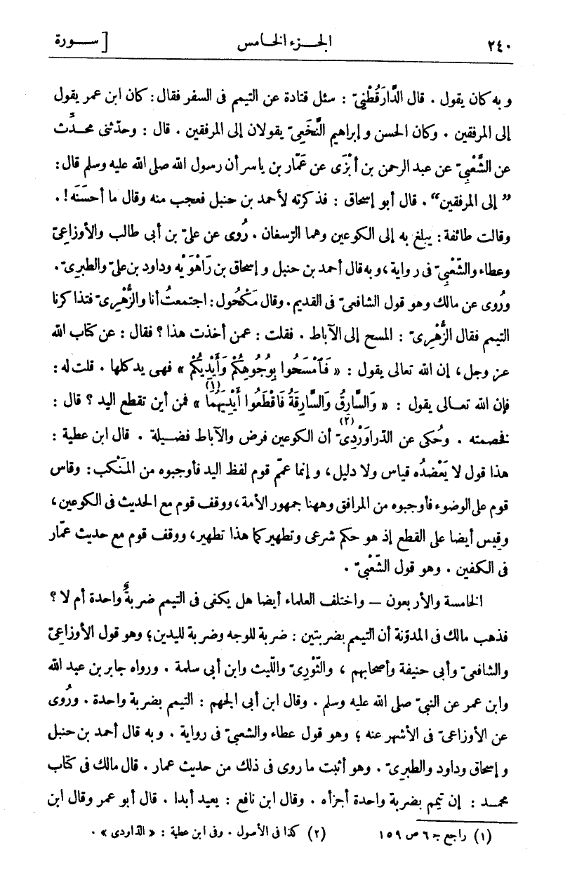 وَبِهِ كَانَ يَقُولُ. قَالَ الدَّارَقُطْنِيُّ: سُئِلَ قَتَادَةُ عَنِ التَّيَمُّمِ فِي السَّفَرِ فَقَالَ: كَانَ ابْنُ عُمَرَ يَقُولُ إِلَى الْمِرْفَقَيْنِ. وَكَانَ الْحَسَنُ وَإِبْرَاهِيمُ النَّخَعِيُّ يَقُولَانِ إِلَى الْمِرْفَقَيْنِ. قَالَ: وَحَدَّثَنِي مُحَدِّثٌ عَنِ الشَّعْبِيِّ عَنْ عَبْدِ الرَّحْمَنِ بْنِ أَبْزَى عَنْ عَمَّارِ بْنِ يَاسِرٍ أَنَّ رَسُولَ اللَّهِ صَلَّى اللَّهُ عَلَيْهِ وَسَلَّمَ قَالَ: (إِلَى الْمِرْفَقَيْنِ). قَالَ أَبُو إِسْحَاقَ: فَذَكَرْتُهُ لِأَحْمَدَ بْنِ حَنْبَلٍ فَعَجِبَ مِنْهُ وَقَالَ مَا أَحْسَنَهُ!. وَقَالَتْ طَائِفَةٌ: يَبْلُغُ بِهِ إِلَى الْكُوعَيْنِ وَهُمَا الرُّسْغَانِ. رُوِيَ عَنْ عَلِيِّ بْنِ أَبِي طَالِبٍ وَالْأَوْزَاعِيِّ وَعَطَاءٍ وَالشَّعْبِيِّ فِي رِوَايَةٍ، وَبِهِ قَالَ أَحْمَدُ بْنُ حَنْبَلٍ وَإِسْحَاقُ بْنُ رَاهَوَيْهِ وَدَاوُدُ بْنُ عَلِيٍّ وَالطَّبَرِيُّ. وَرُوِيَ عَنْ مَالِكٍ وَهُوَ قَوْلُ الشَّافِعِيِّ فِي الْقَدِيمِ. وَقَالَ مَكْحُولٌ: اجْتَمَعْتُ أَنَا وَالزُّهْرِيُّ فَتَذَاكَرْنَا التَّيَمُّمَ فَقَالَ الزُّهْرِيُّ: الْمَسْحُ إِلَى الْآبَاطِ. فَقُلْتُ: عَمَّنْ أَخَذْتَ هَذَا؟ فَقَالَ: عَنْ كِتَابِ اللَّهِ عَزَّ وَجَلَّ، إِنَّ اللَّهَ تَعَالَى يَقُولُ: (فَامْسَحُوا بِوُجُوهِكُمْ وَأَيْدِيكُمْ) فَهِيَ يَدٌ كُلُّهَا. قُلْتُ لَهُ: فَإِنَّ اللَّهَ تَعَالَى يَقُولُ: (وَالسَّارِقُ وَالسَّارِقَةُ فَاقْطَعُوا أَيْدِيَهُما «١») فَمِنْ أَيْنَ تُقْطَعُ الْيَدُ؟ قَالَ: فَخَصَمْتُهُ. وَحُكِيَ عَنِ الدَّرَاوَرْدِيِّ «٢» أَنَّ الْكُوعَيْنِ فَرْضٌ وَالْآبَاطُ فَضِيلَةٌ. قَالَ ابْنُ عَطِيَّةَ: هَذَا قَوْلٌ لَا يُعَضِّدُهُ قِيَاسٌ وَلَا دَلِيلٌ، وَإِنَّمَا عَمَّمَ قَوْمٌ لَفْظَ الْيَدِ فَأَوْجَبُوهُ مِنَ الْمَنْكِبِ: وَقَاسَ قَوْمٌ عَلَى الْوُضُوءِ فَأَوْجَبُوهُ مِنَ الْمَرَافِقِ وَهَاهُنَا جُمْهُورُ الْأُمَّةِ، وَوَقَفَ قَوْمٌ مَعَ الْحَدِيثِ فِي الْكُوعَيْنِ، وَقِيسَ أَيْضًا عَلَى الْقَطْعِ إِذْ هُوَ حُكْمٌ شَرْعِيٌّ وَتَطْهِيرٌ كَمَا هَذَا تَطْهِيرٌ، وَوَقَفَ قَوْمٌ مَعَ حَدِيثِ عَمَّارٍ فِي الْكَفَّيْنِ. وَهُوَ قَوْلُ الشَّعْبِيِّ. الْخَامِسَةُ وَالْأَرْبَعُونَ- وَاخْتَلَفَ الْعُلَمَاءُ أَيْضًا هَلْ يَكْفِي فِي التَّيَمُّمِ ضَرْبَةٌ وَاحِدَةٌ أَمْ لَا؟ فَذَهَبَ مَالِكٌ فِي الْمُدَوَّنَةِ أَنَّ التَّيَمُّمَ بِضَرْبَتَيْنِ: ضَرْبَةٌ لِلْوَجْهِ وَضَرْبَةٌ لِلْيَدَيْنِ، وَهُوَ قَوْلُ الْأَوْزَاعِيِّ وَالشَّافِعِيِّ وَأَبِي حَنِيفَةَ وَأَصْحَابِهِمْ، وَالثَّوْرِيِّ وَاللَّيْثِ وَابْنِ أَبِي سَلَمَةَ. وَرَوَاهُ جَابِرُ بْنُ عَبْدِ اللَّهِ وَابْنُ عُمَرَ عَنِ النَّبِيِّ صَلَّى اللَّهُ عَلَيْهِ وَسَلَّمَ. وَقَالَ ابْنُ أَبِي الْجَهْمِ: التَّيَمُّمُ بِضَرْبَةٍ وَاحِدَةٍ. وَرُوِيَ عَنِ الْأَوْزَاعِيِّ فِي الْأَشْهَرِ عَنْهُ، وَهُوَ قَوْلُ عَطَاءٍ وَالشَّعْبِيِّ فِي رِوَايَةٍ. وَبِهِ قَالَ أَحْمَدُ بْنُ حَنْبَلٍ وَإِسْحَاقُ وَدَاوُدُ وَالطَّبَرِيُّ. وَهُوَ أَثْبَتُ مَا رُوِيَ فِي ذَلِكَ مِنْ حَدِيثِ عَمَّارٍ. قَالَ مَالِكٌ فِي كِتَابِ مُحَمَّدٍ: إِنْ تَيَمَّمَ بِضَرْبَةٍ وَاحِدَةٍ أَجْزَأَهُ. وَقَالَ ابْنُ نَافِعٍ: يُعِيدُ أَبَدًا. قَالَ أَبُو عُمَرَ وقال ابن