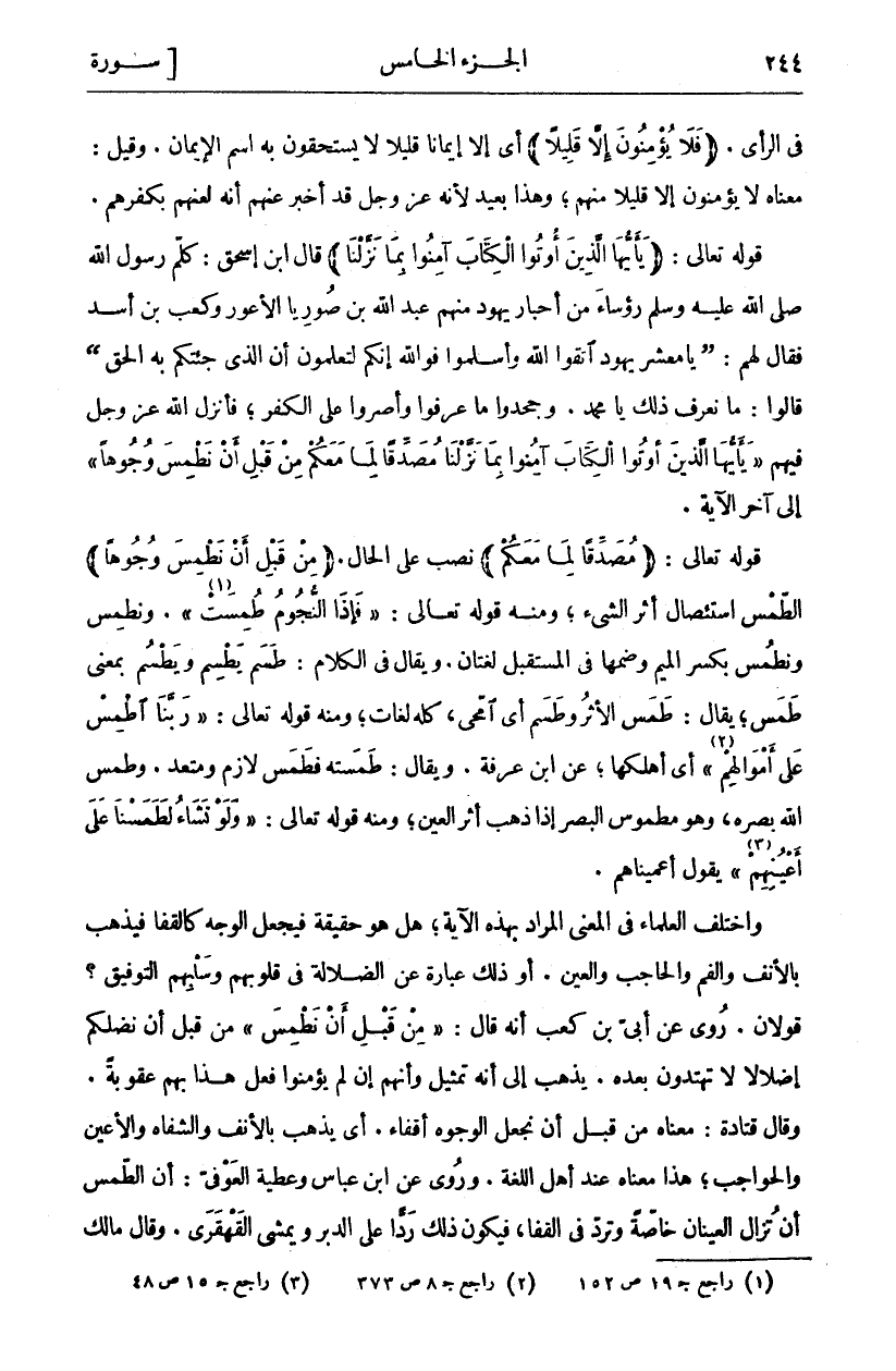 فِي الرَّأْيِ (فَلا يُؤْمِنُونَ إِلَّا قَلِيلًا) أَيْ إِلَّا إِيمَانًا قَلِيلًا لَا يَسْتَحِقُّونَ بِهِ اسْمَ الْإِيمَانِ. وَقِيلَ: مَعْنَاهُ لَا يُؤْمِنُونَ إِلَّا قَلِيلًا مِنْهُمْ، وَهَذَا بَعِيدٌ لِأَنَّهُ عَزَّ وَجَلَّ قَدْ أخبر عنهم أنه لعنهم بكفرهم. قَوْلُهُ تَعَالَى: (يَا أَيُّهَا الَّذِينَ أُوتُوا الْكِتابَ آمِنُوا بِما نَزَّلْنا) قَالَ ابْنُ إِسْحَاقَ: كَلَّمَ رَسُولُ اللَّهِ صَلَّى اللَّهُ عَلَيْهِ وَسَلَّمَ رُؤَسَاءً مِنْ أَحْبَارِ يَهُودَ مِنْهُمْ عَبْدُ اللَّهِ بْنُ صُورِيَّا الْأَعْوَرُ وَكَعْبُ بْنُ أَسَدٍ فَقَالَ لَهُمْ: (يا معشر يهود اتقوا الله وأسلموا فو الله إِنَّكُمْ لَتَعْلَمُونَ أَنَّ الَّذِي جِئْتُكُمْ بِهِ الْحَقُّ) قَالُوا: مَا نَعْرِفُ ذَلِكَ يَا مُحَمَّدُ. وَجَحَدُوا مَا عَرَفُوا وَأَصَرُّوا عَلَى الْكُفْرِ، فَأَنْزَلَ اللَّهُ عَزَّ وَجَلَّ فِيهِمْ (يَا أَيُّهَا الَّذِينَ أُوتُوا الْكِتابَ آمِنُوا بِما نَزَّلْنا مُصَدِّقاً لِما مَعَكُمْ مِنْ قَبْلِ أَنْ نَطْمِسَ وُجُوهاً) إِلَى آخِرِ الآية. (مُصَدِّقاً لِما مَعَكُمْ) نَصْبٌ عَلَى الْحَالِ. (مِنْ قَبْلِ أَنْ نَطْمِسَ وُجُوهاً) الطَّمْسُ اسْتِئْصَالُ أَثَرِ الشَّيْءِ، وَمِنْهُ قَوْلُهُ تَعَالَى: (فَإِذَا النُّجُومُ طُمِسَتْ «١»). وَنَطْمِسُ وَنَطْمُسُ بِكَسْرِ الْمِيمِ وَضَمِّهَا فِي الْمُسْتَقْبَلِ لُغَتَانِ. وَيُقَالُ فِي الْكَلَامِ: طَسَمَ يَطْسِمُ وَيَطْسُمُ بِمَعْنَى طَمَسَ، يُقَالُ: طَمَسَ الْأَثَرَ وَطَسَمَ أَيِ امَّحَى، كُلُّهُ لُغَاتٌ، وَمِنْهُ قَوْلُهُ تَعَالَى: (رَبَّنَا اطْمِسْ عَلى أَمْوالِهِمْ «٢») أَيْ أَهْلِكْهَا، عَنِ ابْنِ عَرَفَةَ. وَيُقَالُ: طَمَسْتُهُ فَطَمَسَ لَازِمٌ وَمُتَعَدٍّ. وَطَمَسَ اللَّهُ بَصَرَهُ، وَهُوَ مَطْمُوسُ الْبَصَرِ إِذَا ذَهَبَ أَثَرُ الْعَيْنِ، وَمِنْهُ قَوْلُهُ تَعَالَى: (وَلَوْ نَشاءُ لَطَمَسْنا عَلى أَعْيُنِهِمْ «٣») يَقُولُ أَعْمَيْنَاهُمْ. وَاخْتَلَفَ الْعُلَمَاءُ فِي الْمَعْنَى الْمُرَادِ بِهَذِهِ الْآيَةِ، هَلْ هُوَ حَقِيقَةٌ فَيُجْعَلُ الْوَجْهُ كَالْقَفَا فَيَذْهَبُ بِالْأَنْفِ وَالْفَمِ والحاجب والعين. أو ذلك عبارة عن الضلالة فِي قُلُوبِهِمْ وَسَلْبِهِمُ التَّوْفِيقَ؟ قَوْلَانِ. رُوِيَ عَنْ أُبَيِّ بْنِ كَعْبٍ أَنَّهُ قَالَ: (مِنْ قَبْلِ أَنْ نَطْمِسَ) مِنْ قَبْلِ أَنْ نُضِلَّكُمْ إِضْلَالًا لَا تَهْتَدُونَ بَعْدَهُ. يَذْهَبُ إِلَى أَنَّهُ تَمْثِيلٌ وَأَنَّهُمْ إِنْ لَمْ يُؤْمِنُوا فَعَلَ هَذَا بِهِمْ عُقُوبَةً. وَقَالَ قَتَادَةُ: مَعْنَاهُ مِنْ قَبْلِ أَنْ نَجْعَلَ الْوُجُوهَ أَقْفَاءً. أَيْ يَذْهَبُ بِالْأَنْفِ وَالشِّفَاهِ وَالْأَعْيُنِ وَالْحَوَاجِبِ، هَذَا مَعْنَاهُ عِنْدَ أَهْلِ اللُّغَةِ. وَرُوِيَ عَنِ ابْنِ عَبَّاسٍ وَعَطِيَّةَ الْعَوْفِيِّ: أَنَّ الطَّمْسَ أَنْ تُزَالَ الْعَيْنَانِ خَاصَّةً وَتُرَدَّ فِي الْقَفَا، فَيَكُونُ ذَلِكَ رَدًّا عَلَى الدُّبُرِ وَيَمْشِي القهقرى. وقال مالك