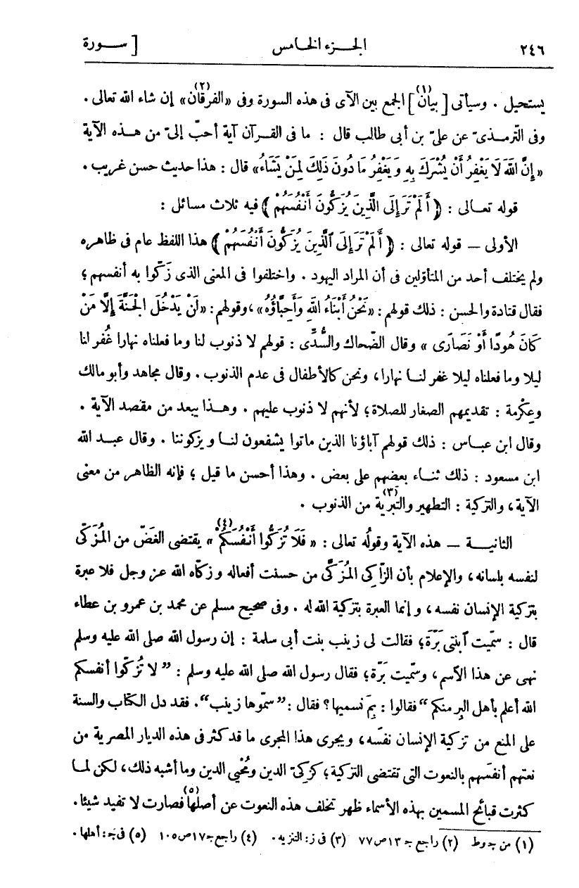 يَسْتَحِيلُ. وَسَيَأْتِي [بَيَانُ «١»] الْجَمْعِ بَيْنَ الْآيِ فِي هَذِهِ السُّورَةِ وَفِي (الْفُرْقَانِ «٢») إِنْ شَاءَ اللَّهُ تَعَالَى. وَفِي التِّرْمِذِيِّ عَنْ عَلِيِّ بْنِ أَبِي طَالِبٍ قَالَ: مَا فِي الْقُرْآنِ آيَةٌ أَحَبُّ إِلَيَّ مِنْ هَذِهِ الْآيَةِ (إِنَّ اللَّهَ لَا يَغْفِرُ أَنْ يُشْرَكَ بِهِ وَيَغْفِرُ مَا دُونَ ذلِكَ لِمَنْ يَشاءُ) قَالَ: هَذَا حَدِيثٌ حَسَنٌ غَرِيبٌ. قَوْلُهُ تَعَالَى: (أَلَمْ تَرَ إِلَى الَّذِينَ يُزَكُّونَ أَنْفُسَهُمْ) فِيهِ ثَلَاثُ مَسَائِلَ: الْأُولَى- قَوْلُهُ تَعَالَى: (أَلَمْ تَرَ إِلَى الَّذِينَ يُزَكُّونَ أَنْفُسَهُمْ) هَذَا اللَّفْظُ عَامٌّ فِي ظَاهِرِهِ وَلَمْ يَخْتَلِفْ أَحَدٌ مِنَ الْمُتَأَوِّلِينَ فِي أَنَّ الْمُرَادَ الْيَهُودُ. وَاخْتَلَفُوا فِي الْمَعْنَى الَّذِي زَكُّوا بِهِ أَنْفُسَهُمْ، فَقَالَ قَتَادَةُ وَالْحَسَنُ: ذَلِكَ قَوْلُهُمْ: (نَحْنُ أَبْناءُ اللَّهِ وَأَحِبَّاؤُهُ)، وَقَوْلُهُمْ: (لَنْ يَدْخُلَ الْجَنَّةَ إِلَّا مَنْ كانَ هُوداً أَوْ نَصارى) وَقَالَ الضَّحَّاكُ وَالسُّدِّيُّ: قَوْلُهُمْ لَا ذُنُوبَ لَنَا وَمَا فَعَلْنَاهُ نَهَارًا غُفِرَ لَنَا لَيْلًا وَمَا فَعَلْنَاهُ لَيْلًا غُفِرَ لَنَا نَهَارًا، وَنَحْنُ كَالْأَطْفَالِ فِي عَدَمِ الذُّنُوبِ. وَقَالَ مُجَاهِدٌ وَأَبُو مَالِكٍ وَعِكْرِمَةُ: تَقْدِيمُهُمُ الصِّغَارَ لِلصَّلَاةِ، لِأَنَّهُمْ لَا ذُنُوبَ عَلَيْهِمْ. وَهَذَا يَبْعُدُ مِنْ مَقْصِدِ الْآيَةِ. وَقَالَ ابْنُ عَبَّاسٍ: ذَلِكَ قَوْلُهُمْ آبَاؤُنَا الَّذِينَ مَاتُوا يَشْفَعُونَ لَنَا ويزكوننا. وقال عبد الله ابن مَسْعُودٍ: ذَلِكَ ثَنَاءُ بَعْضِهِمْ عَلَى بَعْضٍ. وَهَذَا أَحْسَنُ مَا قِيلَ، فَإِنَّهُ الظَّاهِرُ مِنْ مَعْنَى الْآيَةِ، وَالتَّزْكِيَةُ: التَّطْهِيرُ وَالتَّبْرِيَةُ «٣» مِنَ الذُّنُوبِ. الثَّانِيةُ: هَذِهِ الْآيَةُ وَقَوْلُهُ تَعَالَى: (فَلا تُزَكُّوا أَنْفُسَكُمْ «٤») يَقْتَضِي الْغَضَّ مِنَ الْمُزَكِّي لِنَفْسِهِ بِلِسَانِهِ، وَالْإِعْلَامَ بِأَنَّ الزَّاكِيَ الْمُزَكَّى مَنْ حَسُنَتْ أَفْعَالُهُ وَزَكَّاهُ اللَّهُ عَزَّ وَجَلَّ فَلَا عِبْرَةَ بِتَزْكِيَةِ الْإِنْسَانِ نَفْسَهُ، وَإِنَّمَا الْعِبْرَةُ بِتَزْكِيَةِ اللَّهِ لَهُ. وَفِي صَحِيحِ مُسْلِمٍ عَنْ مُحَمَّدِ بْنِ عَمْرِو بْنِ عَطَاءٍ قَالَ: سَمَّيْتُ ابْنَتِي بَرَّةَ، فَقَالَتْ لِي زَيْنَبُ بِنْتُ أَبِي سَلَمَةَ: أَنَّ رَسُولَ اللَّهِ صَلَّى اللَّهُ عَلَيْهِ وَسَلَّمَ نَهَى عَنْ هَذَا الِاسْمِ، وَسَمَّيْتُ بَرَّةَ، فَقَالَ رَسُولُ اللَّهِ صَلَّى اللَّهُ عَلَيْهِ وَسَلَّمَ: (لَا تُزَكُّوا أَنْفُسَكُمُ اللَّهُ أَعْلَمُ بِأَهْلِ الْبِرِّ مِنْكُمْ) فَقَالُوا: بِمَ نُسَمِّيهَا؟ فَقَالَ: (سَمُّوهَا زَيْنَبَ). فَقَدْ دَلَّ الْكِتَابُ وَالسُّنَّةُ عَلَى الْمَنْعِ مِنْ تَزْكِيَةِ الْإِنْسَانِ نَفْسَهُ، وَيَجْرِي هَذَا الْمَجْرَى مَا قَدْ كَثُرَ فِي هَذِهِ الدِّيَارِ الْمِصْرِيَّةِ مِنْ نَعْتِهِمْ أَنْفُسَهُمْ بِالنُّعُوتِ الَّتِي تقتضي التزكية، كزكي الدين ومحي الدِّينِ وَمَا أَشْبَهَ ذَلِكَ، لَكِنْ لَمَّا كَثُرَتْ قَبَائِحُ الْمُسَمَّيْنَ بِهَذِهِ الْأَسْمَاءِ ظَهَرَ تَخَلُّفُ هَذِهِ النُّعُوتِ عَنْ أَصْلِهَا «٥» فَصَارَتْ لَا تُفِيدُ شَيْئًا.