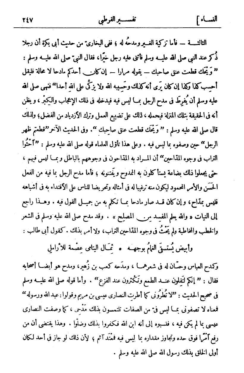 وَكَمَدْحِ الْعَبَّاسِ وَحَسَّانَ لَهُ فِي شِعْرِهِمَا، وَمَدَحَهُ كَعْبُ بْنُ زُهَيْرٍ، وَمَدَحَ هُوَ أَيْضًا أَصْحَابَهُ فَقَالَ: (إِنَّكُمْ لَتَقِلُّونَ عِنْدَ الطَّمَعِ وَتَكْثُرُونَ عِنْدَ الْفَزَعِ). وَأَمَّا قَوْلُهُ صَلَّى اللَّهُ عَلَيْهِ وَسَلَّمَ فِي صَحِيحِ الْحَدِيثِ: (لا تطروني كما أطرت النصارى عيسى بن مَرْيَمَ وَقُولُوا: عَبْدُ اللَّهِ وَرَسُولُهُ) فَمَعْنَاهُ لَا تَصِفُونِي بِمَا لَيْسَ فِيَّ مِنَ الصِّفَاتِ تَلْتَمِسُونَ بِذَلِكَ مَدْحِي، كَمَا وَصَفَتِ النَّصَارَى عِيسَى بِمَا لَمْ يَكُنْ فِيهِ، فَنَسَبُوهُ إِلَى أَنَّهُ ابْنُ اللَّهِ فَكَفَرُوا بِذَلِكَ وَضَلُّوا. وَهَذَا يَقْتَضِي أَنَّ مَنْ رَفَعَ امْرَأً فَوْقَ حَدِّهِ وَتَجَاوَزَ مِقْدَارَهُ بِمَا لَيْسَ فِيهِ فَمُعْتَدٍ آثِمٌ، لِأَنَّ ذَلِكَ لَوْ جَازَ فِي أَحَدٍ لَكَانَ أَوْلَى الْخَلْقِ بِذَلِكَ رَسُولُ اللَّهِ صَلَّى اللَّهُ عَلَيْهِ وَسَلَّمَ.