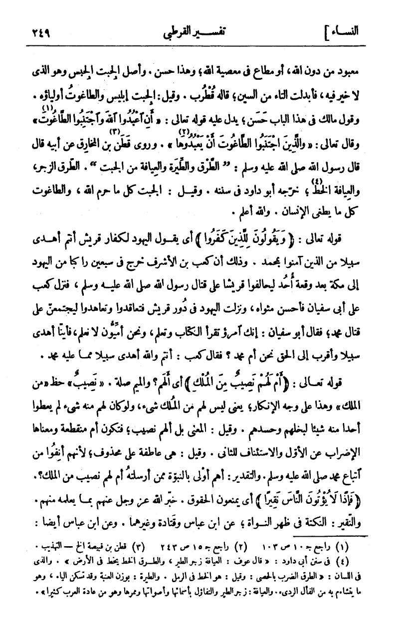 مَعْبُودٍ مِنْ دُونِ اللَّهِ، أَوْ مُطَاعٍ فِي مَعْصِيَةِ اللَّهِ، وَهَذَا حَسَنٌ. وَأَصْلُ الْجِبْتِ الْجِبْسُ وَهُوَ الَّذِي لَا خَيْرَ فِيهِ، فَأُبْدِلَتِ التَّاءُ مِنَ السِّينِ، قَالَهُ قُطْرُبُ. وَقِيلَ: الْجِبْتُ إِبْلِيسُ وَالطَّاغُوتُ أَوْلِيَاؤُهُ. وَقَوْلُ مَالِكٍ فِي هَذَا الْبَابِ حَسَنٌ، يَدُلُّ عَلَيْهِ قَوْلُهُ تَعَالَى: (أَنِ اعْبُدُوا اللَّهَ وَاجْتَنِبُوا الطَّاغُوتَ «١») وَقَالَ تَعَالَى: (وَالَّذِينَ اجْتَنَبُوا الطَّاغُوتَ أَنْ يَعْبُدُوها «٢»). وَرَوَى قَطَنُ «٣» بْنُ الْمُخَارِقِ عَنْ أَبِيهِ قَالَ قَالَ رَسُولُ اللَّهِ صَلَّى اللَّهُ عَلَيْهِ وَسَلَّمَ: (الطَّرْقُ وَالطِّيَرَةُ وَالْعِيَافَةُ مِنَ الْجِبْتِ). الطَّرْقُ الزَّجْرُ، وَالْعِيَافَةُ الْخَطُّ «٤»، خَرَّجَهُ أَبُو دَاوُدَ فِي سُنَنِهِ. وَقِيلَ: الْجِبْتُ كُلُّ مَا حرم الله، والطاغوت كُلُّ مَا يُطْغِي الْإِنْسَانَ. وَاللَّهُ أَعْلَمُ. قَوْلُهُ تَعَالَى: (وَيَقُولُونَ لِلَّذِينَ كَفَرُوا) أَيْ يَقُولُ الْيَهُودُ لِكُفَّارِ قُرَيْشٍ أَنْتُمْ أَهْدَى سَبِيلًا مِنَ الَّذِينَ آمَنُوا بِمُحَمَّدٍ. وَذَلِكَ أَنَّ كَعْبَ بْنَ الْأَشْرَفِ خَرَجَ فِي سَبْعِينَ رَاكِبًا مِنْ الْيَهُودِ إِلَى مَكَّةَ بَعْدَ وَقْعَةِ أُحُدٍ لِيُحَالِفُوا قُرَيْشًا عَلَى قِتَالِ رَسُولِ اللَّهِ صَلَّى اللَّهُ عَلَيْهِ وَسَلَّمَ، فَنَزَلَ كَعْبٌ عَلَى أَبِي سُفْيَانَ فَأَحْسَنَ مَثْوَاهُ، وَنَزَلَتِ الْيَهُودُ فِي دُورِ قُرَيْشٍ فَتَعَاقَدُوا وَتَعَاهَدُوا لَيَجْتَمِعُنَّ عَلَى قِتَالِ مُحَمَّدٍ، فَقَالَ أَبُو سُفْيَانَ: إِنَّكَ امْرُؤٌ تَقْرَأُ الْكِتَابَ وَتَعْلَمُ، وَنَحْنُ أُمِّيُّونَ لَا نَعْلَمُ، فَأَيُّنَا أَهْدَى سَبِيلًا وَأَقْرَبُ إِلَى الْحَقِّ نَحْنُ أَمْ مُحَمَّدٌ؟ فَقَالَ كَعْبٌ: أَنْتُمْ وَاللَّهِ أَهْدَى سَبِيلًا مِمَّا عَلَيْهِ مُحَمَّدٌ. قَوْلُهُ تَعَالَى: (أَمْ لَهُمْ نَصِيبٌ مِنَ الْمُلْكِ) أَيْ أَلَهُمْ؟ وَالْمِيمُ صِلَةٌ. (نَصِيبٌ) حَظٌّ (مِنَ الْمُلْكِ) وَهَذَا عَلَى وَجْهِ الْإِنْكَارِ، يَعْنِي لَيْسَ لَهُمْ من الملك شي، ولو كان لهم منه شي لَمْ يُعْطُوا أَحَدًا مِنْهُ شَيْئًا لِبُخْلِهِمْ وَحَسَدِهِمْ. وَقِيلَ: الْمَعْنَى بَلْ أَلَهُمْ نَصِيبٌ، فَتَكُونُ أَمْ مُنْقَطِعَةٌ وَمَعْنَاهَا الْإِضْرَابُ عَنِ الْأَوَّلِ وَالِاسْتِئْنَافُ لِلثَّانِي. وَقِيلَ: هِيَ عَاطِفَةٌ عَلَى مَحْذُوفٍ، لِأَنَّهُمْ أَنِفُوا مِنَ اتِّبَاعِ مُحَمَّدٍ صَلَّى اللَّهُ عَلَيْهِ وَسَلَّمَ. وَالتَّقْدِيرُ: أَهُمْ أَوْلَى بِالنُّبُوَّةِ مِمَّنْ أَرْسَلْتُهُ أَمْ لَهُمْ نَصِيبٌ مِنَ الْمُلْكِ؟. (فَإِذاً لَا يُؤْتُونَ النَّاسَ نَقِيراً) أَيْ يَمْنَعُونَ الْحُقُوقَ. خَبَّرَ اللَّهُ عَزَّ وَجَلَّ عَنْهُمْ بِمَا يَعْلَمُهُ مِنْهُمْ. وَالنَّقِيرُ: النُّكْتَةُ فِي ظَهْرِ النَّوَاةِ، عَنِ ابْنِ عَبَّاسٍ وقتادة وغيرهما. وعن ابن عباس أيضا: