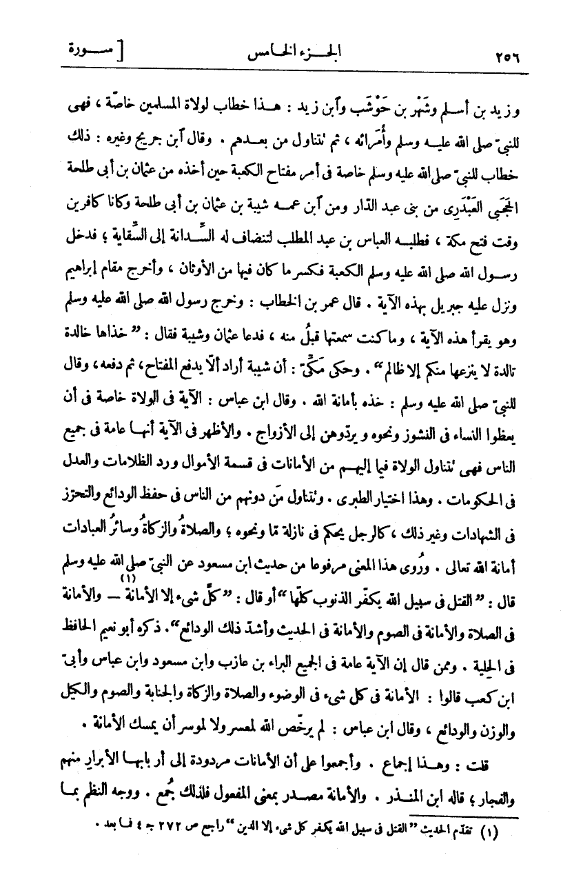 وَزَيْدُ بْنُ أَسْلَمَ وَشَهْرُ بْنُ حَوْشَبٍ وَابْنُ زَيْدٍ: هَذَا خِطَابٌ لِوُلَاةِ الْمُسْلِمِينَ خَاصَّةً، فَهِيَ لِلنَّبِيِّ صَلَّى اللَّهُ عَلَيْهِ وَسَلَّمَ وَأُمَرَائِهِ، ثُمَّ تَتَنَاوَلُ مَنْ بَعْدَهُمْ. وَقَالَ ابْنُ جُرَيْجٍ وَغَيْرُهُ: ذَلِكَ خِطَابٌ لِلنَّبِيِّ صَلَّى اللَّهُ عَلَيْهِ وَسَلَّمَ خَاصَّةً فِي أَمْرِ مِفْتَاحِ الْكَعْبَةِ حِينَ أَخَذَهُ مِنْ عُثْمَانَ بْنِ أَبِي طَلْحَةَ الْحَجَبِيِّ الْعَبْدَرِيِّ مِنْ بَنِي عَبْدِ الدَّارِ وَمِنَ ابْنِ عَمِّهِ شَيْبَةَ بْنِ عُثْمَانَ بْنِ أَبِي طَلْحَةَ وَكَانَا كَافِرَيْنِ وَقْتَ فَتْحِ مَكَّةَ، فَطَلَبَهُ الْعَبَّاسُ بْنُ عَبْدِ الْمُطَّلِبِ لِتَنْضَافَ لَهُ السِّدَانَةُ إِلَى السِّقَايَةِ، فَدَخَلَ رَسُولُ اللَّهِ صَلَّى اللَّهُ عَلَيْهِ وَسَلَّمَ الْكَعْبَةَ فَكَسَرَ مَا كَانَ فِيهَا مِنَ الْأَوْثَانِ، وَأَخْرَجَ مَقَامَ إِبْرَاهِيمَ وَنَزَلَ عَلَيْهِ جِبْرِيلُ بِهَذِهِ الْآيَةِ. قَالَ عُمَرُ بْنُ الْخَطَّابِ: وَخَرَجَ رَسُولُ اللَّهِ صَلَّى اللَّهُ عَلَيْهِ وَسَلَّمَ وَهُوَ يَقْرَأُ هَذِهِ الْآيَةَ، وَمَا كُنْتُ سَمِعْتُهَا قَبْلُ مِنْهُ، فَدَعَا عُثْمَانَ وَشَيْبَةَ فَقَالَ: (خُذَاهَا خَالِدَةً تَالِدَةً لَا يَنْزِعُهَا مِنْكُمْ إِلَّا ظَالِمٌ). وَحَكَى مَكِّيٌّ: أَنَّ شَيْبَةَ أَرَادَ أَلَّا يَدْفَعَ الْمِفْتَاحَ، ثُمَّ دَفَعَهُ، وَقَالَ لِلنَّبِيِّ صَلَّى اللَّهُ عَلَيْهِ وَسَلَّمَ: خُذْهُ بِأَمَانَةِ اللَّهِ. وَقَالَ ابْنُ عَبَّاسٍ: الْآيَةُ فِي الْوُلَاةِ خَاصَّةً فِي أَنْ يَعِظُوا النِّسَاءَ فِي النُّشُوزِ وَنَحْوِهِ وَيَرُدُّوهُنَّ إِلَى الْأَزْوَاجِ. وَالْأَظْهَرُ فِي الْآيَةِ أَنَّهَا عَامَّةٌ فِي جَمِيعِ النَّاسِ فَهِيَ تَتَنَاوَلُ الْوُلَاةَ فِيمَا إِلَيْهِمْ مِنَ الْأَمَانَاتِ فِي قِسْمَةِ الْأَمْوَالِ وَرَدِّ الظُّلَامَاتِ وَالْعَدْلِ فِي الْحُكُومَاتِ. وَهَذَا اخْتِيَارُ الطَّبَرِيِّ. وَتَتَنَاوَلُ مَنْ دُونَهُمْ مِنَ النَّاسِ فِي حِفْظِ الْوَدَائِعِ وَالتَّحَرُّزِ فِي الشَّهَادَاتِ وَغَيْرِ ذَلِكَ، كَالرَّجُلِ يَحْكُمُ فِي نَازِلَةٍ مَا وَنَحْوَهُ، وَالصَّلَاةُ وَالزَّكَاةُ وَسَائِرُ الْعِبَادَاتِ أَمَانَةُ اللَّهِ تَعَالَى. وَرُوِيَ هَذَا الْمَعْنَى مَرْفُوعًا مِنْ حَدِيثِ ابْنِ مَسْعُودٍ عَنِ النَّبِيِّ صَلَّى اللَّهُ عَلَيْهِ وَسَلَّمَ قَالَ: (الْقَتْلُ فِي سَبِيلِ اللَّهِ يكفر الذنوب كلها) أو قال: (كل شي إِلَّا الْأَمَانَةَ «١» - وَالْأَمَانَةُ فِي الصَّلَاةِ وَالْأَمَانَةُ فِي الصَّوْمِ وَالْأَمَانَةُ فِي الْحَدِيثِ وَأَشَدُّ ذَلِكَ الْوَدَائِعُ). ذَكَرَهُ أَبُو نُعَيْمٍ الْحَافِظُ فِي الْحِلْيَةِ. وَمِمَّنْ قَالَ إِنَّ الْآيَةَ عَامَّةٌ فِي الْجَمِيعِ الْبَرَاءُ بْنُ عَازِبٍ وَابْنُ مَسْعُودٍ وَابْنُ عَبَّاسٍ وَأُبَيُّ ابن كعب قالوا: الأمانة في كل شي فِي الْوُضُوءِ وَالصَّلَاةِ وَالزَّكَاةِ وَالْجَنَابَةِ وَالصَّوْمِ وَالْكَيْلِ وَالْوَزْنِ وَالْوَدَائِعِ، وَقَالَ ابْنُ عَبَّاسٍ: لَمْ يُرَخِّصِ اللَّهُ لِمُعْسِرٍ وَلَا لِمُوسِرٍ أَنْ يُمْسِكَ الْأَمَانَةَ. قُلْتُ: وَهَذَا إِجْمَاعٌ. وَأَجْمَعُوا عَلَى أَنَّ الْأَمَانَاتِ مَرْدُودَةٌ إِلَى أَرْبَابِهَا الْأَبْرَارِ مِنْهُمْ وَالْفُجَّارِ، قَالَهُ ابْنُ الْمُنْذِرِ. وَالْأَمَانَةُ مَصْدَرٌ بِمَعْنَى الْمَفْعُولِ فَلِذَلِكَ جمع. ووجه النظم بما