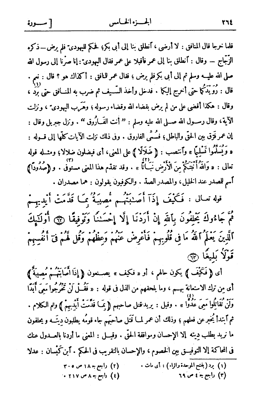 فَلَمَّا خَرَجَا قَالَ الْمُنَافِقُ: لَا أَرْضَى، انْطَلِقْ بِنَا إِلَى أَبِي بَكْرٍ، فَحَكَمَ لِلْيَهُودِيِّ فَلَمْ يَرْضَ- ذَكَرَهُ الزَّجَّاجُ- وَقَالَ: انْطَلِقْ بِنَا إِلَى عُمَرَ فَأَقْبَلَا عَلَى عُمَرَ فَقَالَ الْيَهُودِيُّ: إِنَّا صِرْنَا إِلَى رَسُولِ اللَّهِ صَلَّى اللَّهُ عَلَيْهِ وَسَلَّمَ ثُمَّ إِلَى أَبِي بَكْرٍ فَلَمْ يَرْضَ، فَقَالَ عُمَرُ لِلْمُنَافِقِ: أَكَذَلِكَ هُوَ؟ قَالَ: نَعَمْ. قال: رويد كما حَتَّى أَخْرُجَ إِلَيْكُمَا. فَدَخَلَ وَأَخَذَ السَّيْفَ ثُمَّ ضَرَبَ بِهِ الْمُنَافِقَ حَتَّى بَرَدَ «١»، وَقَالَ: هَكَذَا أَقْضِي عَلَى مَنْ لَمْ يَرْضَ بِقَضَاءِ اللَّهِ وَقَضَاءِ رَسُولِهِ، وَهَرَبَ الْيَهُودِيُّ، وَنَزَلَتِ الْآيَةُ، وَقَالَ رَسُولُ اللَّهِ صَلَّى اللَّهُ عَلَيْهِ وَسَلَّمَ: (أَنْتَ الْفَارُوقُ). وَنَزَلَ جِبْرِيلُ وَقَالَ: إِنَّ عُمَرَ فَرَّقَ بَيْنَ الْحَقِّ وَالْبَاطِلِ، فَسُمِّيَ الْفَارُوقُ. وَفِي ذَلِكَ نَزَلَتِ الْآيَاتُ كُلُّهَا إِلَى قَوْلِهِ: (وَيُسَلِّمُوا تَسْلِيماً) النساء: وَانْتَصَبَ: (ضَلالًا) عَلَى الْمَعْنَى، أَيْ فَيَضِلُّونَ ضَلَالًا، وَمِثْلُهُ قَوْلُهُ تَعَالَى: (وَاللَّهُ أَنْبَتَكُمْ مِنَ الْأَرْضِ نَباتاً «٢»). وقد تقدم هذا المعنى مستوفى «٣». و (صُدُوداً) اسْمٌ لِلْمَصْدَرِ عِنْدَ الْخَلِيلِ، وَالْمَصْدَرُ الصَّدُّ. والكوفيون يقولون: هما مصدران.