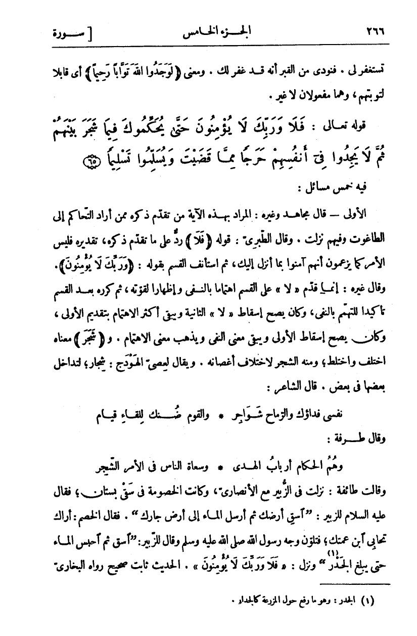 وَقَالَتْ طَائِفَةٌ: نَزَلَتْ فِي الزُّبَيْرِ مَعَ الْأَنْصَارِيِّ، وَكَانَتِ الْخُصُومَةُ فِي سَقْيِ بُسْتَانٍ، فَقَالَ عَلَيْهِ السَّلَامُ لِلزُّبَيْرِ: (اسْقِ أَرْضَكَ ثُمَّ أَرْسِلِ الْمَاءَ إِلَى أَرْضِ جَارِكَ). فَقَالَ الْخَصْمُ: أَرَاكَ تُحَابِي ابْنَ عَمَّتِكَ، فَتَلَوَّنَ وَجْهُ رَسُولِ اللَّهِ صَلَّى اللَّهُ عَلَيْهِ وَسَلَّمَ وَقَالَ لِلزُّبَيْرِ: (اسْقِ ثُمَّ احْبِسِ الْمَاءَ حَتَّى يَبْلُغَ الْجَدْرَ «١») وَنَزَلَ: (فَلا وَرَبِّكَ لَا يُؤْمِنُونَ). الْحَدِيثُ ثَابِتٌ صَحِيحٌ رواه البخاري